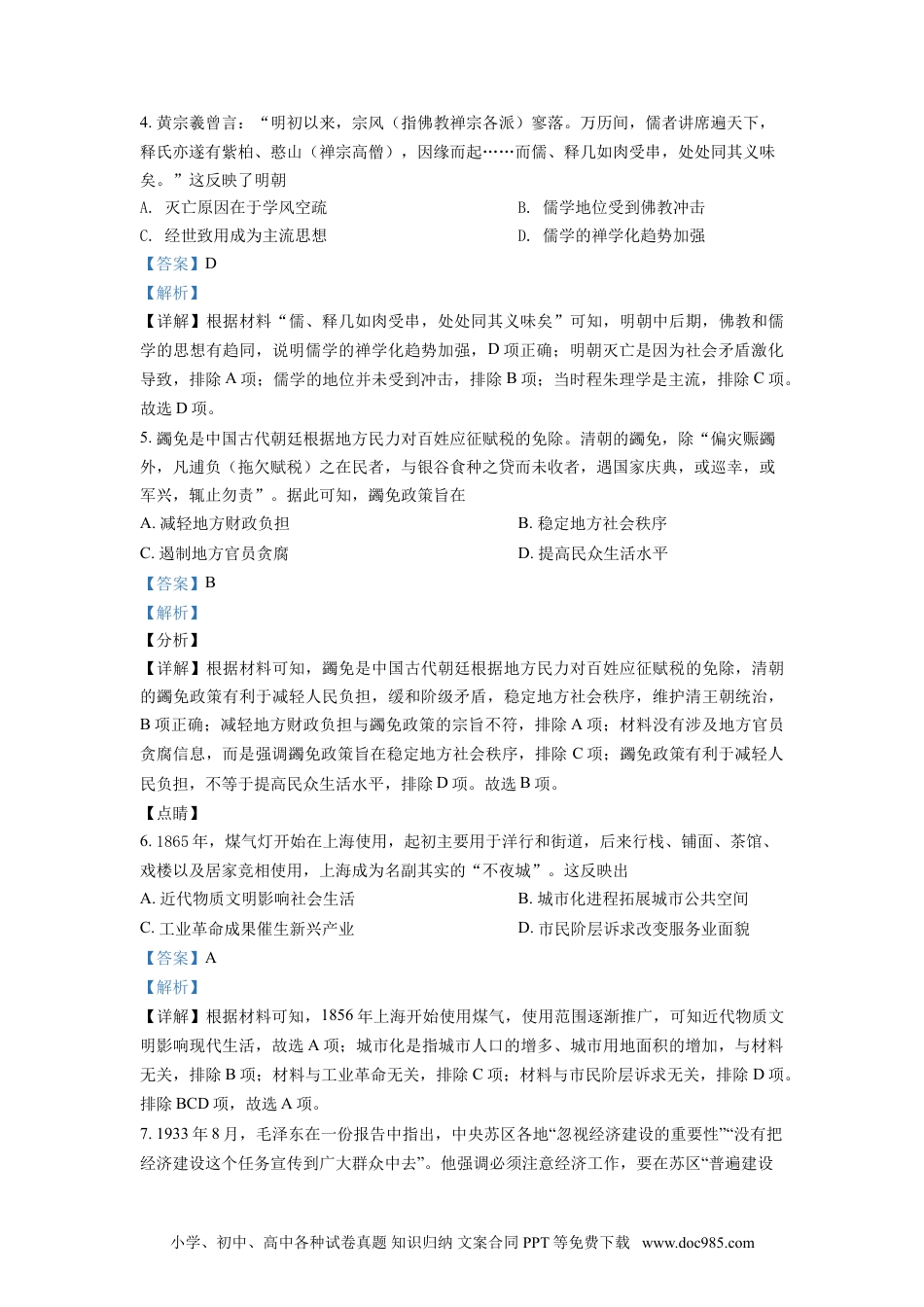 2021年辽宁省普通高等学校招生选择性考试历史一、选择题1.如图为浙江杭州严家桥良渚文化遗址出土的距今约4000年的双钱结藤编残件图。它体现了A.历史传承与民族认同的统B.社会组织的复杂C.劳动技能与艺术审美的结合D.等级秩序的确立【答案】C【解析】【详解】双钱结藤编残件一方面体现了劳动过程中结绳技能,另一方面作为艺术品,具有一定的审美价值,C项正确;历史传承在双钱结藤编残件中无法体现,排除A项;通过双钱结藤编残件无法证实当时社会组织情况,排除B项;题干中没有提及双钱结藤编的使用群体,无法得出社会等级秩序确立的结论,排除D项。故选C项。2.东汉后期,世家大族日益重视家谱、别录、私传的修撰,“赞贤圣之后,班族类之祖,言氏姓之出”,如《崔氏家传》《李膺家录》等。这一做法的实质是A.加强道德修养B.追求政治利益C.辨别大宗小宗D.维护经济特权【答案】B【解析】【详解】东汉后期,世家大族崛起,注重家谱、别录、私传的修撰,强调门第,其本质是为了追求政治上的垄断,维护自己的政治利益,B项正确;修家谱并未涉及道德修养,排除A项;辨别大小宗不是实质,排除C项;家谱、别录、私传的修撰与经济特权无关,排除D项。故选B项。3.唐朝要求弘文馆生、崇文馆生研习经史须用官方正音“读文精熟”;科举考试须使用官方颁布的韵书;吏部将“言辞辩正”作为铨选四项标准之一。这些规定有利于A.文化交流B.扩大选官基础C.澄清吏治D.推动方言传播【答案】A【解析】【详解】根据材料“用官方正音‘读文精熟’”、“使用官方颁布的韵书”、“将‘言辞辩正’作为铨选四项标准之一”等信息可知,这些规定有利于文化交流发展,A项正确;科举制有利于扩大选官基础,排除B项;材料与吏治现象无关,排除C项;材料中强调使用官方语言,不是推动方言传播,排除D项。故选A项。小学、初中、高中各种试卷真题知识归纳文案合同PPT等免费下载www.doc985.com4.黄宗羲曾言:“明初以来,宗风(指佛教禅宗各派)寥落。万历间,儒者讲席遍天下,释氏亦遂有紫柏、憨山(禅宗高僧),因缘而起……而儒、释几如肉受串,处处同其义味矣。”这反映了明朝A.灭亡原因在于学风空疏B.儒学地位受到佛教冲击C.经世致用成为主流思想D.儒学的禅学化趋势加强【答案】D【解析】【详解】根据材料“儒、释几如肉受串,处处同其义味矣”可知,明朝中后期,佛教和儒学的思想有趋同,说明儒学的禅学化趋势加强,D项正确;明朝灭亡是因为社会矛盾激化导致,排除A项;儒学的地位并未受到冲击,排除B项;当时程朱理学是主流,排除C项。故选D项。5.蠲免是中国古代朝廷根据地方民力对百姓应征赋税的免除。清朝的蠲免,除“偏灾赈蠲外,凡逋负(拖欠赋税)之在民者,与银谷食种之贷而未收者,遇国家庆典,或巡幸,或军兴,辄止勿责”。据此可知,蠲免政策旨在A.减轻地方财政负担B.稳定地方社会秩序C.遏制地方官员贪腐D.提高民众生活水平【答案】B【解析】【分析】【详解】根据材料可知,蠲免是中国古代朝廷根据地方民力对百姓应征赋税的免除,清朝的蠲免政策有利于减轻人民负担,缓和阶级矛盾,稳定地方社会秩序,维护清王朝统治,B项正确;减轻地方财政负担与蠲免政策的宗旨不符,排除A项;材料没有涉及地方官员贪腐信息,而是强调蠲免政策旨在稳定地方社会秩序,排除C项;蠲免政策有利于减轻人民负担,不等于提高民众生活水平,排除D项。故选B项。【点睛】6.1865年,煤气灯开始在上海使用,起初主要用于洋行和街道,后来行栈、铺面、茶馆、戏楼以及居家竞相使用,上海成为名副其实的“不夜城”。这反映出A.近代物质文明影响社会生活B.城市化进程拓展城市公共空间C.工业革命成果催生新兴产业D.市民阶层诉求改变服务业面貌【答案】A【解析】【详解】根据材料可知,1856年上海开始使用煤气,使用范围逐渐推广,可知近代物质文明影响现代生活,故选A项;城市化是指城市人口的增多、城市用地面积的增加,与材料无关,排除B项;材料与工业革命无关,排除C项;材料与市民阶层诉求无关,排除D项。排除BCD项,故选A项。7.1933年8月,毛泽东在一份报告中指出,中央苏区各地“忽视经济建设的重要性”“没有把经济建设这个任务...