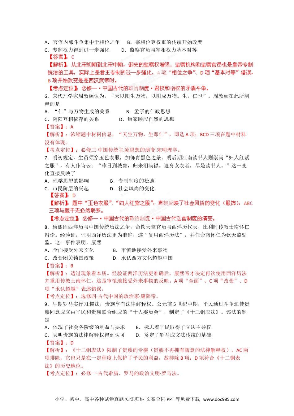 【总评】:2012年高考单科历史海南卷,纯文字试题,没有图文材料,选择题中材料型试题偏多,注重考查学生的阅读、理解、归纳、对比等能力。非选择题部分,必答题较为基础,选答题出题范围较广。第I卷本卷共25个小题,每小题2分,在每小题给出的四个选项中,只有一项是符合题目要求的。1.《礼记•月令》载,每年正月周天子亲率臣下耕作,称为“藉田”;三月王后亲率嫔妃举行采桑养蚕仪式,称为“亲蚕”。后来,历代皇帝、皇后不断举行这样的仪式。这反映了A.周代制度在后代被严格奉行B.古代政治制度变迁异常缓慢C.重农抑商从周代始一直推行D.农桑是古代社会经济的主体2.儒家经典强调:“上好礼,则民莫敢不敬;上好义,则民莫敢不服;上好信,则民莫敢不用情。”这段话体现的是A.民本思想B.仁政思想C.礼法并重D.礼治为先【答案】:B【解析】:同时强调“礼(等级秩序)、义(仁义)、信(诚信)”的只能是儒家思想,而儒家思想的核心即是“仁”,ACD三项都不能明确而直接地体现这一核心。【考点定位】:必修三·中国传统主流思想的演变·百家争鸣。3.秦灭六国后,秦王赢政兼采古史及传说中的“三皇”、“五帝”之名而称“皇帝”,其首要目的是A.宣扬托古改制B.承袭华夏传统C.突出个人功业D.标榜君权神授4.魏晋时期,有人斥责佛教“使父子之亲隔,君臣之义乖,夫妇之和旷,友朋之信绝”。这反映出当时A.佛教传入颠覆了传统观念B.儒家伦理不为社会所重视C.佛教急于融入本土文化D.佛教与儒家伦理抵触【答案】:D【解析】:魏晋时期,斥责佛教的人在指出佛教在中国传播的危害的同时,强调“父子之亲,君臣之义,夫妇之和,友朋之信”,这正是儒家伦理的体现,也表现了佛教“四大皆空”与它的冲突抵触。【考点定位】:必修三·中国传统主流思想的演变·儒佛道三教的冲突和融合(三教合一)。5.北宋初期,行使监察职能的御史弹劾官员时很少涉及宰相。至北宋中期,御史则与宰相“分为敌垒,以交战于廷”。这种现象反映了小学、初中、高中各种试卷真题知识归纳文案合同PPT等免费下载www.doc985.comA.官僚内部斗争集中于相位之争B.宰相位尊权重的传统开始改变C.专制权力得到进一步强化D.监察官员与宰相权力基本对等6.宋代理学家周敦颐认为,“天以阳生万物,以阴成万物。生,仁也”。周敦颐在此所阐释的是A.“仁”与万物生成的关系B.孟子的仁政思想C.阴阳互相依存的关系D.道家顺应自然的思想【答案】:A【解析】:浓缩题中材料信息,“天生万物,生即仁”,即选A项;BCD三项在题中材料没有体现。【考点定位】:必修三·中国传统主流思想的演变·宋明理学。7.明初规定,生员须穿玉色衣服,加饰青黑色边条。明后期江南读书人则崇尚“妇人红紫之服”,有人作诗云:“昨日到城郭,归来泪满襟。遍身女衣者,尽是读书人。”这一变化直接反映了A.理学思想的影响B.专制制度的松弛C.市民阶层的兴起D.社会风尚的变化8.康熙因西洋历与中国传统历法之争,命钦天监官员与西洋历代表、比利时传教士南怀仁辩论。经验证,证明西洋历法更为准确,遂“复用西洋历法”,并任命南怀仁为钦天监副监。这一事件表明,康熙[来源:学科网ZXXK]A.全面接受外来文化B.审慎地接受外来事物C.改变闭关锁国政策D.承认西方文化超越中国【答案】:B【解析】:透过现象看本质。经验证西洋历法更准确后,康熙帝才决定再次使用西洋历法并重用传教士南怀仁,这是审慎地接受外来事物的反映。A项“全面”、C项“改变”、D项“承认超越”表述错误。【考点定位】:选修四·古代中国的政治家·康熙帝。9.早期罗马实行习惯法,贵族享有法律解释权。公元前5世纪中期,平民通过斗争迫使贵族同意成立由平民和贵族联合组成的“十人委员会”,制定了《十二铜表法》。该法的制定A.体现了社会各阶级的利益与要求B.标志着平民取得了立法主导权C.表明贵族的法律解释权得到认可D.奠定了罗马成文法传统的基础【答案】:D【解析】:《十二铜表法》限制了贵族的专横(贵族不再拥有随意的法律解释权),AC两项排除;它也只是在一定程度上保护了平民的利益,故排除B项;D项符合《十二铜表法》的历史地位。【...