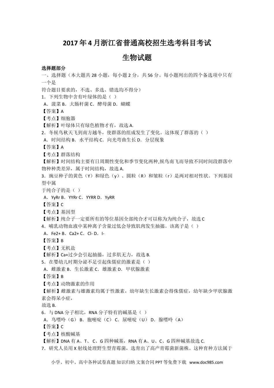 2017年4月浙江省普通高校招生选考科目考试生物试题选择题部分一、选择题(本大题共28小题,每小题2分,共56分。每小题列出的四个备选项中只有一个是符合题目要求的,不选、多选、错选均不得分)1.下列生物中含有叶绿体的是()A.菠菜B.大肠杆菌C.酵母菌D.蝴蝶【答案】A【考点】细胞器【解析】叶绿体只有绿色植物才有,故选A.2.冬候鸟秋天飞到南方越冬,使群落的组成发生了变化。这体现了群落的()A.时间结构B.水平结构C.向光弯曲生长D.分层现象【答案】A【考点】群落结构【解析】时间结构主要有日周期性变化和季节变化两种,候鸟南飞而导致不同时间段群落中物种种类差异,属于时间结构,故选A.3.豌豆种子的黄色(Y)和绿色(y)、圆粒(R)和皱粒(r)是两对相对性状。下列基因型中属于纯合子的是()A.YyRrB.YYRrC.YYRRD.YyRR【答案】C【考点】基因型【解析】纯合子一定要所有的等位基因全部纯合才可以称为为纯合子,故选C4.哺乳动物血液中某种离子含量过低会导致肌肉发生抽搐。该离子是()A.Fe2+B.Ca2+C.Cl-D.I-【答案】B【考点】无机盐【解析】Ca+过少会引起抽搐,过多肌无力,故选B.5.在婴幼儿时期分泌不足引起侏儒症的激素是()A.雌激素B.生长激素C.雄激素D.甲状腺激素【答案】B【考点】动物激素的作用【解析】雌激素与雄激素均厲于性激素,幼年缺生长激素会得侏儒症,幼年缺少甲状腺激素会得呆小症,故选B.6.与DNA分子相比,RNA分子特有的碱基是()A.鸟嘌呤(G)B.胞嘧啶(C)C.尿嘧啶(U)D.腺嘌呤(A)【答案】C【考点】核酸碱基【解析】DNA有A、T、C、G四种碱基,RNA有A、U、C、G四种碱基故选C.7.研究人员用X射线处理野生型青霉菌,选育出了高产青霉菌新菌株。这种育种方法属于小学、初中、高中各种试卷真题知识归纳文案合同PPT等免费下载www.doc985.com()A.杂交育种B.单倍体育种C.诱变育种D.多倍体育中【答案】C【考点】育种【解析】诱变育种是利用物理、化学因素诱导生物发生变异,并从变异后代中选育新品种的过程,故选C.8.下列关于人类与环境的叙述,错误的是()A.酸雨会破坏水体的生态平衡B.大气中的CO2浓度的增加会使全球气候变暖C.人口的过度增长会增加对地球资源的消耗D.平流层中臭氧含量变化与紫外线对地球表面的辐射量无关【答案】D【考点】生态平衡【解析】酸雨会导致水体pH下降;CO2是温室气体,可使大气温度升高;人口过度增长,人均具有的资源就会减少;臭氧的主要功能是抵挡紫外线,故选D.9.下列关于艾滋病的叙述,错误的是()A.HIV的主要传播途径是性接触、血液传播和母婴传播B.感染HIV后一般要经过较长的潜伏期才会发病C.艾滋病是一种削弱人体免疫功能的疾病D.HIV侵入人体后只感染辅助性T淋巴细胞【答案】D【考点】免疫缺陷【解析】HIV病毒主要侵染辅助性T细胞,还会侵染脑细胞和巨噬细胞,故选D10.下列关于人体衰老细胞的叙述,正确的是()A.多种酶的活性降低B.线粒体数量增加C.细胞呼吸明显加快D.细胞核体积变小【答案】A【考点】细胞衰老【解析】细胞衰老会导致代谢减弱,酶的活性降低,线粒体数目减少,但是线粒体和细胞核的体积会增大,故选A.11.下列关于细胞中系能反应和方能反应的叙述,错误的是()A.糖的氧化反应式方能反应B.光合作用的碳反应是吸能反映C.ATP是吸能反应和放能反应的纽带D.氨基酸合成蛋白质的过程是放能反应【答案】D【考点】能量代谢【解析】氨基酸合成蛋白质的过程是需要消耗能量的,所以是吸能反应,故选D.12.每年二月的最后一天为“国际罕见病日”。下列关于罕见病苯丙酮尿症的叙述,正确的是()A.该病是常染色体多基因遗传病B.近亲结婚不影响该病的发生率C.该病的发病风险在青春期会增加D.“选择放松”不会造成该病基因频率的显著增加小学、初中、高中各种试卷真题知识归纳文案合同PPT等免费下载www.doc985.com【答案】D【考点】遗传病【解析】苯丙酮尿症是常染色体隐性遗传病,A错;该病是常染色体隐性遗传病,所以近亲结婚会导致隐性纯合概率增加,B错;所有的遗传病在青春期的发病率都很低,C错;而“选择放松”造成有害基因的增多是有限的,故...