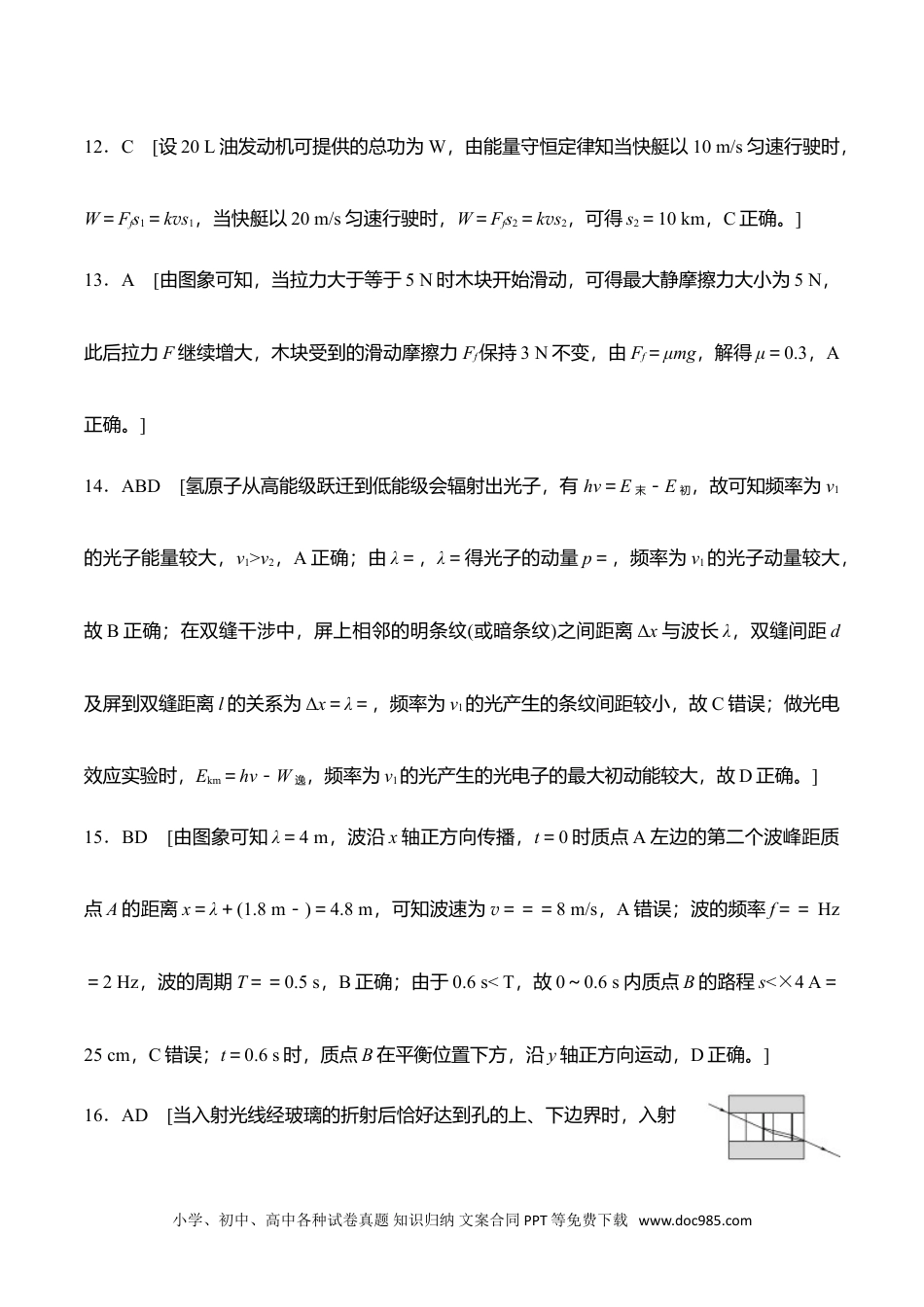 2015年10月浙江省普通高校招生选考科目考试物理试题1.A[国际单位制中,基本单位只有七个,高中阶段只需掌握6个,即kg、m、s、A、mol、K,各自对应的物理量是质量、长度、时间、电流强度、物质的量、热力学温度。]2.D[在v-t图象中,斜率代表的是加速度,D的斜率为0,即为匀速直线运动。A的斜率为负,为匀减速直线运动,B、C的斜率为正,B为初速度不为0的匀加速直线运动,C为初速度为0的匀加速直线运动。]3.A[参考系是假定为不动的物体,因此,固定队列中的飞机(或飞机中的人)为参考系时,队列中的其他飞机和其他飞行员是静止的,广场上的观众是运动的;以广场上的人作为参考系时,飞机是水平运动的,故A正确。]4.B[v=216km/h=60m/s,x=vt=1200m,B正确。]5.D[水流的重力势能一部分转化成水轮机的能量,另一部分会转化成内能,回到瀑布上方的水流一定会越来越少,题目中描述的周而复始是不成立的,违背了能量守恒定律,故D正确。]6.B[已知位移为x=58m,用时t=15s,则可求出平抛速度v=m/s≈3.87m/s,只有位移和时间这两个物理量,在匀变速直线运动中是无法求出初速度、末速度和加速度的,故B正小学、初中、高中各种试卷真题知识归纳文案合同PPT等免费下载www.doc985.com确。]7.C[小卫星分别在不同的三层轨道上做匀速圆周运动,即它们的轨道半径不同,A错误;由G=m得v=,随着轨道半径的增大,卫星的线速度减小,B错误;由G=mω2r得ω=,随着轨道半径的增大,卫星的角速度减小,D错误;由G=mr得T=2π,随着轨道半径的增大,卫星的运行周期变大,半径相同,则周期相同,故C正确。]8.C[小孩子从最高点运动到最低点,由机械能守恒定律可得mgh=mv2,h=1.25m,由牛顿第二定律可得FN-mg=m,R=2.5m,解以上两式得FN=600N,再由牛顿第三定律可知,小孩对秋千板的压力为600N。]9.C[由第1,2,3组数据可知,电流保持不变时,磁感应强度增大多少倍,电压Uab也增大多少倍,可推知电压Uab可能与磁感应强度成正比,B、D错误;由第1,4,5组数据可知磁感应强度保持不变时,电流增大多少倍,电压Uab也增大多少倍,可推知电压Uab可能与电流成正比,A错误,C正确。]10.B[W=Pt=104kW×1200h=1.2×107kW·h,故B正确。]11.A[由库仑定律得F=k=,A正确,B错误;对A小球受力分析如图所示。由共点力平衡知,tanθ=,得F=mg,故C、D错误。]小学、初中、高中各种试卷真题知识归纳文案合同PPT等免费下载www.doc985.com12.C[设20L油发动机可提供的总功为W,由能量守恒定律知当快艇以10m/s匀速行驶时,W=Ffs1=kvs1,当快艇以20m/s匀速行驶时,W=Ffs2=kvs2,可得s2=10km,C正确。]13.A[由图象可知,当拉力大于等于5N时木块开始滑动,可得最大静摩擦力大小为5N,此后拉力F继续增大,木块受到的滑动摩擦力Ff保持3N不变,由Ff=μmg,解得μ=0.3,A正确。]14.ABD[氢原子从高能级跃迁到低能级会辐射出光子,有hν=E末-E初,故可知频率为ν1的光子能量较大,ν1>ν2,A正确;由λ=,λ=得光子的动量p=,频率为ν1的光子动量较大,故B正确;在双缝干涉中,屏上相邻的明条纹(或暗条纹)之间距离Δx与波长λ,双缝间距d及屏到双缝距离l的关系为Δx=λ=,频率为ν1的光产生的条纹间距较小,故C错误;做光电效应实验时,Ekm=hν-W逸,频率为ν1的光产生的光电子的最大初动能较大,故D正确。]15.BD[由图象可知λ=4m,波沿x轴正方向传播,t=0时质点A左边的第二个波峰距质点A的距离x=λ+(1.8m-)=4.8m,可知波速为v===8m/s,A错误;波的频率f==Hz=2Hz,波的周期T==0.5s,B正确;由于0.6s<T,故0~0.6s内质点B的路程s<×4A=25cm,C错误;t=0.6s时,质点B在平衡位置下方,沿y轴正方向运动,D正确。]16.AD[当入射光线经玻璃的折射后恰好达到孔的上、下边界时,入射小学、初中、高中各种试卷真题知识归纳文案合同PPT等免费下载www.doc985.com光线具有最大入射角度,画出光路图如图所示,图中粗细两边界分别为玻璃砖在孔内的两个位置,由于玻璃的折射率一定,玻璃的厚度相同,玻璃的两边界平行,故光线经玻璃折射前后是平行的,玻璃移动前后光线偏折的角度和距...
