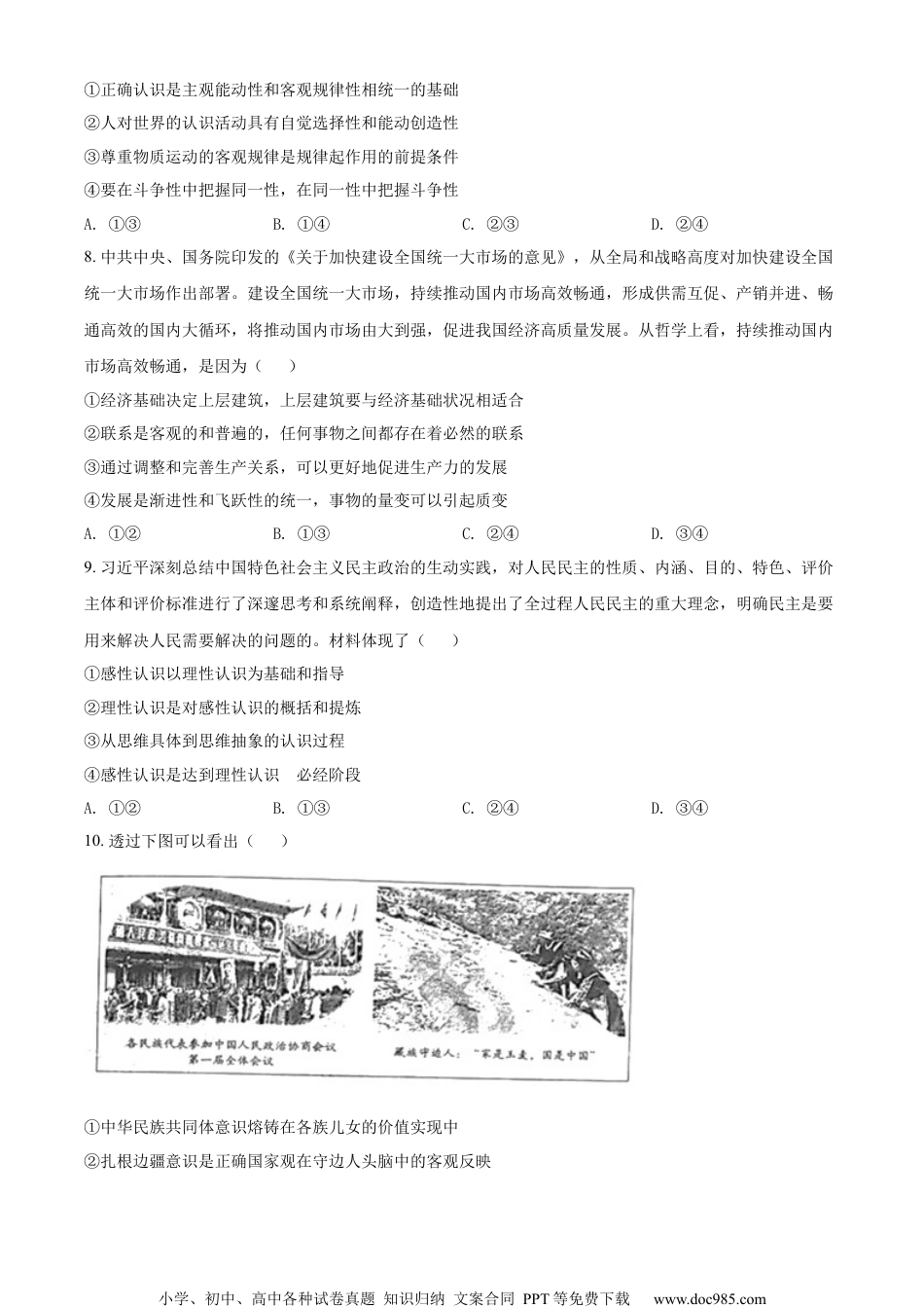 小学、初中、高中各种试卷真题知识归纳文案合同PPT等免费下载www.doc985.com山东省2022年普通高中学业水平等级考试思想政治注意事项:1.答卷前,考生务必将自己的姓名、考生号等填写在答题卡和试卷指定位置。2.回答选择题时,选出每小题答案后,用铅笔把答题卡上对应题目的答案标号涂黑。如需改动,用橡皮擦干净后,再选涂其他答案标号。回答非选择题时,将答案写在答题卡上。写在本试卷上无效。3.考试结束后,将本试卷和答题卡一并交回。一、选择题:本题共15小题,每小题3分,共45分。每小题只有一个选项符合题目要求。1.马克思认为,在未来的社会主义制度中,社会生产力的发展将如此迅速,生产将以所有人的富裕为目的。习近平指出,共同富裕是全体人民共同富裕,是人民群众物质生活和精神生活都富裕,不是少数人的富裕,也不是整齐划一的平均主义。关于共同富裕,下列理解正确的是()A.消除社会基本矛盾是实现共同富裕的必由之路B.建设高福利国家是实现共同富裕的根本路径C.促进共同富裕和促进人的全面发展是高度统一的D.共同富裕会随社会生产力的迅速发展而自发实现2.在从“0”到“1”的原始创新成果孵化期,企业迫切需要资本支持,但因投资风险高,融资困难。某省探索出以“国有资本战略投资”撬动社会资本、共同服务创新企业发展的新路,通过产业政策和国有资本投资,解决了科技企业初创期社会资本不愿投、不敢投的问题,在前瞻性战略性产业“育种育苗”,由此培育出了一大批高科技企业。该省做法取得成功的原因在于,国有资本()①投资前瞻性战略性产业增强了国有经济的控制力②服务创新企业发展弥补了市场追求短期利益的缺陷③通过撬动社会资本推动了国有企业混合所有制改革④通过战略投资推动了有效市场和有为政府更好结合A.①③B.①④C.②③D.②④3.2022年山东省新设40万个城乡公益性岗位,对就业困难人员予以托底安置。政府在社区设置日间照料中心服务等公共服务类公益岗、网格员等公共管理类公益岗,按照不低于当地小时最低工资标准发放岗位补贴。政府通过设置公益性岗位()①挖掘更多就业潜力,落实好保就业目标②丰富社会救助形式,满足群众保障诉求小学、初中、高中各种试卷真题知识归纳文案合同PPT等免费下载www.doc985.com③采取以工代赈方式,增加群众收入来源④推动慈善事业发展,牢牢兜住民生底线A.①③B.①④C.②③D.②④4.市场主体是我国经济活动的主要参与者,市场主体活力越强,经济“肌体”越健康。近年来,中央持续激发市场主体活力的政策取向非常鲜明。若不考虑其他因素,下列推导正确的是()①实施组合式税费支持政策→提高增值税起征点→缓解企业资金压力→提振企业市场信心②下调金融机构存款准备金率→加大信贷投放力度→拓宽企业融资渠道→降低企业投资风险③深化要素价格市场化改革→稳定要素市场价格→优化企业要素配置→提高企业市场占有率④健全公平竞争审查制度→强化反垄断监管→防止资本无序扩张→保护中小企业生存发展空间A.①②B.①④C.②③D.③④5.老龄化社会对养老服务提出了更高要求。针对养老助餐服务状况,某中学生调研小组收集的资料如下:♢J市政府引入拥有中央厨房且连锁经营的企业,在其直营店设立了“长者助餐”窗口。♢F省某政协委员通过调研协商,推动建立了“政府搭台、村居承办、居民互助、个人自愿、梯度收费、社会参与”的“互助孝老食堂”模式。该小组拟向相关部门提交调研报告,报告的主题可以归纳为()①转变治理理念,构建共治共享格局②聚焦民生切口,释放多元主体能量③赋能基层组织,提高自我服务能力④发挥协商优势,提升群众的幸福感A.①②B.①④C.②③D.③④6.为贯彻落实知识产权强国战略,海南省和北京市的人大常委会在已有法律法规基础上,率先制定了各自的知识产权保护条例。海南省的条例重点针对植物新品种保护等自贸港知识产权工作中的突出问题,北京市则主要强化奥林匹克标志、网络平台等新兴领域的知识产权保护。据此,下列说法正确的是()①海南省的条例完善了对植物新品种保护的法律实施机制②北京市的条例体现了北京市人大常委会的地方立法权③海南省的条例提高了海南自贸港在相关领域的治...