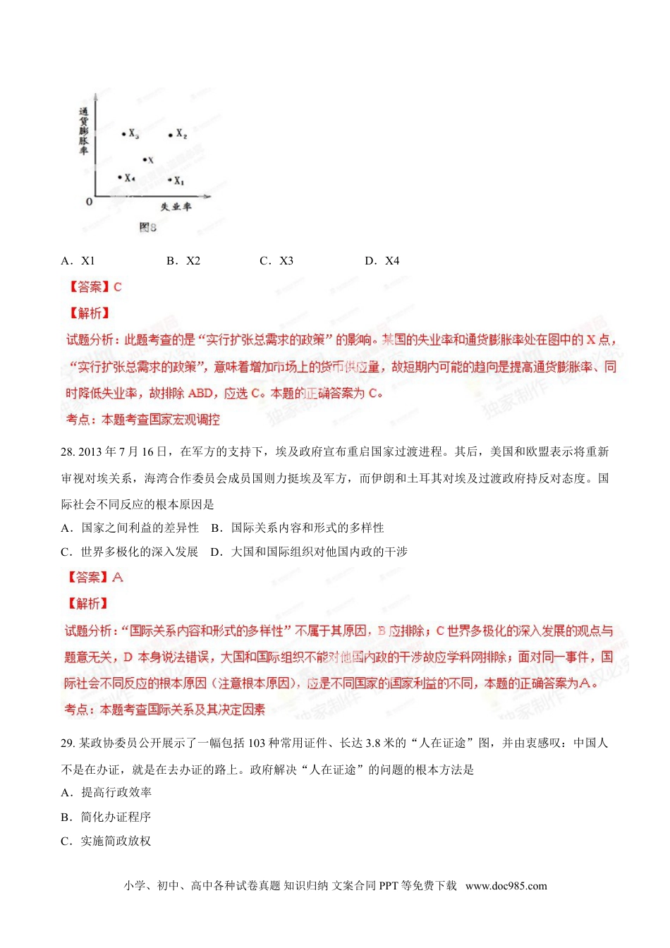 绝密★启封前说明:本卷为广东卷,由学科网政治解析团队第一时间独家人工录入。一、选择题:本大题共35小题,每小题4分,满分140分。在每小题给出的四个选项中,只有一项是符合题目要求的。24.广东某市出台政策,实施农业“一镇一品”示范建设工程,通过招商引资,引导龙头企业与试点镇对接,构建平价商店、机场超市、网站、连锁店等组成的网络化销售平台,显著带动了当地农业增效和农民增收。这一成效得益于①借力政策扶持,整合资源优势②降低商品价格,确立竞争方向③创新营销模式,优化发展战略④调整消费结构,增加产品供给A.①③B.①④C.②③D.②④25.图7中,X为自变量,Y为因变量,假定其他条件不变,下列选项与图7反映的变动关系相符的是小学、初中、高中各种试卷真题知识归纳文案合同PPT等免费下载www.doc985.comA.X为汽车的价格,Y为汽油的需求量B.X为物价总水平,Y为货币的实际购买力C.X为居民可支配收入,Y为恩格尔系数D.X为出口额,Y为外汇收入26.国家统计局数据显示,2013年平均工资保持较快增长,但工资水平的地区差距、行业差距、岗位差距仍然较大。针对这一问题,可采取的合理措施有①提高劳动报酬在再分配中的比重②创新扶贫方式,推进特殊困难地区的发展③禁止非法垄断及非法竞争行为④逐步实现城乡基本公共服务平均化A.①③B.①④C.②③D.②④27.假定某国的失业率和通货膨胀率处在图8中的X点,如果实行扩张总需求的政策,一般来说,该点短期内可能趋向小学、初中、高中各种试卷真题知识归纳文案合同PPT等免费下载www.doc985.comA.X1B.X2C.X3D.X428.2013年7月16日,在军方的支持下,埃及政府宣布重启国家过渡进程。其后,美国和欧盟表示将重新审视对埃关系,海湾合作委员会成员国则力挺埃及军方,而伊朗和土耳其对埃及过渡政府持反对态度。国际社会不同反应的根本原因是A.国家之间利益的差异性B.国际关系内容和形式的多样性C.世界多极化的深入发展D.大国和国际组织对他国内政的干涉29.某政协委员公开展示了一幅包括103种常用证件、长达3.8米的“人在证途”图,并由衷感叹:中国人不是在办证,就是在去办证的路上。政府解决“人在证途”的问题的根本方法是A.提高行政效率B.简化办证程序C.实施简政放权小学、初中、高中各种试卷真题知识归纳文案合同PPT等免费下载www.doc985.comD.推进集中办证考点:本题考查政府的主要职能和政府依法行政的意义和要求30.按照起草草案、审议等法定程序,十二届全国人大常委会第七次会议于2014年2月27日通过表决,确定9月3日为中国人民抗日战争胜利纪念日、12月13日为南京大屠杀死难者国家公祭日。此决定的性质和目的分别是①人大常委会立法权的体现②人大常委会决定权的体现③服从和服务于国家外交大局④进一步弘扬爱国主义精神A.①③B.①④C.②③D.②④31.明代思想家薛瑄曾将廉者分为三等:见理明而不妄取者为上;尚名节而不苟取者次之;畏法律保禄位而不敢取者再次之。“不妄、不苟、不敢”这一理念给我们的启示是①应树立廉洁文化的自觉性②应以传统廉政思想为修廉的根本③要提高自身思想道德修养④要坚守传统的名节观和价值取向A.①②B.①③C.②④D.③④小学、初中、高中各种试卷真题知识归纳文案合同PPT等免费下载www.doc985.com32.某班以“应该‘浅阅读’还是更应该‘深阅读’为主题举办辩论会”。小李说:“‘浅阅读’虽具有简单、快速、生动等特点,但缺乏深刻的理性思考和叩问心灵的力量,因此,我主张深阅读。”下列选项正确且能进一步支持小李主张的是A.理性思考转化为物质力量是通过“深阅读”实现的B.“浅阅读”是现代社会快节奏生活下的一种文化需要C.“浅阅读”在文化上对人肯定不会有深远持久的影响D.“深阅读”有助于透视人们的精神世界和精神生活33.当前职业教育处于“进口”“出口”冰火两重天的境地:一方面,部分学生受“高职院校不是大学”的观念等因素影响而不愿报考,导致职校生源萎缩;一方面,职校生在就业市场成为“香饽饽”,企业高薪难觅技师,这就为扭转职业教育的尴尬局面提供了有利条件。其中蕴涵的哲理是A.矛盾双方既对立又统一推动事物发展B.矛盾的主...