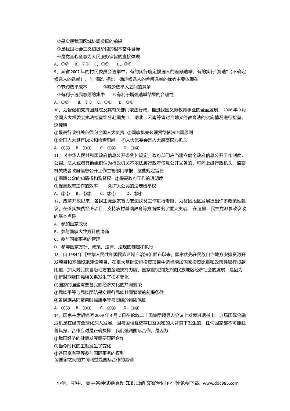 2009年普通高等学校招生全国统一考试(海南卷)政治第I卷本卷共22小题,每小题2分,在每小题给出的四个选项中,只有一项是符合题目要求的。1、假设2007年1单位M国货币/1单位N国货币为1:5.5.2008年,M国的通货膨胀率10%,其他条件不变,从购买力角度来看,则两国间的汇率为A、1:4.95B、1:5C、1:5.6D、1:6.052、2008年在美国爆发的金融危机已严重影响到全球经济。回答2-3题。面对世界经济危机,我国出台积极地宏观经济政策,保增长、扩内需、调结构。下列宏观调控措施中能起到扩大内需作用的有降低银行贷款利率②降低征服行政管理支出加大政府投资力度④提高出口商品关税税率A、B、C、D、3、在世界金融危机期间,一批依托科研机构进行技术研发的企业呈现逆势上扬的态势,新产品不断问世,企业的销售收入与里人呢也随之上升。这是因为产品创新增强了企业竞争优势产研联合实现了双方优势互补新产品的新功能增大了其价值科技产品的需求弹性小利润大A、B、C、D、4、十一届全国人大二次会议审议通过的2009年《政府工作报告》提出,要进一步提高居民的社会保障待遇,2009年、2010年我国企业退休人员基本养老金人均每年增长约10%。如果其他条件不变,这一措施将A、缩小个人和家庭收入差距B、提高企业吸引力和经济效益C、刺激消费、促进社会稳定D、实现养老金保值、增值5、1980年至1990年,我国GDP保持每年9.5%的增长,就业人口年增长率为4.3%,就业弹性(就业人口年增长率/GDP年增长率)为0.543.1991年至2000年,就业弹性下降至0.11。2001年至2008年,就业弹性下降到不足0.1。下列措施中恩那个有效提高我国就业弹性的有大力发展服务业保持经济快速增长支持中小企业发展提高劳动者工资水平A、B、C、D、“”某奶牛养殖大县的一百多农户自发城里奶联社,将奶牛集中起来,由奶联社组织养牛能手对奶牛统一刺痒、管理;每头牛作价5000元入股,固定分红,5年返利6000元。入社后奶牛的饲养成本下降,奶牛的产量上升,奶价因奶质量提高而上升。回答6-7题。6、奶联社经营模式的成功之处在于积极发展规模化经营增加紫金和物质投入降低农户的经营风险对奶价实施有效控制A、B、C、D、7、从所有制性质上看,奶联社属于A、个体经济、混合所有制B、集体经济、股份合作制C、降低农户的经营风险D、对奶价实施有效控制8、2008年10月,中共十七届三中全会通过《中共中央关于推荐农村改革发展若干重大问题的决定》。胡锦涛总书记指出,农业、农村和农民问题,始终是一个关系党和国家工作全局的根本性问“”题,必须始终作为全党工作的重中之重。解决三农问题是缩小城乡差距构建和谐社会的必要条件小学、初中、高中各种试卷真题知识归纳文案合同PPT等免费下载www.doc985.com是实现我国区域协调发展的前提是我国社会主义初级阶段的根本奋斗目标是党全心全意为人民服务宗旨的直接体现A、B、C、D、9、某省2007“”年的村民委员会选举中,有的实行确定候选人的差额选举,有的实行海选(不确定“”候选人的选举)。与海选相比,确定候选人的差额选举的优势主要体现在节约选举成本减少选举人之间的竞争有利于选民意愿的集中有利于增强选举结果的合理性A、B、C、D、10、为督促和支持国务院及其有关部门依法行政,推进我国义务教育事业的全面发展,2008年9月,全国人大常委会执法检查组分赴黑龙江、湖北、云南等省对当地义务教育法的实施情况进行检查。这标明①最高行政机关必须向全国人大负责②国家机关必须贯彻依法治国原则③全国人大具有执法和检查职能④人大常委会是人大最高权力机关A.①②B.①③C.②④D.③④11、《中华人民共和国政府信息公开条例》规定,政府部门应当建立健全政府信息公开工作制度,公民、法人或者其他组织认为行政机关不依法履行政府信息公开义务的,可向上级行政机关、监察机关或者政府信息公开工作主管部门举报,这些规定旨在①保障公众的知情权和监督权②提高政府工作的透明度③提高政府工作的效率④扩大公民的法定检举权A.①②B.①...