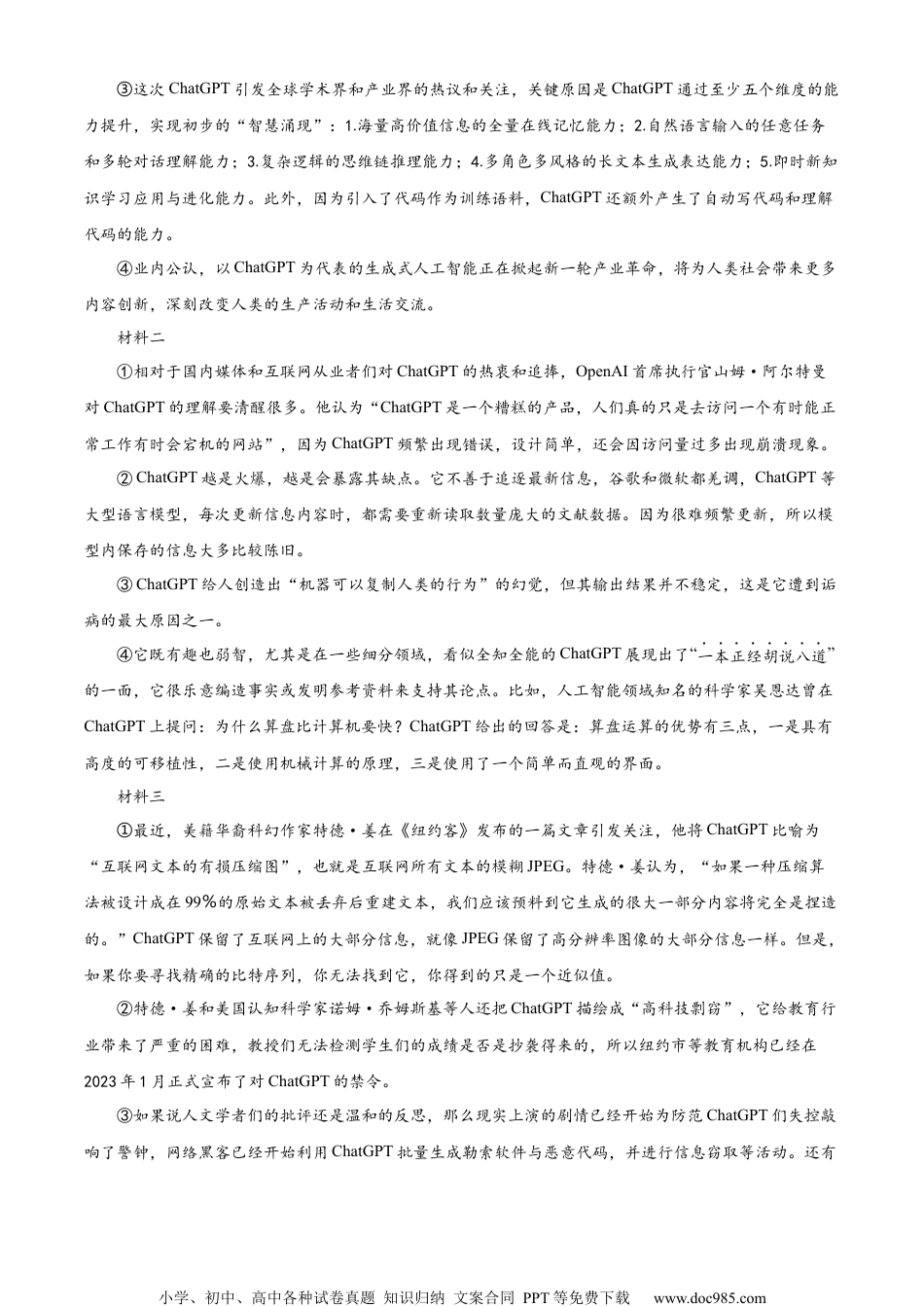 小学、初中、高中各种试卷真题知识归纳文案合同PPT等免费下载www.doc985.com浦东新区2023学年度第二学期期中教学质量检测高三语文试卷考生注意:1.本考试设试卷和答题纸两部分,试卷包括试题与答题要求,所有答题必须涂(选择题)或写(非选择题)在答题纸上,做在试卷上一律不得分。2.答卷前,务必用钢笔或圆珠笔在答题纸正面清楚地填写校名、姓名、准考证号。3.答题纸与试卷在试题编号上是一一对应的,答题时应特别注意,不能错位。4.考试时间150分钟,试卷满分150分。一积累应用10分1.按要求填空。(1)西当太白有鸟道,_______________。(李白《蜀道难》)(2)_______________,暴霜露,斩荆棘,以有尺寸之地。(苏洵《__________》)(3)贾谊《过秦论》中“_______________,_______________”两句,运用比喻手法,生动形象地描写了陈涉起义后得到热烈响应的情景。【答案】①.可以横绝峨眉巅②.思厥先祖父③.《六国论》④.天下云集响应⑤.赢粮而景从【解析】【详解】本题考查学生默写名篇名句和识记文学常识的能力。易错字有:峨、巅、厥、赢、景。2.按要求作答。(1)小浦春节请书法社老师为学校大门写了一副对联,以下最符合的一项是()A.上联:龙腾九天万物生下联:凤舞盛世群英会B.上联:龙岁生辉照杏林下联:春风化雨润桃李C.上联:龙岁书声传四海下联:新年笔韵绘千山D.上联:龙行春霖滋沃土下联:师长矢志育新苗(2)将下列编号的句子依次填入语段空白处,语意连贯的一项是()上海能够成为中国共产党的诞生地最重要的一个方面,与上海在近代中国的历史进程和地位密不可分,上海是中国近代最早开放的城市,_________,_________,_________,_________,从而使上海成为中国共产党诞生地,成为历史的必然。①为中国共产党的成立提供了政治、经济、社会和文化等各种条件②始终是东西方联结的桥梁和纽带小学、初中、高中各种试卷真题知识归纳文案合同PPT等免费下载www.doc985.com③开放伴随着上海作为现代都市的形成④得风气之先和地利之便A.④②①③B.③④①②C.③②④①D.④①②③【答案】(1)C(2)C【解析】【小问1详解】本题考查学生语言表达之理解对联的能力。A.突出了盛世的欢腾,与“读书”“学校”无关,不合语境。B.“杏林”是中医学界的代称,赞扬医生的高明医术和高尚医德,不合语境。C.“书声传四海”与“读书”“学校”有关,符合语境。D.赞美老师对学生的培养,只是赞美老师的,写在“学校大门”不甚合适。故选C。【小问2详解】本题考查学生语言表达之句子衔接排序的能力。前文提到上海是中国近代最早开放的城市,第③句中有“开放……”,故其与前文关系紧密,语意连贯,③在最前面,可排除AD;后文提到使上海成为中国共产党诞生地,成为历史的必然,羌调了中国共产党成立这一结果结果,与①中“为中国共产党的成立提供了……”相照应,故第①在最后,可排除ABD。③②④①正确,故选C。二阅读70分(一)(16分)阅读下文,完成下面小题。材料一①近日,OpenAI公司推出的ChatGPT引发了全球热议。这款以聊天机器人形式推出的产品,不仅具有学习和理解人类语言的能力,还能根据聊天内容的上下文进行互动,像“人”一样与使用者进行对话,并能在对话过程中完成撰写邮件、创作文案、翻译甚至编程等多项任务。出人意料的“聪明”让它受到了众多企业青睐,将其作为日常工作中的效率工具。②人工智能模型运用深度学习算法和自然语言处理技术,通过对大量语言数据和人类积累的图书、论文等知识库的学习,具备了掌握人类海量知识以及理解和表达人类语言的能力。同时,人工智能模型还能持续学习、不断进化。据悉,OpenAI今年将发布经过进一步训练学习后的GPT-4,产品使用效果还会有飞跃式提升。小学、初中、高中各种试卷真题知识归纳文案合同PPT等免费下载www.doc985.com③这次ChatGPT引发全球学术界和产业界的热议和关注,关键原因是ChatGPT通过至少五个维度的能力提升,实现初步的“智慧涌现”:1.海量高价值信息的全量在线记忆能力;2.自然语言输入的任意任务和多轮对话理解能力;3.复杂逻辑的思维链推理能力;4.多角色多风格的长文本生成表达能力;5.即时新...
