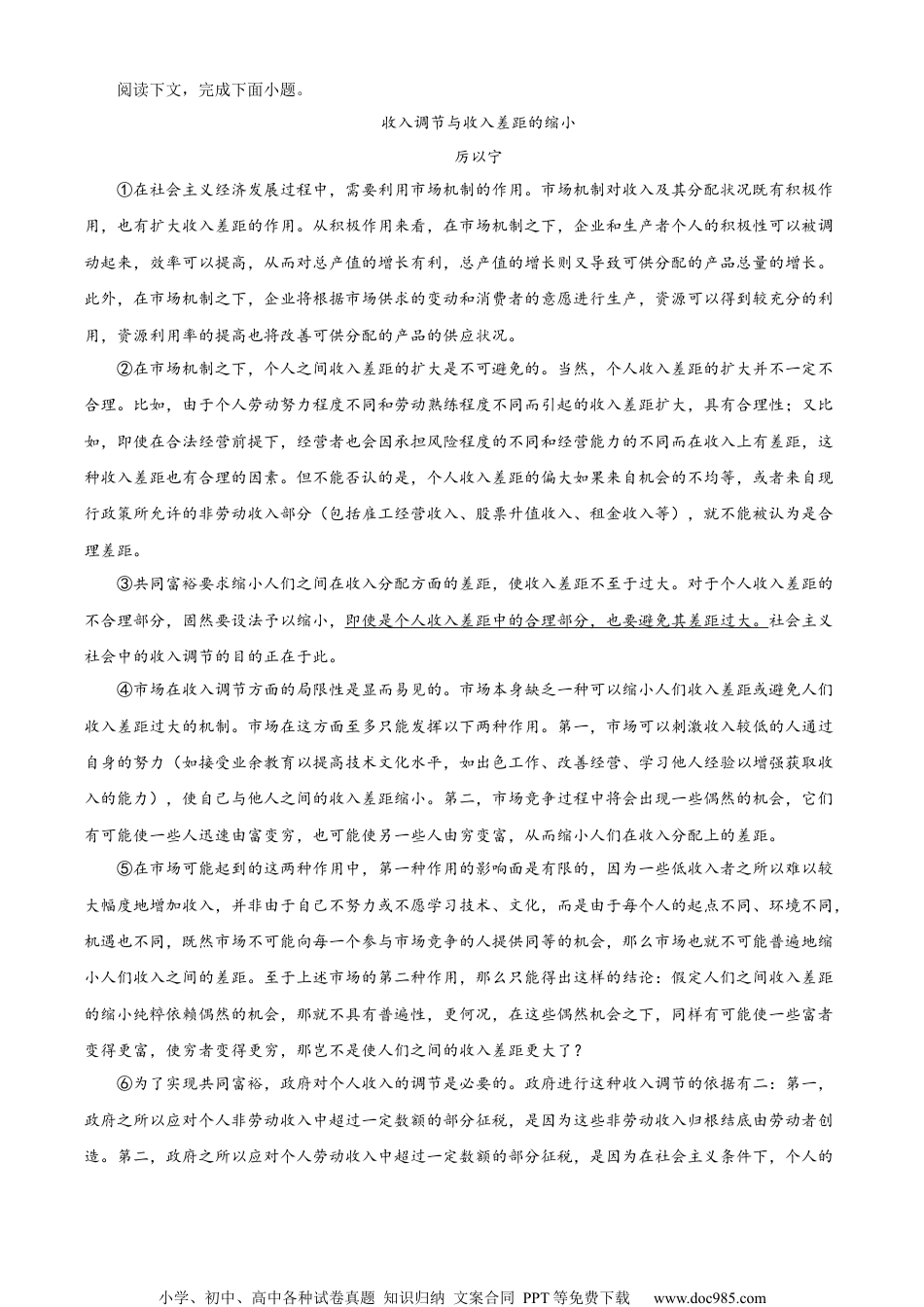 小学、初中、高中各种试卷真题知识归纳文案合同PPT等免费下载www.doc985.com静安区2022学年第二学期教学质量检测高三语文试卷(2023.04)考生注意:1.本场考试时间150分钟,满分150分。2.所有作答务必填涂或书写在答题纸上与试卷题号对应的区域,不得错位。在试卷上作答一律不得分。3.用2B铅笔作答选择题,用黑色字迹钢笔、水笔或圆珠笔作答非选择题。一、积累应用(10分)1.按要求填空。(1)飞湍瀑流争喧豗,_____________。(李白《___________》)(2)物有本末,事有终始,_____________,_____________。(《礼记·大学之道》)(3)贾谊在《过秦论》中总结秦由盛转衰原因的句子是:“_____________。”2.按要求选择。(1)将下列编号的语句依次填入语段空白处,语意连贯的一项是()儒家主张尊君,这是从孔子开始的。但是,孔子并不主张君主个人独裁。君对于臣,也要遵守一定的制度;对君的行为要有一定的约束。(摘自张岱年《孔子哲学解析》)①人君如有过失,应该进行谏诤。②孔子认为不辨是非的“言莫予违”(不要违背“国君”的话)足以丧邦。③人臣事君,要有一定的原则;④孔子也要求君主遵守一定的原则,他说:“君使臣以礼,臣事君以忠。”⑤这也意味着,孔子虽然主张尊君,却不同意一人独裁。A.②⑤④①③B.③①④⑤②C.②⑤③①④D.③④①②⑤(2)有些小说写人,好人好得十全十美,坏人坏得彻头彻尾;《红楼梦》注意塑造丰富立体的人物形象,打破读者的思维定势。下面不能体现这一观点的选项是()A.薛蟠误将唐寅说成“庚黄”时自嘲:“谁知他‘糖银’‘果银’的”,透出不呆的机智。B.薛蟠与冯公子争买香菱,放纵家奴打死人,竟如同没事人一走了之,显出他的暴虐可恶。C.柳湘莲因尤三姐事出走,薛蟠派人寻柳未果,陷入悲痛中,显示他待人真诚可爱的一面。D.小说常写好人被冤枉,宝玉挨打,薛蟠被诬作告密者,这种写法能打破读者的思维定势。二、阅读(70分)(一)小学、初中、高中各种试卷真题知识归纳文案合同PPT等免费下载www.doc985.com阅读下文,完成下面小题。收入调节与收入差距的缩小厉以宁①在社会主义经济发展过程中,需要利用市场机制的作用。市场机制对收入及其分配状况既有积极作用,也有扩大收入差距的作用。从积极作用来看,在市场机制之下,企业和生产者个人的积极性可以被调动起来,效率可以提高,从而对总产值的增长有利,总产值的增长则又导致可供分配的产品总量的增长。此外,在市场机制之下,企业将根据市场供求的变动和消费者的意愿进行生产,资源可以得到较充分的利用,资源利用率的提高也将改善可供分配的产品的供应状况。②在市场机制之下,个人之间收入差距的扩大是不可避免的。当然,个人收入差距的扩大并不一定不合理。比如,由于个人劳动努力程度不同和劳动熟练程度不同而引起的收入差距扩大,具有合理性;又比如,即使在合法经营前提下,经营者也会因承担风险程度的不同和经营能力的不同而在收入上有差距,这种收入差距也有合理的因素。但不能否认的是,个人收入差距的偏大如果来自机会的不均等,或者来自现行政策所允许的非劳动收入部分(包括雇工经营收入、股票升值收入、租金收入等),就不能被认为是合理差距。③共同富裕要求缩小人们之间在收入分配方面的差距,使收入差距不至于过大。对于个人收入差距的不合理部分,固然要设法予以缩小,即使是个人收入差距中的合理部分,也要避免其差距过大。社会主义社会中的收入调节的目的正在于此。④市场在收入调节方面的局限性是显而易见的。市场本身缺乏一种可以缩小人们收入差距或避免人们收入差距过大的机制。市场在这方面至多只能发挥以下两种作用。第一,市场可以刺激收入较低的人通过自身的努力(如接受业余教育以提高技术文化水平,如出色工作、改善经营、学习他人经验以增强获取收入的能力),使自己与他人之间的收入差距缩小。第二,市场竞争过程中将会出现一些偶然的机会,它们有可能使一些人迅速由富变穷,也可能使另一些人由穷变富,从而缩小人们在收入分配上的差距。⑤在市场可能起到的这两种作用中,第一种作用的影响面是有限的,因为一些低收入者之所以难以较大幅度...