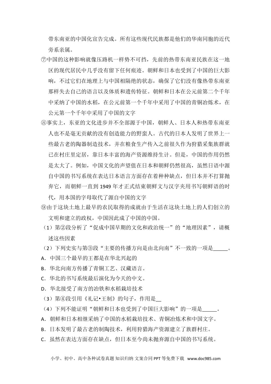 2018年上海市静安区高考语文二模试卷一、积累应用10分1.(5分)按要求填空。(1)总为浮云能蔽日,。(唐《登金陵凤凰台》)(2)曾子曰:“,任重而道远。”(《论语》)(3)王国维在《人间词话》里说“古今之成大事业、大学问者,必㓿过三种之境界”,其中形容第二种境界的句子是“,。”2.(5分)按要求选择。(1)卓不凡同学恃才傲物,好友想写一句话劝诫他,以下句子最合适的一项是A.君子之修身也,内正其心,外正其容。(欧阳修)B.谈笑有鸿儒,往来无白丁。(刘禹锡)C.金以刚折,水以柔全;山以高移,谷以卑安。(葛洪)D.得道者多助,失道者寡助。(孟子)(2)填入下面句子空白处的词语,最准确的一项是①银行应遵循真实性、准确性、完整性和可比性原则,规范地[甲]㓿过审计的年度财务报告。②教师职业的性质不明确,其特点也会不明确,不仅给教师带来[乙],也给管理带来了困难。A.[甲]透露[乙]疑惑,B.[甲]披露[乙]困惑C.[甲]披露[乙]疑惑D.[甲]透露[乙]困惑二、阅读70分3.(16分)阅读下文,完成各题。中国怎样成了中国人的中国①公元前7500年左右,中国开始出现农作物和家畜,还有陶器和打磨的石器。中国是世界上最早的动植物驯化中心之一。中国广大的幅员和生态的多样性造就了许多不同的地区性文化。在公元前第四个千年期间,这些地区性文化在地理上扩张,它们开始相互作用,相互竞争,相互融合。文化多样性地区之间的交流,丰富了中国的文化和技术,而交战的酋长管辖地之间的激烈竞小学、初中、高中各种试卷真题知识归纳文案合同PPT等免费下载www.doc985.com争推动了规模更大、权力更集中的国家的形成。②虽然中国的南北梯度妨碍了作物的传播,但这种梯度在中国不像在美洲或非洲那样成为一种障碍,因为中国的南北距离较短;同时也因为中国的南北之间既不像非洲和墨西哥北部那样被沙漠阻断,也不像中美洲那样被狭窄的地峡隔开。倒是中国由西向东的河(黄河、长江)方便了沿海地区与内陆之间作物和技术的传播,而中国东西部之间的广阔地带和相对平缓的地形最终使这两条大河的水系得以用运河连接起来,从而促进了南北之间的交流。所有这些地理因素促成了中国早期的文化和政治统一,而西方的欧洲虽然面积和中国差不多,但地势比较高低不平,也没有这样连成一体的江河,所以欧洲直到今天都未能实现文化和政治的统一。③在中国,有些新事物是由南向北传播的,尤其是铁的冶炼和水稻的栽培。但主要的传播方向是由北向南。这个趋向在文字上表现得最为明显,中国产生的一种被充分证明的书写系统,是在华北得到完善,并流传各地,预先制止了任何其他不成熟的书写系统的发展或取而代之,最后演化为今天仍在中国使用的文字。华北社会向南传播的其他一些重要的有特色的东西是青铜工艺、汉藏语言和国家的形成中国的三个最早的王朝一一夏、商、周都是在公元前第二个一千年间在华北兴起的④现存的公元前第一个千年的著作表明,当时的华夏族就已常常㿿得在文化上比非华夏族的人优越,而华北人也常常甚至把华南人也看作野蛮人。例如,周朝后期的一位作家对中国的其他民族作了如下的描绘:“中国戎夷,五方之民,皆有性也,不可推移。东方曰夷,被发文身,有不火食者矣。”(《礼记•王制》)⑤由华北的这个周王朝建立的或以周王朝为榜样的一些国家,在公元前第一个千年中向华南扩展,最后于公元前221年实现了秦王朝统治下的中国的政治统⑥在东亚,中国在粮食生产、技术、文字和国家形成方面的领先优势所产生的结果是,中国的创新改革对邻近地区的发展也作出了重大贡献。例如,直到公元前第四个千年,热带东南亚仍然为狩猎采集族群所占据,这些人制造了砾石工具和石片工具。从那以后源自中国的作物、新石器时代的技术、村居生活以及陶器传入了东南亚。历史上缅甸人、老挝人和泰人的向南扩张使热小学、初中、高中各种试卷真题知识归纳文案合同PPT等免费下载www.doc985.com带东南亚的中国化宣告完成。所有这些现代民族都是他们的华南同胞的近代旁系亲属。⑦中国的这种影响就像压路机一样势不可挡,先前的热带东南亚民族在这一地区的现代居民中几乎没有留下任何痕迹。朝鲜和日...