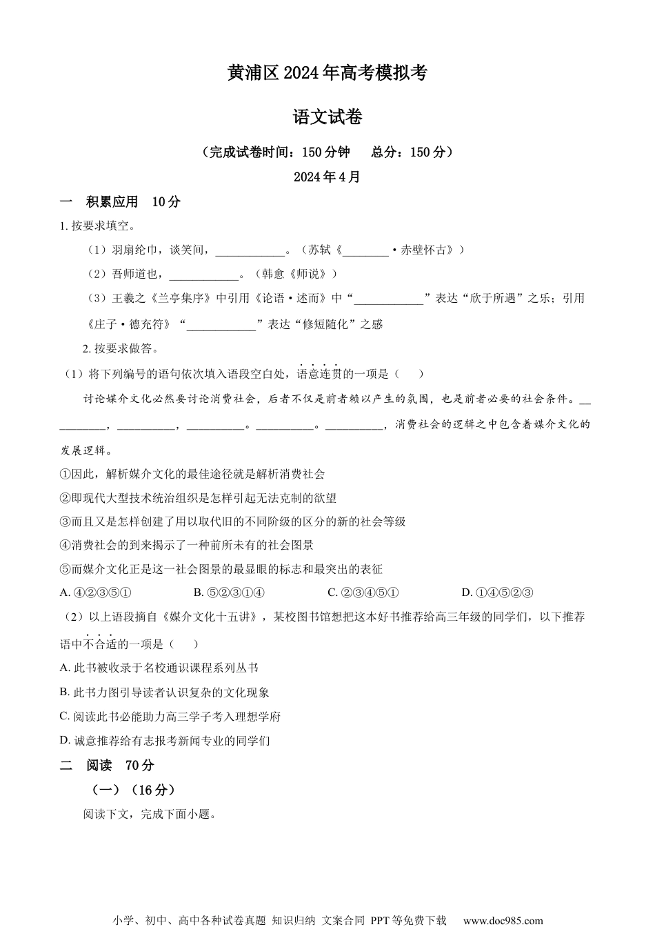 小学、初中、高中各种试卷真题知识归纳文案合同PPT等免费下载www.doc985.com黄浦区2024年高考模拟考语文试卷(完成试卷时间:150分钟总分:150分)2024年4月一积累应用10分1.按要求填空。(1)羽扇纶巾,谈笑间,____________。(苏轼《________·赤壁怀古》)(2)吾师道也,____________。(韩愈《师说》)(3)王羲之《兰亭集序》中引用《论语·述而》中“____________”表达“欣于所遇”之乐;引用《庄子·德充符》“____________”表达“修短随化”之感。2.按要求做答。(1)将下列编号的语句依次填入语段空白处,语意连贯的一项是()讨论媒介文化必然要讨论消费社会,后者不仅是前者赖以产生的氛围,也是前者必要的社会条件。__________,__________,__________。__________。__________,消费社会的逻辑之中包含着媒介文化的发展逻辑。①因此,解析媒介文化的最佳途径就是解析消费社会②即现代大型技术统治组织是怎样引起无法克制的欲望③而且又是怎样创建了用以取代旧的不同阶级的区分的新的社会等级④消费社会的到来揭示了一种前所未有的社会图景⑤而媒介文化正是这一社会图景的最显眼的标志和最突出的表征A.④②③⑤①B.⑤②③①④C.②③④⑤①D.①④⑤②③(2)以上语段摘自《媒介文化十五讲》,某校图书馆想把这本好书推荐给高三年级的同学们,以下推荐语中不合适的一项是()A.此书被收录于名校通识课程系列丛书B.此书力图引导读者认识复杂的文化现象C.阅读此书必能助力高三学子考入理想学府D.诚意推荐给有志报考新闻专业的同学们二阅读70分(一)(16分)阅读下文,完成下面小题。小学、初中、高中各种试卷真题知识归纳文案合同PPT等免费下载www.doc985.com你是一名高中生,加入了学校的家乡文化课题小组。小组成员共五人,研究时间为一学期,拟定的研究对象是“上海Citywalk(城市漫步)”。目前正在决定选题阶段,组员们设想了以下研究问题备选。为了选出最好的研究问题,请你阅读资料后参与小组讨论。【选题】(1)什么是Citywalk?(2)武康路为什么会成为上海最受欢迎的Citywalk路线之一?(3)除了武康路,上海还有哪些值得推荐的经典Citywalk路线?(4)年轻人在十一假期Citywalk是一种旅游消费降级的表现吗?【资料】①在一个研究的开始,最重要的第一步就是找到一个合适的研究问题。所谓研究问题,简单来说,就是你想通过你的研究来回答关于这个世界某一方面的一个具体学术问题。研究问题不是“论文题目”,也不同于论文的“主题”或“主旨”,而是你在一个研究中非常具体地要去解决的一个问题。它应该以疑问的形式问出来,以问号结尾。一篇学术文章不可能回答一个领域的所有问题,那么你应该为读者指明这样一篇文章的篇幅到底能够回答那个问题的什么方面。学术论文要求作者思路连贯、架构严谨地探讨学术问题的答案,只有当你的问题尽量具体而明确的时候这种探讨才可能成功,才可能有意义。②研究问题从目的上分类,可以分成三大种类型:探索性研究、描述性研究和解释性研究。探索性研究关注“我应该研究什么问题?”;描述性研究关注“如呵描述这个问题?”;解释性研究关注“如呵解释这个问题?”。这三种类型的研究是___________的关系。③探索性研究一般是在某一个问题还没有被清晰定义出来的时候最合适的一种研究目的。它常常被用于初步了解某个问题的大体情况,探索进行下一步研究的可行性,因此很多前导研究都属于探索性研究。当我们对某一问题有了初步的了解后,就可以进行描述性研究了。与探索性研究不同,描述性研究的目的是通过科学观察具体反映出某一个问题的客观情况。描述性问题经常问的是“什么”“哪里”“什么时间”“什么地点”“什么过程”等问题,把真实情况用系统性的方式呈现出来,而没有试图去解释为什么事实是这样。最常见、最典型的描述性研究就是“人口普查”。解释性研究,顾名思义则是把重点放在去回答“为什么”的问题上。对于一些问题,已经不仅仅需要去客观反应和描述事实了,而是需要依托现有的理论和文献,提出相关的解释变量。因此,解释性研究里一般会设计两个及两个以上的变量,并试图理清这些变量之间的关系。④那...