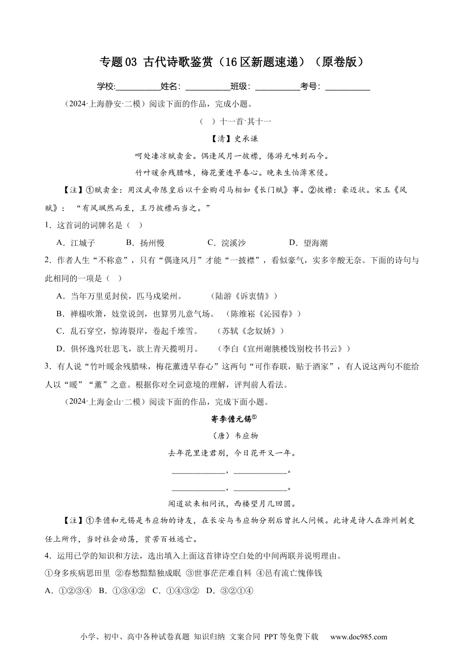 小学、初中、高中各种试卷真题知识归纳文案合同PPT等免费下载www.doc985.com专题03古代诗歌鉴赏(16区新题速递)(原卷版)学校:___________姓名:___________班级:___________考号:___________(2024·上海静安·二模)阅读下面的作品,完成小题。()十一首·其十一【清】史承谦呵处凄凉赋卖金。偶逢风月一披襟,倦游无味到而今。竹叶暖余残腊味,梅花薰透早春心。晚来生怕薄寒侵。【注】①赋卖金:用汉武帝陈皇后以千金购司马相如《长门赋》事。②披襟:豪迈状。宋玉《风赋》:“有风飒然而至,王乃披襟而当之。”1.这首词的词牌名是()A.江城子B.扬州慢C.浣溪沙D.望海潮2.作者人生“不称意”,只有“偶逢风月”才能“一披襟”,看似豪气,实多辛酸无奈。下面的诗句与此相同的一项是()A.当年万里觅封侯,匹马戍梁州。(陆游《诉衷情》)B.禅榻吹箫,妓堂说剑,也算男儿意气场。(陈维崧《沁园春》)C.乱石穿空,惊涛裂岸,卷起千堆雪。(苏轼《念奴娇》)D.俱怀逸兴壮思飞,欲上青天揽明月。(李白《宣州谢朓楼饯别校书书云》)3.有人说“竹叶暖余残腊味,梅花薰透早春心”这两句“可作春联,贴于酒家”,有人说这两句不能给人以“暖”“薰”之意。根据你对全词意境的理解,评判前人看法。(2024·上海金山·二模)阅读下面的作品,完成下面小题。寄李儋元锡①(唐)韦应物去年花里逢君别,今日花开又一年。_____________,_____________。_____________,_____________。闻道欲来相问讯,西楼望月几回圆。【注】①李儋和元锡是韦应物的诗友,在长安与韦应物分别后曾托人问候。此诗是诗人在滁州刺史任上所作,当时社会动荡,贫苦百姓逃亡。4.运用已学的知识和方法,选出填入上面这首律诗空白处的中间两联并说明理由。①身多疾病思田里②春愁黯黯独成眠③世事茫茫难自料④邑有流亡愧俸钱A.①②③④B.①③④②C.①④③②D.③②①④小学、初中、高中各种试卷真题知识归纳文案合同PPT等免费下载www.doc985.com我的选择是(),我的理由是:。5.北宋文人范仲淹读了此诗后,对其中的两句叹为“仁者之言”。你认为是哪两句?请结合诗歌内容加以评析。(2024·上海青浦·二模)阅读下面的作品,完成下面小题。【双调】大德歌·春(元)关汉卿子规啼,不如归,道是春归人未归。几日添憔悴,虚飘飘柳絮飞。一春鱼雁无消息,则见双燕斗衔泥。6.以下对整首作品鉴赏最恰当的一项是()A.意境雄浑壮丽,给人以无限遐想。B.用通俗直白的语言抒发作者心迹。C.诗意层层推进,情感浓郁而深沉。D.写法多变,详尽描绘了宛转情思。7.此曲从多个侧面表现主人公的思念之情。请结合全曲对此加以分析。(2024·上海宝山·二模)阅读下面的诗歌,完成下面小题。客夜有怀(清)吴兆骞一灯愁独卧,永夜客衣单。星月临江静,楼台拂曙寒。悲笳霜外断,清漏梦中残。忽忆西园会,笙歌满玉阑。【注释】①清初诗人,曾因科场案被流放到塞外宁古塔,著有《秋笳集》。②西园会,泛指文人雅集。8.找出与这首诗题材相同的一项()A.王维《山居秋暝》B.陶潜《归园田居》C.李清照《声声慢》D.杜甫《登高》9.下列赏析不正确的一项是()A.一二句点题,以“愁”字总领全篇。B.三四句写夜色静谧,春风拂去寒气。C.五六句写胡笳与刻漏声,以声衬静。D.悲、清、断、残,渲染出凄清氛围。10.结合全诗,鉴赏诗歌结尾两句的构思特点。小学、初中、高中各种试卷真题知识归纳文案合同PPT等免费下载www.doc985.com(2024·上海崇明·二模)阅读下面的诗歌,完成下面小题。十二月十四日夜微雪明日早往南溪小酌至晚苏轼南溪得雪真无价,走马来看及未消。独自披榛寻履迹,最先犯晓过朱桥。谁怜破屋眠无处,坐觉村饥语不嚣。惟有暮鸦知客意,惊飞千片落寒条。11.下列关于本诗的分析不正确的一项是()A.首联直言南溪得雪之难得,抒发对自然美景的赞叹。B.颔联以“独自”探寻的描述,暗含无人相伴的遗憾。C.颈联化用前人诗句,丰富诗句内涵并深化作者情感。D.尾联以拟人手法写暮鸦,巧妙营造物我交融的意境。12.以下是针对本诗主题的讨论,请你参与讨论,说说自己的看法。A:我认为本诗以表现...