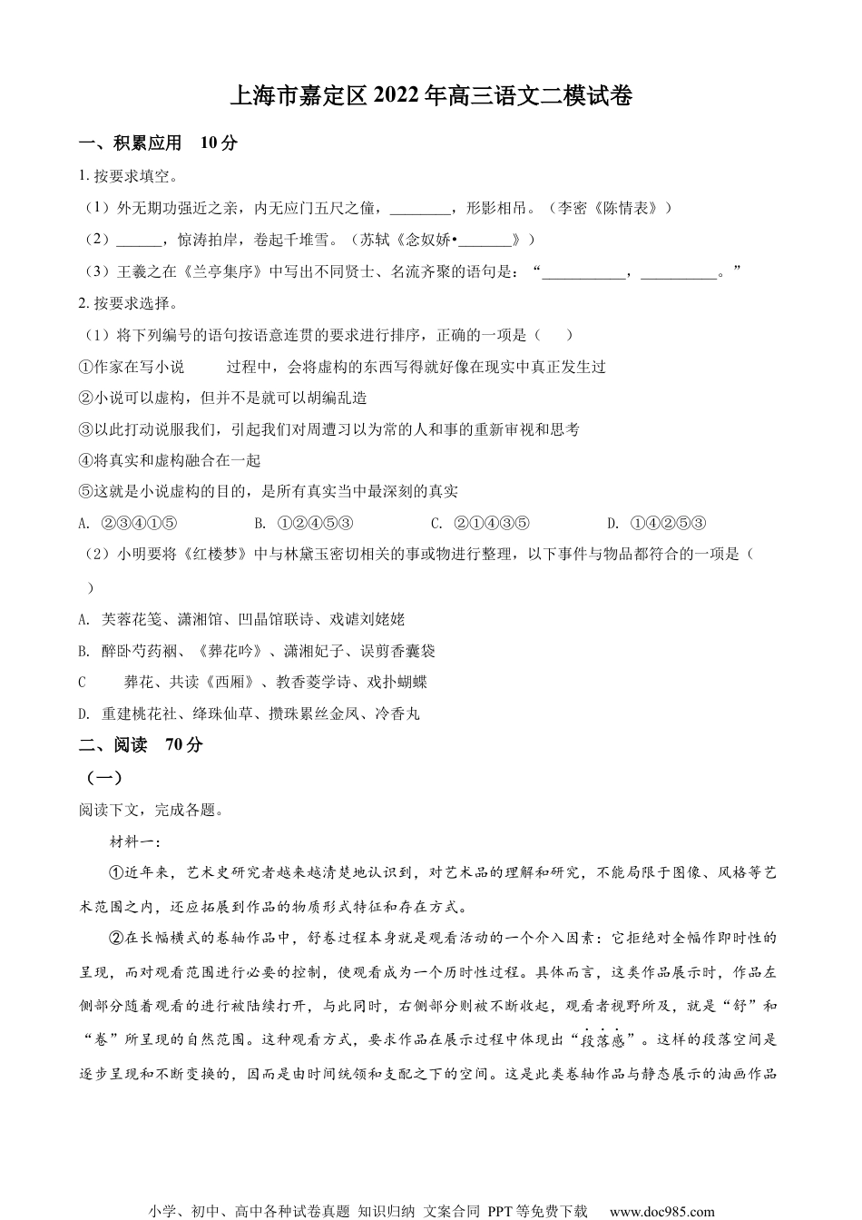 小学、初中、高中各种试卷真题知识归纳文案合同PPT等免费下载www.doc985.com上海市嘉定区2022年高三语文二模试卷一、积累应用10分1.按要求填空。(1)外无期功强近之亲,内无应门五尺之僮,________,形影相吊。(李密《陈情表》)(2)______,惊涛拍岸,卷起千堆雪。(苏轼《念奴娇•_______》)(3)王羲之在《兰亭集序》中写出不同贤士、名流齐聚的语句是:“___________,__________。”2.按要求选择。(1)将下列编号的语句按语意连贯的要求进行排序,正确的一项是()①作家在写小说的过程中,会将虚构的东西写得就好像在现实中真正发生过②小说可以虚构,但并不是就可以胡编乱造③以此打动说服我们,引起我们对周遭习以为常的人和事的重新审视和思考④将真实和虚构融合在一起⑤这就是小说虚构的目的,是所有真实当中最深刻的真实A.②③④①⑤B.①②④⑤③C.②①④③⑤D.①④②⑤③(2)小明要将《红楼梦》中与林黛玉密切相关的事或物进行整理,以下事件与物品都符合的一项是()A.芙蓉花笺、潇湘馆、凹晶馆联诗、戏谑刘姥姥B.醉卧芍药裀、《葬花吟》、潇湘妃子、误剪香囊袋C.葬花、共读《西厢》、教香菱学诗、戏扑蝴蝶D.重建桃花社、绛珠仙草、攒珠累丝金凤、冷香丸二、阅读70分(一)阅读下文,完成各题。材料一:①近年来,艺术史研究者越来越清楚地认识到,对艺术品的理解和研究,不能局限于图像、风格等艺术范围之内,还应拓展到作品的物质形式特征和存在方式。②在长幅横式的卷轴作品中,舒卷过程本身就是观看活动的一个介入因素:它拒绝对全幅作即时性的呈现,而对观看范围进行必要的控制,使观看成为一个历时性过程。具体而言,这类作品展示时,作品左侧部分随着观看的进行被陆续打开,与此同时,右侧部分则被不断收起,观看者视野所及,就是“舒”和“卷”所呈现的自然范围。这种观看方式,要求作品在展示过程中体现出“段落感”。这样的段落空间是逐步呈现和不断变换的,因而是由时间统领和支配之下的空间。这是此类卷轴作品与静态展示的油画作品小学、初中、高中各种试卷真题知识归纳文案合同PPT等免费下载www.doc985.com的重要差别。③卷轴的形制所隐含的既不是无条件的展示,也不是全然不允许观看,它暗示着古代士大夫艺术活动中那种“限制性”的观赏。当作品舒展开来的时候,它面对的不可能是公众,相反,其展示常常带有私密的色彩。艺术品的展示通常是在一个称作“雅集”的小型私人聚会中进行,被邀请的观看者则一般是文人名士。(选自《舒卷的粉墙》有删改姜勇)材料二:①舞蹈诗剧《只此青绿》中由演员饰演的展卷人(文物工作者)对《千里江山图》潜心钻研后“走”入了画家希孟的内心世界,目睹希孟绘制画作,让观众追随展卷人的视角,徜徉在富有传奇色彩的中国传统美学意趣之中。舞台被巧妙设计成多层同心圆,还原了中国传统画卷“展卷”过程。圆环相扣,亦是时空相交。当卷轴在舞台上被缓缓打开,左手拉开了“过去”的时间线,右手推动着未来的新图景,那转动不息的舞台仿若镌刻民族记忆的年轮,引领观者踏入时光的循环里。另外,“圆”是中国传统文化的一个重要精神原型,是揭示中国艺术生命秘密的不可忽视的因素。②正是因为有了展卷人的介入,才能让观众心中《千里江山图》的绘制成功得以成立。观众能够在希孟的喜乐中感受到自身的喜乐,在希孟的无助中感受到自身的无奈,甚至想要冲破时空,回到那个时代,用自己微薄的力量去帮助希孟,帮助他完成这幅画,帮助他解开命运的枷锁,不再被当时的社会所束缚。也正是因为有了展卷人的反复介入,才能让观众清晰地明白:这其实是展卷人的世界。他的“平行时空”里住着希孟,形成一个“我中有你,你中有我”的精神境界,也是一个“我就是你,你就是我”的哲学境界,更是一个“你的目光所及,就是你的人生境界”的人生哲理。特别是在剧目的尾声部分,主人公希孟和展卷人隔空对望的瞬间,这一瞬间碰到了观众心底最柔软的地方。让人明白将个人生命的体会用艺术的方式表达出来,将自己的情感融入并寄托在创作中,把作品视为自己生命的延续后,此时的人性和情感才是艺术创作中最永恒的精神表达。(《新时代,新气...