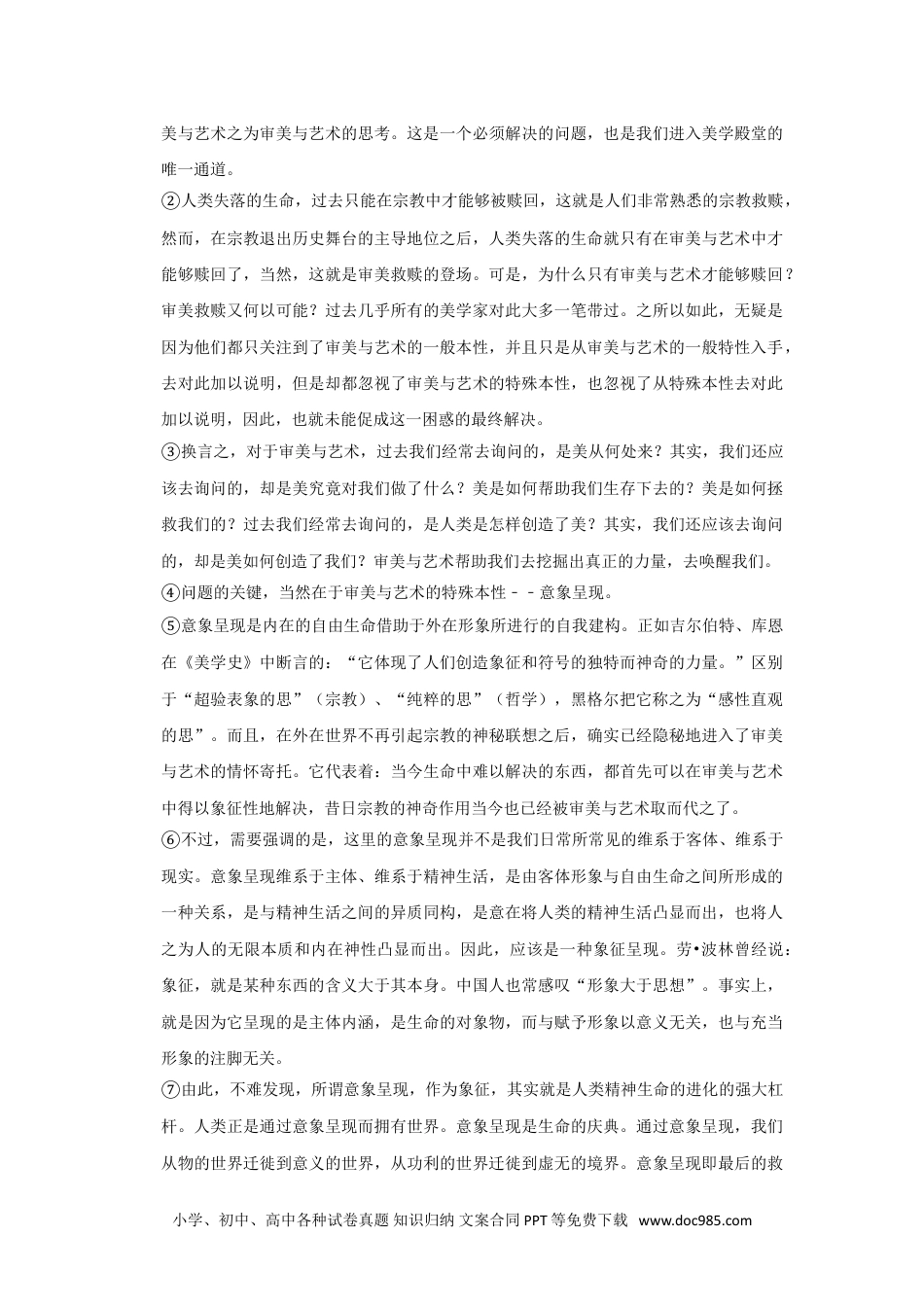 2019年上海市崇明区高考语文一模试卷一、积累应用1.(5分)按要求填空。(1),杜鹃声里斜阳暮。(北宋•秦观《•郴州旅舍》)(2)吾师道也,?(唐•韩愈《师说》)(3)柳永《八声甘州》中“想佳人妆楼颙望,误几回、天际识归舟”一句,从对面着笔抒发情感。杜甫《月夜》中同样采用这一手法的诗句是“,。”2.(2分)下列选项中,名句使用最恰当的一项是()A.小周毕业多年后邂逅当年同窗好友,感慨地说:“曾经沧海难为水,除却巫山不是云。”B.吴先生面对争强好胜、惹是生非的小孙子,谆谆教诲道:“力行近乎仁,知耻近乎勇”。C.郑老师深谙“不愤不启,不悱不发”之道,因此教学中十分注重引导学生自主思考。D.王助理的方案被领导否定,心情郁闷,同事安慰说:“夏虫不可语冰,井蛙不可语海。”3.(3分)下面是某班主任在班会课上的讲话,以下表达最得体的一项是()A.男生寝室昨晚熄灯后聊天,希望你们既往不咎,改正错误。B.本周艺术节大家群策群力取得年级第一好成绩,可喜可贺。C.小刘同学尽管早晨迟到,但原因是他帮助邻居,值得见谅。D.同学们在今后的学习中有问题尽管提出,我定会鼎力相助。二、现代文阅读4.(16分)阅读下文,完成各题。审美救赎何以可能潘知常①对于审美救赎的思考,首先当然应该是审美救赎何谓。同时,还有另外一个重要的领域,就是审美救赎何为。审美救赎何谓,是对于审美救赎的本体属性的回答,审美救赎何为,则是对于审美救赎的审美功能的回答。在这回答的背后,则是对于审美与艺术的生存权、审美与艺术的尊严的回答。当然,这也与我们过去长期以来没有很好地思考这个问题有关。黑格尔说过一句很著名的话:熟知非真知。无疑,这句话用在这里也是非常合适的。显然,对于审美救赎的审美功能的思考,其实就是对审美与艺术的本原、审小学、初中、高中各种试卷真题知识归纳文案合同PPT等免费下载www.doc985.com美与艺术之为审美与艺术的思考。这是一个必须解决的问题,也是我们进入美学殿堂的唯一通道。②人类失落的生命,过去只能在宗教中才能够被赎回,这就是人们非常熟悉的宗教救赎,然而,在宗教退出历史舞台的主导地位之后,人类失落的生命就只有在审美与艺术中才能够赎回了,当然,这就是审美救赎的登场。可是,为什么只有审美与艺术才能够赎回?审美救赎又何以可能?过去几乎所有的美学家对此大多一笔带过。之所以如此,无疑是因为他们都只关注到了审美与艺术的一般本性,并且只是从审美与艺术的一般特性入手,去对此加以说明,但是却都忽视了审美与艺术的特殊本性,也忽视了从特殊本性去对此加以说明,因此,也就未能促成这一困惑的最终解决。③换言之,对于审美与艺术,过去我们经常去询问的,是美从何处来?其实,我们还应该去询问的,却是美究竟对我们做了什么?美是如何帮助我们生存下去的?美是如何拯救我们的?过去我们经常去询问的,是人类是怎样创造了美?其实,我们还应该去询问的,却是美如何创造了我们?审美与艺术帮助我们去挖掘出真正的力量,去唤醒我们。④问题的关键,当然在于审美与艺术的特殊本性﹣﹣意象呈现。⑤意象呈现是内在的自由生命借助于外在形象所进行的自我建构。正如吉尔伯特、库恩在《美学史》中断言的:“它体现了人们创造象征和符号的独特而神奇的力量。”区别于“超验表象的思”(宗教)、“纯粹的思”(哲学),黑格尔把它称之为“感性直观的思”。而且,在外在世界不再引起宗教的神秘联想之后,确实已经隐秘地进入了审美与艺术的情怀寄托。它代表着:当今生命中难以解决的东西,都首先可以在审美与艺术中得以象征性地解决,昔日宗教的神奇作用当今也已经被审美与艺术取而代之了。⑥不过,需要强调的是,这里的意象呈现并不是我们日常所常见的维系于客体、维系于现实。意象呈现维系于主体、维系于精神生活,是由客体形象与自由生命之间所形成的一种关系,是与精神生活之间的异质同构,是意在将人类的精神生活凸显而出,也将人之为人的无限本质和内在神性凸显而出。因此,应该是一种象征呈现。劳•波林曾经说:象征,就是某种东西的含义大于其本身。中国人也常感叹“形象大于思想”。事实上,...