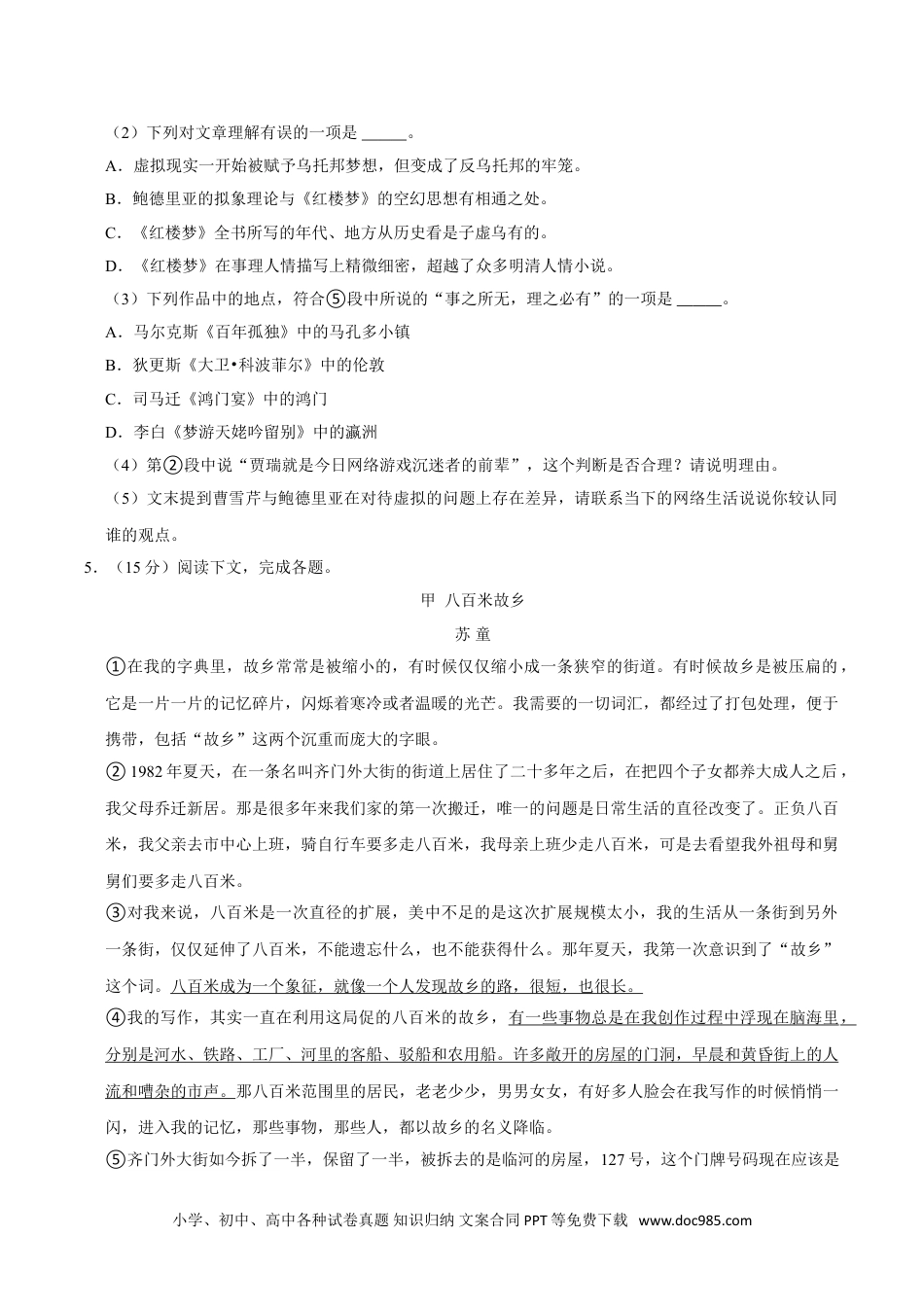 2021-2022学年上海市虹口区高三(上)期末语文试卷(一模)一、积累应用(10分)1.(5分)按要求填空。(1)苟以天下之大,,是又在六国下矣。(苏洵《六国论》)(2)亦余心之所善兮,。(屈原《》)(3)杜甫《登高》中“,”一联,动静结合,构造了一幅冷色调的绝妙画面。2.(3分)学校团委将推送一篇关于校运会的文章,主题是“青春跃动”,副标题是“——记校运会”。以下选项最合适做主标题的是()A.青春须早为,岂能长少年B.雄关真如铁,迈步从头越C.乘风破浪,直挂云帆D.鹰隼试翼,风动云起3.(2分)将下列编号的语句依次填入语段空白处,语意连贯的一项是()随着电脑的计算能力越来越强大,如今的人工智能已经可以在很多具体的工作上轻松超越人类大脑了,_______,_______,_______,_______,换句话说,所有的人工智能都不具备自我意识。①究其原因,机器人缺乏“本体感觉”很可能是最大的差别所在②但是依托于人工智能的机器人却在一些看似很简单的事情上进展缓慢③迄今为止没有任何一台电脑会把芯片、处理器、电源和机箱等看成是自己的一部分④比如跳高或者奔跑,更不用说那些涉及情感的事情了A.④②①③B.②①③④C.②④①③D.②①④③二、阅读(70分)4.(16分)阅读下文,完成各题。①虚拟越来越成为这个时代的重要概念:虚拟经济、虚拟社区、虚拟教育等,我们正在以不同的方式走向各种形态的虚拟。重读《红楼梦》,我们会发现它具有众多的虚拟现实特质,而这正是这部伟大作品历久弥新的原因和意义所在。②在《红楼梦》第十一回中,家境清寒的贾府远亲贾瑞痴迷于凤姐的美色,试图勾引,结果被凤姐毒设相思局,整得死去活来。在他病入膏肓之际,有个跛足道人给他一面名叫“风月宝鉴”的镜子,说是照背面可以保命,但是千万不能照正面。贾瑞拿起镜子,向反面一照,只见一个骷髅立在里面。他又惊又吓,大骂道士,又将正面一照,只见凤姐在里面招手叫他。如此几番下来,终于一命呜呼。临死前贾瑞还对鬼使说:“让我拿了镜子再走”。经过虚拟现实和数码文化洗礼的人,看到这段很容易会产生一小学、初中、高中各种试卷真题知识归纳文案合同PPT等免费下载www.doc985.com种似曾相识的异样感觉。贾瑞就是今日网络游戏沉迷者的前辈。③现代虚拟现实技术是与赛博空间(又译“网络空间”)同步发展的。从一开始,赛博空间被赋予了技术乌托邦的梦想,人们希望通过虚拟化摆脱沉重的肉身的束缚,让精神和梦想在赛博空间自由地飞翔。然而,他们很快就发现事情不那么简单。乌托邦变成了反乌托邦,在那里虚拟不仅象征了自由,也象征了幻象、欺骗和更精致、更难以摆脱的控制。《黑客帝国》的开头,尼奥在寓所与不法分子接头,非法物品藏在一本雕空的书中。微信公众号:沈姐的语文课堂。透过一闪而过的镜头,我们可以看到这本书的名字叫《拟象与仿真》。这是法国后现代主义思想家让•鲍德里亚关于现实与媒介、符号关系的著作。拟象是鲍德里亚创造出来的一个概念,他认为在后工业社会时代,现实已经被符号和象征所替代,而在这些符号和象征背后,依然是无穷无尽的符号和象征。世界越来越变成没有原本的摹本,没有实体的符号,生产出来的真实,也就是说,现实变成了虚拟现实。④鲍德里亚对拟象的表述也让我们想起《红楼梦》中非常有名的一句话,就是太虚幻境入口处牌坊两边的一副对联:“假作真时真亦假,无为有处有还无。”这句话被视为进入《红楼梦》世界的密码,红学家对此众说纷纭。有人认为:《红楼梦》对于男女老少音容笑貌、生活制度、服饰器物的描写非常逼真,但是如果仔细追寻,全书所写的是什么年代、什么地方,却没有一处正面写出的。这不能不使我们惊诧作者运真实于虚构的特殊技巧,这是一种整体性的杜撰。《红楼梦》是中国文学史上最给人逼真感的作品,又是最具有虚拟性的作品,这两者的奇异结合,是其经久不息的魅力和价值所在。⑤脂砚斋评《红楼梦》:“事之所无,理之必有。”《红楼梦》的“理”是什么?《红楼梦》在事理人情的描写方面精微细密,逼真生动。但是,如果仅止于此,《红楼梦》也不过泯然于众多的明清人情小说之中。真正让《红楼梦》光照后世的...