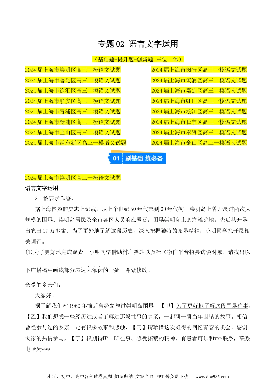 小学、初中、高中各种试卷真题知识归纳文案合同PPT等免费下载www.doc985.com专题02语言文字运用(基础题+提升题+创新题三位一体)2024届上海市崇明区高三一模语文试题2024届上海市闵行区高三一模语文试题2024届上海市普陀区高三一模语文试题2024届上海市黄浦区高三一模语文试题2024届上海市徐汇区高三一模语文试题2024届上海市嘉定区高三一模语文试题2024届上海市静安区高三一模语文试题2024届上海市虹口区高三一模语文试题2024届上海市青浦区高三一模语文试题2024届上海市松江区高三一模语文试题2024届上海市杨浦区高三一模语文试题2024届上海市长宁区高三一模语文试题2024届上海市宝山区高三一模语文试题2024届上海市奉贤区高三一模语文试题2024届上海市浦东新区高三一模语文试题2024届上海市金山区高三一模语文试题2024届上海市崇明区高三一模语文试题语言文字运用2.按要求作答。据上海围垦的史志上记载,从上个世纪50年代末到60年代初,崇明岛上曾开展过两次大规模的围垦。崇明岛居民及全市各区人员响应号召,围垦崇明岛上的海滩荒地,先后共开垦出农田17万多亩。为了更好地了解这段历史,深入把握独特的拓垦精神,小明同学拟开展相关调查。(1)为了更好地完成调查,小明同学借助村广播站以及社区微信平台招募访谈对象,请找出以下广播稿中画线部分表达不得体的一处,并做修改。亲爱的乡亲们:大家好!据了解我们村1960年前后曾经参与过崇明岛围垦,【甲】为了更好地了解这段围垦往事,【乙】我们想找一些经历过或者了解过那段往事的乡亲,一起聊一聊当年围垦的故事。相信曾经参与过的乡亲一定有很多故事和感触,【丙】请珍惜这次难得的回忆青春的机会。感谢大家的热情参与,【丁】很期待听一听往事、感受拓荒的精神。有意者可以和***联系,联系电话为***。小学、初中、高中各种试卷真题知识归纳文案合同PPT等免费下载www.doc985.com【】处,修改:(2)为了营造良好的访谈环境,凸显探寻拓垦精神的访谈目标,小明同学准备了以下标语,请为他选择最合适的一项()A.筚路蓝缕,敢叫日月换新天B.摩顶放踵,拓土开疆志未酬C.披星戴月,俯首甘为孺子牛D.任劳任怨,吹尽狂沙始到金2024届上海市闵行区高三一模语文试题语言文字运用2.按要求作答。(1)将下列编号的语句依次填入语段空白处,语意连贯的一项是()乡土社会之所以形成差序格局,原因之一是________,________,________,________,这就形成了一种按亲疏关系来决定权利义务分配的有差等的顺序。①乡土家族具有伸缩性②长辈在分配利益时会优先考虑亲生晚辈并适时兼顾旁系晚辈③亲生晚辈和旁系晚辈都有可能成为养老送终候选人④乡土社会的养老送终义务在家族内部进行分配A.①②④③B.④①③②C.②①④③D.①④②③(2)下列各句中,人物语言得体的是()A.螃蟹宴时,吃得正欢的鸳鸯对前来的凤姐说:“奶奶又出来做什么?让我们也受用一会子。”B.刘姥姥在王熙凤叹穷的时候说:“俗话说瘦死的骆驼比马大!您老拔根汗毛比我们腰还粗!”C.抄检大观园时,王善保家的将探春的衣襟掀开道:“连姑娘身上我都翻了,果然没有什么。”D.夜宴上,贾赦在给贾母及众人讲笑话时说道:“你不知道天下做父母的,偏心的多着呢!”2024届上海市普陀区高三一模语文试题2.按题目要求选择。(1)将下列编号的语句依次填入语段空白处,语意连贯的一项是()小学、初中、高中各种试卷真题知识归纳文案合同PPT等免费下载www.doc985.com进行文献筛选,,。研究者通过初步浏览,;然后,从中提取出自身课题研究所需要的信息。①对搜索来的文献的价值进行评估、分类并筛选②是为了根据课题研究的目标和内容③对筛选出来的、具有较高价值的文献进行精读④选择符合要求的文献类型和文献篇目A.④②①③B.③①②④C.②④①③D.①③②④(2)小明将代表校文学社,和社团特邀嘉宾王教授进行微信沟通,以下是他草拟的一部分内容,其中有一处画线部分语言表达不得体,请帮他找出并修改。王教授您好!很抱歉,【甲】之前邀请您下周六光临我校,【乙】为我们文学社成员指点迷津,【丙】现在因为和市级辩论赛时间冲突,【丁】我们决定把这个活动推迟到下...