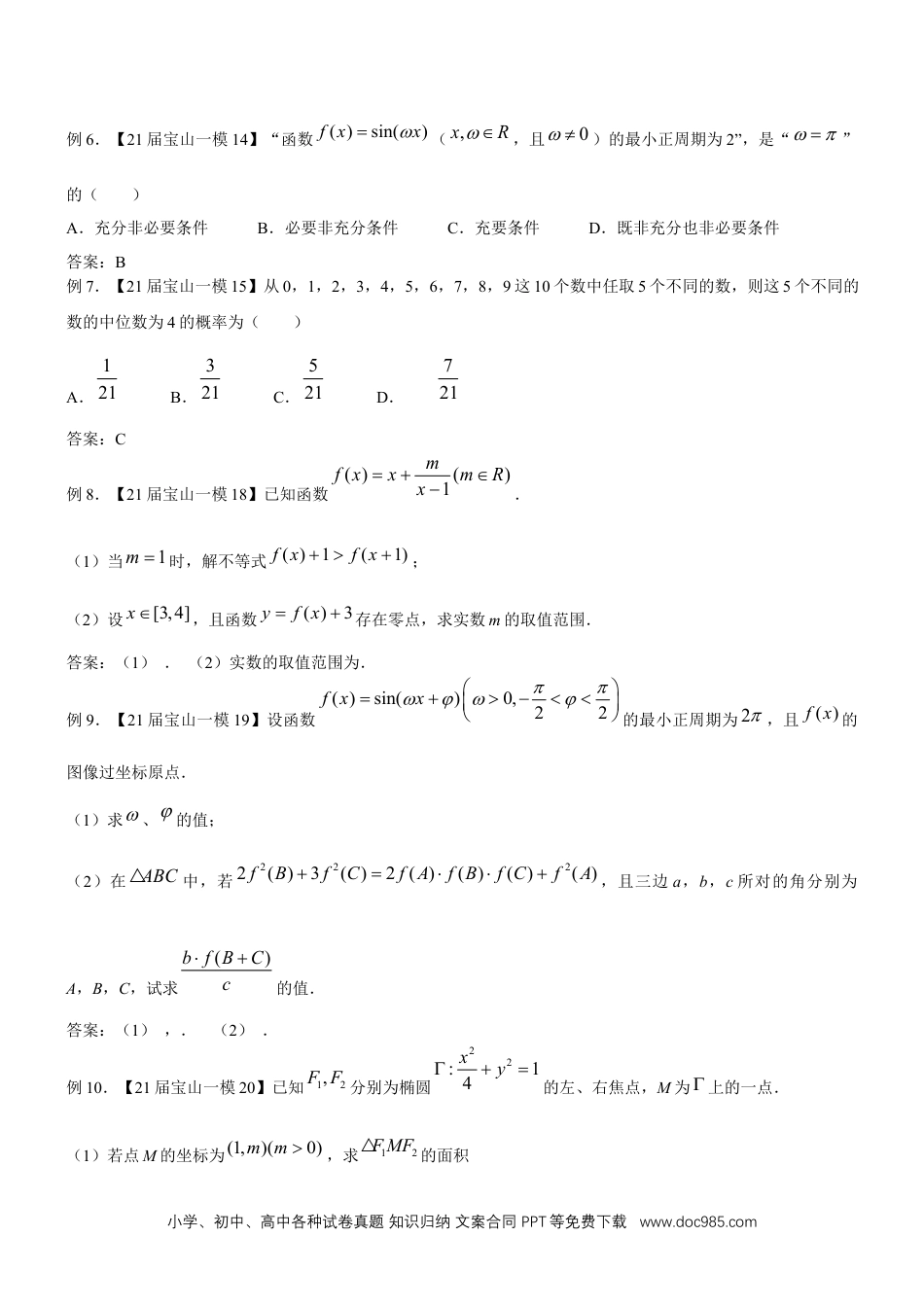 小学、初中、高中各种试卷真题知识归纳文案合同PPT等免费下载www.doc985.com中档题汇编例1.【21届宝山一模7】已知圆锥的底面半径为1,高为,则该圆锥侧面展开图的圆心角的大小为_________.答案:例2.【21届宝山一模8】方程cos2sin0xx在区间[0,]上的所有解的和为__________.答案:例3.【21届宝山一模9】已知函数()fx的周期为2,且当01x时,4()logfxx,那么92f___________.答案:例4.【21届宝山一模10】设数列nx的前n项和为nS,对任意nN,均有1nnSx,则6S___________.答案:例5.【21届宝山一模11】设函数()sin2cos2(,)fxaxbxabR,给出下列的结论:①当0,1ab时,()fx为偶函数;②当1,0ab时,(2)fx在区间0,4上是单调函数;③当3,1ab时,2xf在区间(2,2)上恰有3个零点;④当3,1ab时,设()fx在区间,()4tttR上的最大值为()t,最小值为()t,则()()22tt.则所有正确结论的序号是_________.答案:①④小学、初中、高中各种试卷真题知识归纳文案合同PPT等免费下载www.doc985.com例6.【21届宝山一模14】“函数()sin()fxx(,xR,且0)的最小正周期为2”,是“”的()A.充分非必要条件B.必要非充分条件C.充要条件D.既非充分也非必要条件答案:B例7.【21届宝山一模15】从0,1,2,3,4,5,6,7,8,9这10个数中任取5个不同的数,则这5个不同的数的中位数为4的概率为()A.121B.321C.521D.721答案:C例8.【21届宝山一模18】已知函数()()1mfxxmRx.(1)当1m时,解不等式()1(1)fxfx;(2)设[3,4]x,且函数()3yfx存在零点,求实数m的取值范围.答案:(1).(2)实数的取值范围为.例9.【21届宝山一模19】设函数()sin()0,22fxx的最小正周期为2,且()fx的图像过坐标原点.(1)求、的值;(2)在ABC中,若2222()3()2()()()()fBfCfAfBfCfA,且三边a,b,c所对的角分别为A,B,C,试求()bfBCc的值.答案:(1),.(2).例10.【21届宝山一模20】已知12,FF分别为椭圆22:14xy的左、右焦点,M为上的一点.(1)若点M的坐标为(1,)(0)mm,求12FMF的面积小学、初中、高中各种试卷真题知识归纳文案合同PPT等免费下载www.doc985.com(2)若点M的坐标(0,1),且直线3()5ykxkR与交于两不同点A、B,求证:MAMB�为定值,并求出该定值;(3)如图,设点M的坐标为(,)st,过坐标原点O作圆222:()()Mxsytr(其中r为定值,01r且||sr)的两条切线,分别交于点P,Q,直线,OPOQ的斜率分别记为12,kk.如果12kk为定值,试问:是否存在锐角,使得2||||5secOPOQ?若存在,试求出的一个值;若不存在,请说明理由.答案:(1)32(2)略(3)这样的锐角不存在.例11.【21届崇明一模7】若关于x、y的方程组46132xyaxy无解,则实数a.答案:2例12.【21届崇明一模8】用数字0、1、2、3、4、5组成无重复数字的三位数,其中奇数的个数为.(结果用数值表示)答案:48例13.【21届崇明一模9】若23(2)nab的二项展开式中有一项为412mab,则m.答案:60例14.【21届崇明一模10】设O为坐标原点,直线xa与双曲线2222:1(0,0)xyCabab的两条渐近线分别交小学、初中、高中各种试卷真题知识归纳文案合同PPT等免费下载www.doc985.com于,DE两点,若ODE△的面积为1,则双曲线C的焦距的最小值为.答案:22例15.【21届崇明一模11】已知函数()yfx,对任意xR,都有(2)()fxfxk(k为常数),且当[0,2]x时,2()1fxx,则(2021)f.答案:2例16.【21届崇明一模14】正方体上的点P、Q、R、S是其所在棱的中点,则直线PQ与直线RS异面的图形是()A.B.C.D.答案:B例17.【21届崇明一模15】设{}na为等比数列,则“对于任意的*2,mmmaaN”是“{}na为递增数列”的()A.充分不必要条件B.必要不充分条件C.充分必要条件D.既不充分也不必要条件答案:C例18.【21届崇明一模...