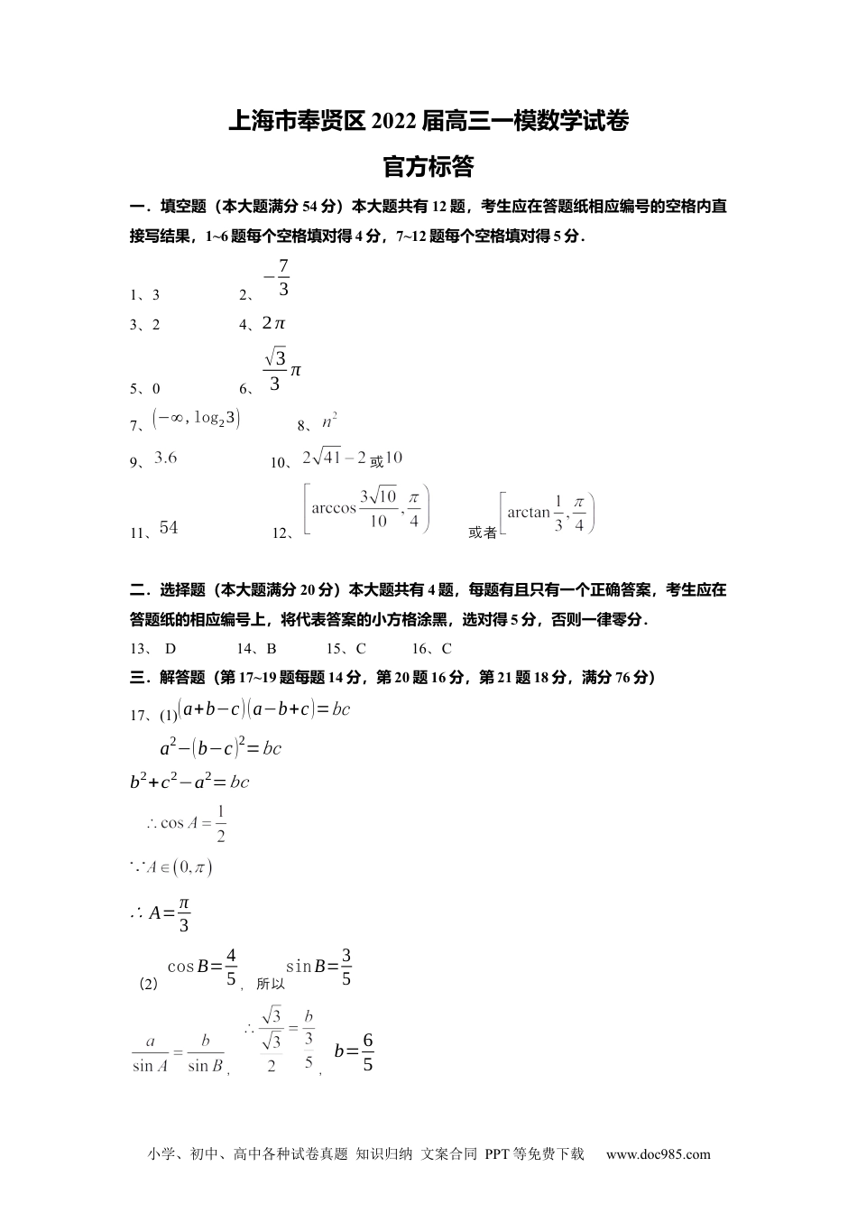 小学、初中、高中各种试卷真题知识归纳文案合同PPT等免费下载www.doc985.com上海市奉贤区2022届高三一模数学试卷官方标答一.填空题(本大题满分54分)本大题共有12题,考生应在答题纸相应编号的空格内直接写结果,1~6题每个空格填对得4分,7~12题每个空格填对得5分.1、32、−733、24、2π5、06、√33π7、(−∞,log23)8、9、10、或11、5412、或者二.选择题(本大题满分20分)本大题共有4题,每题有且只有一个正确答案,考生应在答题纸的相应编号上,将代表答案的小方格涂黑,选对得5分,否则一律零分.13、D14、B15、C16、C三.解答题(第17~19题每题14分,第20题16分,第21题18分,满分76分)17、(1)(a+b−c)(a−b+c)=bca2−(b−c)2=bcb2+c2−a2=bc∴A=π3(2)cosB=45,所以sinB=35,,b=65小学、初中、高中各种试卷真题知识归纳文案合同PPT等免费下载www.doc985.com根据正弦定理得c=asinAsinC=3+4√35所以周长9√3+9518、解:(1),,∴b=2a(2)的面积为2,根据中点性知质的面积为4所以,所以所以面积为,根据曲方程双线为得,点19(1)AE+AF+√AE2+AF2=180x+AF+√x2+AF2=180解得小学、初中、高中各种试卷真题知识归纳文案合同PPT等免费下载www.doc985.com三角形AEF的面积定域义(2)休域面闲区积为令且当仅当t=90√2x=180−90√2,答:当x=180−90√2≈53米,四展休域面最大时个览馆内闲区积为平方米假如只算一三角形或四三角形的休面,个个闲积x=180−90√2≈53米20、接连AC、BD交于点O,由正四的性知道棱锥质OA、OB、OP互相垂直,两两以点O坐原点,分以射为标别线OA、OB、OP为x、轴y、轴z正方向,建立空直轴间角坐系标2分因为|PB|=|AB|=2√2,由勾股定理易知|OA|=|OB|=|OP|=2,而得到有点的从关坐分标别为、B(0,2,0)、C(−2,0,0)、D(0,−2,0)、P(0,0,2)、E(0,−1,1)、F(0,−1,1)所以⃗AE=(−2,1,1),⃗AF=(−2,−1,1),(1)面直设异线与所成角的为,|⃗AE⋅⃗PF|⃗AE||⃗PF||=|−1−1√6⋅√2|=√33所以面直异线与所成角的大小arccos√33;小学、初中、高中各种试卷真题知识归纳文案合同PPT等免费下载www.doc985.com(2)平面设AEGF的法向量⃗n=(u,v,w),由⃗n⋅⃗AE=0与⃗n⋅⃗AF=0,推出系式关−2u+v+w=0与−2u−v+w=0可取u=1,解得v=0,w=2,而得到平面从AEGF的一法向量个⃗n=(1,0,2)平面ABCD的一法向量个⃗m=(0,0,1)而从⃗m⋅⃗n|⃗m||⃗n|=21×√5=2√55平面平面与所成二面角的大小锐为arccos25√5(3)方法一:利用点P到平面AEGF的距离的不同算方法两种计由于P、G、C三点共,且线G在段线PC之间设⃗PG=λ⃗PC(λ>0),⃗PC=(−2,0,−2),⃗PG=(−2λ,0,−2λ),⃗PF=(0,−1,−1)点P到平面AEGF的距离可以算这样计d=|⃗PF⋅⃗n|⃗n||=2√5,也可以算这样计d=|⃗PE⋅⃗n|⃗n||=|−6λ√5|得解得λ=13,所以点是PC的三分之一等分点,且靠近P,即PG=13PC21(1)假设列数{an}是常列,数则所以当,时,与矛盾假,所以设错误列数{an}不可能是常列数(2)①若,列数{an}是常列,数Sn=2n若,列数{an}是常列,数Sn=2(1−qn)1−q②当,时,而从,而从小学、初中、高中各种试卷真题知识归纳文案合同PPT等免费下载www.doc985.com{an}是周期为2的周期列,即数当n偶,数时Sn=n2(2+t2)当n奇,数时(3)明:证猜想是正整数明:因证为bn=2√an2−2>0,则an2=4bn2+2,an+12=4bn+12+2代入an+12=(12an+1an)2,,代入整理得bn+12=bn2(4+2bn2)而从bn2=bn−12(4+2bn−12)(n≥3)于是bn+12=bn2[4+2bn−12(4+2bn−12)]=[2bn(bn−12+1)]2(n≥3)∴bn+1=2bn(bn−12+1)(n≥3)2分因此知,当,由上式可知,b4∈N,b5∈N,依次推,类bn∈N(n>1),即2√an2−2∈N.