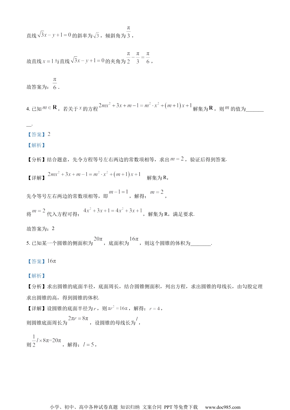 小学、初中、高中各种试卷真题知识归纳文案合同PPT等免费下载www.doc985.com2022学年第一学期高三年级质量调研数学试卷一.填空题(本大题满分54分)本大题共有12题,只要求直接填写结果,前六题每题得4分,后六题每题得5分.第六题有两空,每空2分.1.已知集合,是整数集,则________.【答案】【解析】【分析】先用公式法解绝对值不等式确定集合,再取交集即可.【详解】,故答案为:.2.已知复数,是虚数单位,则的虚部为________.【答案】【解析】【分析】先利用复数的除法法则计算得到,从而求出的虚部.【详解】,故虚部为-1.故答案为:-13.直线与直线的夹角大小为________.【答案】##【解析】【分析】先求出直线的斜率,可得它们的倾斜角,从而求出两条直线的夹角.【详解】因为直线的斜率不存在,倾斜角为,小学、初中、高中各种试卷真题知识归纳文案合同PPT等免费下载www.doc985.com直线的斜率为,倾斜角为,故直线与直线的夹角为,故答案为:.4.已知,若关于的方程解集为,则的值为_________.【答案】【解析】【分析】结合题意,先令方程等号左右两边的常数项相等,求出,验证后得到答案.【详解】的解集为R,先令等号左右两边的常数项相等,即,解得:,将代入方程可得:,解集为R,满足要求.故答案为:25.已知某一个圆锥的侧面积为,底面积为,则这个圆锥的体积为________.【答案】【解析】【分析】求出圆锥的底面半径,底面周长,结合圆锥侧面积,列出方程,求出圆锥的母线长,由勾股定理求出圆锥的高,得到圆锥的体积.【详解】设圆锥的底面半径为,则,解得:,则圆锥底面周长为,设圆锥的母线长为,则,解得:,小学、初中、高中各种试卷真题知识归纳文案合同PPT等免费下载www.doc985.com由勾股定理得:,故圆锥的体积为.故答案为:.6.某果园种植了棵苹果树,随机抽取的棵果树的产量(单位:千克)分别为:242536272832202629302633据此预计,该果园的总产量为_______千克以及第百分位数为_______千克.【答案】①..②【解析】【分析】先计算样本的平均数,然后再估计整体总产量,找出样本的第八与第九的均值表示第百分位数【详解】(千克),所以总产量:千克;样本总共有12个数,所以,只需找出第9个数字和第10个数字取平均数即可,从小到大排列后第九个数字为30,第十个数字为32,所以第75百分位数为:31故答案为:2800;31.7.已知常数,在的二项展开式中,项的系数等于,则_______.【答案】【解析】小学、初中、高中各种试卷真题知识归纳文案合同PPT等免费下载www.doc985.com【分析】首先根据展开式中存在一项可知,然后根据二项式展开式的通式结合已知条件列出关于的方程,解方程即可求出参数的值.【详解】根据已知条件是二项式展开式的某一项,故得.由,令,得.得,根据已知可得,解得,即.故答案为:.8.若函数的值域是,则此函数的定义域为___________.【答案】【解析】【分析】分类讨论分两种情况解不等式即可.【详解】当时,当时,故答案为:9.如图为正六棱柱.其个侧面的条面对角线所在直线中,与直线异面的共有______条.【答案】【解析】小学、初中、高中各种试卷真题知识归纳文案合同PPT等免费下载www.doc985.com【分析】作出辅助线,得到四点共面,不是异面直线,同理得到与共面,再由,与相交,得到与不是异面直线的面对角线,从而得到与异面的面对角线,求出答案.【详解】连接,因为六边形为正六边形,所以,故,所以四点共面,不是异面直线,同理可得:与共面,不是异面直线,而,又与相交,故条面对角线中,与不是异面直线的面对角线为,其余面对角线均与异面,分别为,共5条.故答案为:510.关于的方程的解集为_________.【答案】【解析】【分析】利用绝对值三角不等式,转化原方程,解不等式得到方程的解集.【详解】由绝对值三角不等式可得:,小学、初中、高中各种试卷真题知识归纳文案合同PPT等免费下载www.doc985.com当且仅当,即时,等号成立,故的解集为.故答案为:.11.在空间直角坐标系中,点,点,点,则在方向上的投影向量的坐标为_________.【答案】【解析】【分析】先求出和的坐标,再根据投影向量的定义可得答案.【详解】依题意:所以在方向...