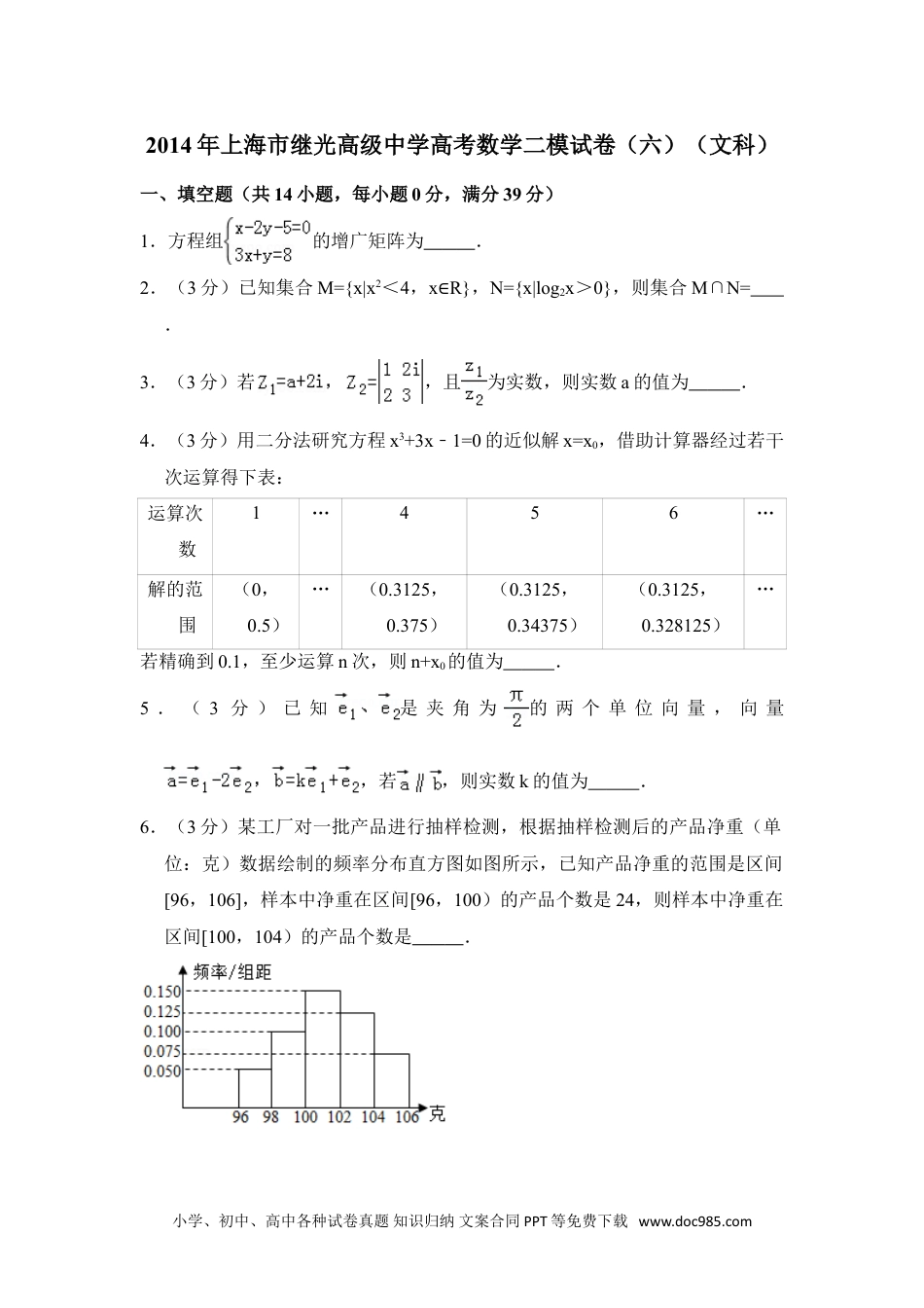 2014年上海市继光高级中学高考数学二模试卷(六)(文科)一、填空题(共14小题,每小题0分,满分39分)1.方程组的增广矩阵为.2.(3分)已知集合M={x|x2<4,x∈R},N={x|log2x>0},则集合M∩N=.3.(3分)若,且为实数,则实数a的值为.4.(3分)用二分法研究方程x3+3x﹣1=0的近似解x=x0,借助计算器经过若干次运算得下表:运算次数1…456…解的范围(0,0.5)…(0.3125,0.375)(0.3125,0.34375)(0.3125,0.328125)…若精确到0.1,至少运算n次,则n+x0的值为.5.(3分)已知是夹角为的两个单位向量,向量,若,则实数k的值为.6.(3分)某工厂对一批产品进行抽样检测,根据抽样检测后的产品净重(单位:克)数据绘制的频率分布直方图如图所示,已知产品净重的范围是区间[96,106],样本中净重在区间[96,100)的产品个数是24,则样本中净重在区间[100,104)的产品个数是.小学、初中、高中各种试卷真题知识归纳文案合同PPT等免费下载www.doc985.com7.(3分)一个圆锥的底面积为4π,且该圆锥的母线与底面所成的角为,则该圆锥的侧面积为.8.(3分)公差为d,各项均为正整数的等差数列{an}中,若a1=1,an=65,则n+d的最小值等于.9.(3分)设双曲线x2﹣y2=6的左右顶点分别为A1、A2,P为双曲线右支上一点,且位于第一象限,直线PA1、PA2的斜率分别为k1、k2,则k1•k2的值为.10.(3分)设△ABC的三个内角A、B、C所对的边长依次为a、b、c,若△ABC的面积为S,且S=a2﹣(b﹣c)2,则=.11.(3分)袋中装有7个大小相同的小球,每个小球上标记一个正整数号码,号码各不相同,且成等差数列,这7个号码的和为49,现从袋中任取两个小球,则这两个小球上的号码均小于7的概率为.12.(3分)设f(x)=ax2+bx,且1≤f(﹣1)≤2,2≤f(1)≤4,则f(2)的最大值为.13.(3分)已知△ABC的重心为O,AC=6,BC=7,AB=8,则=.14.(3分)设f(x)是定义在R上的函数,若f(0)=,且对任意的x∈R,满足f(x+2)﹣f(x)≤3x,f(x+4)﹣f(x+2)≥9×3x,则f(8)=.二、选择题(共4小题,每小题3分,满分12分)15.(3分)二项式展开式中x4的系数为()A.15B.﹣15C.6D.﹣616.(3分)在△ABC中,“”是“△ABC是钝角三角形”的()A.充分不必要条件B.必要不充分条件C.充要条件D.既不充分也不必要条件17.(3分)设函数,则函数f(x)的最小学、初中、高中各种试卷真题知识归纳文案合同PPT等免费下载www.doc985.com小值是()A.﹣1B.0C.D.18.(3分)给出下列四个命题:①如果复数z满足|z+i|+|z﹣i|=2,则复数z在复平面的对应点的轨迹是椭圆.②若对任意的n∈N*,(an+1﹣an﹣1)(an+1﹣2an)=0恒成立,则数列{an}是等差数列或等比数列.③设f(x)是定义在R上的函数,且对任意的x∈R,|f(x)|=|f(﹣x)|恒成立,则f(x)是R上的奇函数或偶函数.④已知曲线和两定点E(﹣5,0)、F(5,0),若P(x,y)是C上的动点,则||PE|﹣|PF||<6.上述命题中错误的个数是()A.1B.2C.3D.4三、解答题(共5小题,满分74分)19.(12分)如图,在直三棱柱ABC﹣A1B1C1中,,AB=AC=2,AA1=6,点E、F分别在棱AA1、CC1上,且AE=C1F=2.(1)求三棱锥A1﹣B1C1F的体积;(2)求异面直线BE与A1F所成的角的大小.20.(14分)如图,在半径为20cm的半圆形(O为圆心)铝皮上截取一块矩形材料ABCD,其中点A、B在直径上,点C、D在圆周上.(1)请你在下列两个小题中选择一题作答即可:小学、初中、高中各种试卷真题知识归纳文案合同PPT等免费下载www.doc985.com①设∠BOC=θ,矩形ABCD的面积为S=g(θ),求g(θ)的表达式,并写出θ的范围.②设BC=x(cm),矩形ABCD的面积为S=f(x),求f(x)的表达式,并写出x的范围.(2)怎样截取才能使截得的矩形ABCD的面积最大?并求最大面积.21.(14分)已知椭圆E的中心在坐标原点O,焦点在坐标轴上,且经过两点.(1)求椭圆E的方程;(2)若平行于OM的直线l在y轴上的截距为b(b<0),直线l交椭圆E于两个不同点A、B,直线MA与MB的斜率分别为k1、k2,求证:k1+k2=0.22.(16分)已知函数.(1)当a=1时,指出f(x)的单调递减区间...