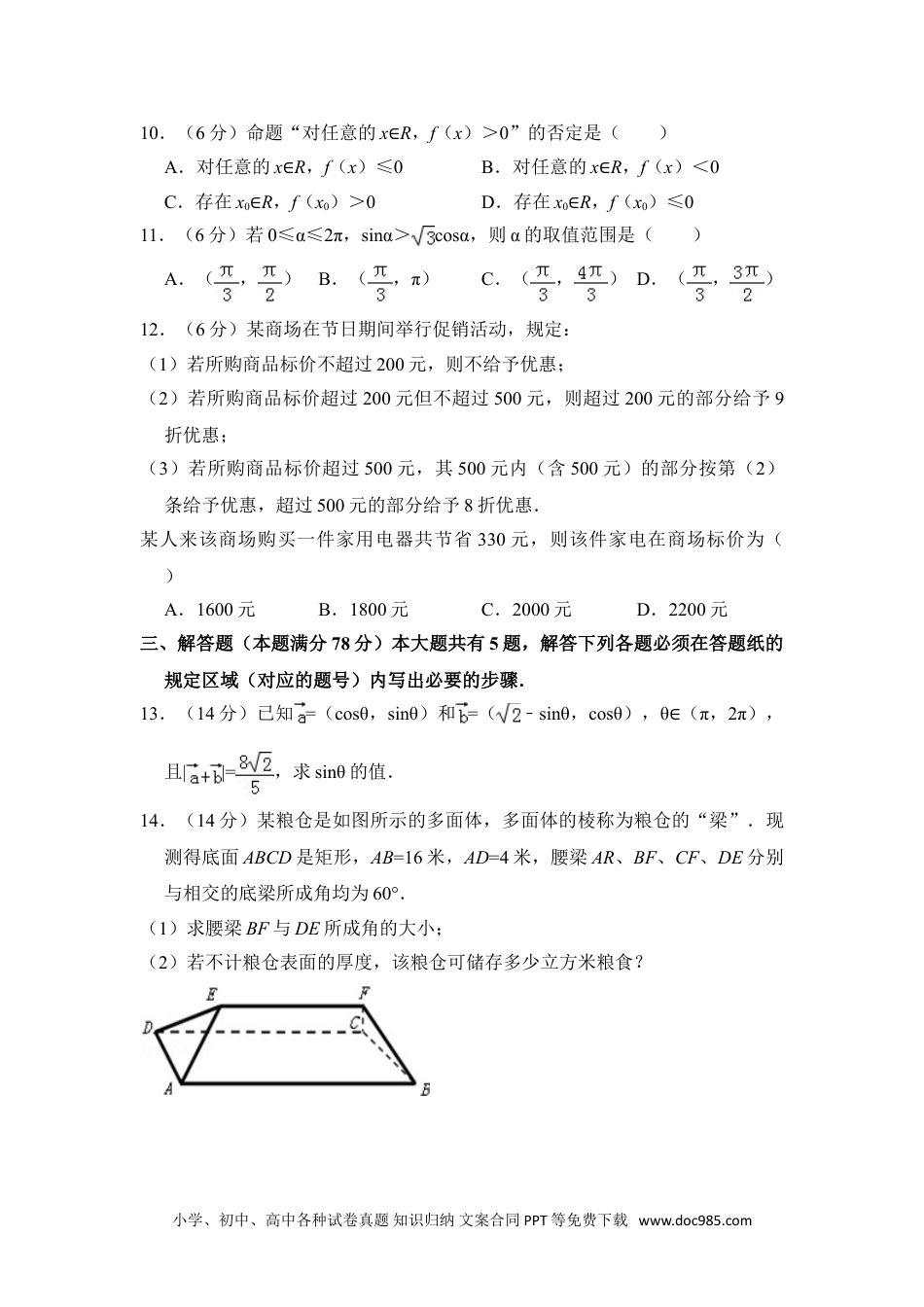 2013年上海市闸北区高考数学二模试卷(文科)一、填空题(54分)本大题共有9题,要求在答题纸相应题序的空格内直接填写结果,每个空格填对得6分,否则一律得零分.1.(6分)设为虚数单位,集合A={1,﹣1,i,﹣i},集合,则A∩B=.2.(6分)在平面直角坐标系xOy中,以向量=(a1,a2),=(b1,b2)为邻边的平行四边形的面积为.3.(6分)(1+2x)3(1﹣x)4展开式中x6的系数为.4.(6分)过原点且与向量=垂直的直线被圆x2+y2﹣4y=0所截得的弦长为.5.(6分)甲、乙两人从4门课程中各选修2门.则甲.乙所选的课程中至少有1门不相同的选法共有种.6.(6分)设0,a1=2cosθ,an+1=,则数列{an}的通项公式an=.7.(6分)已知函数f(x)=,若f(f(x0))=3,则x0=.8.(6分)设对所有实数x,不等式>0恒成立,则a的取值范围为.9.(6分)现有一个由长半轴为2,短半轴为1的椭圆绕其长轴按一定方向旋转180°所形成的“橄榄球面”.已知一个以椭圆的长轴为轴的圆柱内接于该橄榄球面,则这个圆柱的侧面积的最大值是.二、选择题(18分)本大题共有3题,每题都给出四个结论,其中有且只有一个结论是正确的,必须把答题纸上相应题序内的正确结论代号涂黑,选对得6分,否则一律得零分.小学、初中、高中各种试卷真题知识归纳文案合同PPT等免费下载www.doc985.com10.(6分)命题“对任意的x∈R,f(x)>0”的否定是()A.对任意的x∈R,f(x)≤0B.对任意的x∈R,f(x)<0C.存在x0∈R,f(x0)>0D.存在x0∈R,f(x0)≤011.(6分)若0≤α≤2π,sinα>cosα,则α的取值范围是()A.(,)B.(,π)C.(,)D.(,)12.(6分)某商场在节日期间举行促销活动,规定:(1)若所购商品标价不超过200元,则不给予优惠;(2)若所购商品标价超过200元但不超过500元,则超过200元的部分给予9折优惠;(3)若所购商品标价超过500元,其500元内(含500元)的部分按第(2)条给予优惠,超过500元的部分给予8折优惠.某人来该商场购买一件家用电器共节省330元,则该件家电在商场标价为()A.1600元B.1800元C.2000元D.2200元三、解答题(本题满分78分)本大题共有5题,解答下列各题必须在答题纸的规定区域(对应的题号)内写出必要的步骤.13.(14分)已知=(cosθ,sinθ)和=(﹣sinθ,cosθ),θ∈(π,2π),且||=,求sinθ的值.14.(14分)某粮仓是如图所示的多面体,多面体的棱称为粮仓的“梁”.现测得底面ABCD是矩形,AB=16米,AD=4米,腰梁AR、BF、CF、DE分别与相交的底梁所成角均为60°.(1)求腰梁BF与DE所成角的大小;(2)若不计粮仓表面的厚度,该粮仓可储存多少立方米粮食?小学、初中、高中各种试卷真题知识归纳文案合同PPT等免费下载www.doc985.com15.(16分)设定义域为R的函数f(x)=为偶函数,其中a为实常数.(1)求a的值,指出并证明该函数的其它基本性质;(2)请你选定一个区间D,求该函数在区间D上的反函数f﹣1(x).16.(16分)设数列{an}与{bn}满足:对任意n∈N+,都有ban﹣2n=(b﹣1)Sn,bn=an﹣n•2n﹣1.其中Sn为数列{an}的前n项和.(1)当b=2时,求{bn}的通项公式,进而求出{an}的通项公式;(2)当b≠2时,求数列{an}的通项an以及前n项和Sn.17.(18分)在平面直角坐标系xOy中,已知曲线C1为到定点F(,)的距离与到定直线l1:x+y+=0的距离相等的动点P的轨迹,曲线C2是由曲线C1绕坐标原点O按顺时针方向旋转45°形成的.(1)求曲线C1与坐标轴的交点坐标,以及曲线C2的方程;(2)过定点M(m,0)(m>0)的直线l2交曲线C2于A、B两点,点N是点M关于原点的对称点.若=λ,证明:⊥(﹣λ).小学、初中、高中各种试卷真题知识归纳文案合同PPT等免费下载www.doc985.com2013年上海市闸北区高考数学二模试卷(文科)参考答案与试题解析一、填空题(54分)本大题共有9题,要求在答题纸相应题序的空格内直接填写结果,每个空格填对得6分,否则一律得零分.1.(6分)设为虚数单位,集合A={1,﹣1,i,﹣i},集合,则A∩B={﹣1,i}.【考点】1E:交集及其运算;A1:虚数单位i、复数.菁优网版权所有【专题】11:计算题.【分析】利用...