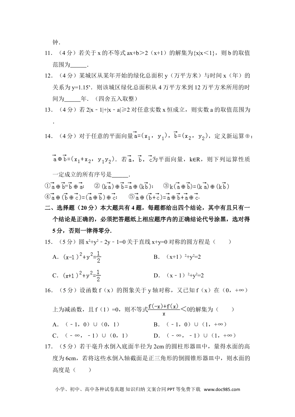 2012年上海市闸北区高考数学二模试卷(理科)一、填空题(56分)本大题共有14题,要求在答题纸相应题序的空格内直接填写结果,每个空格填对得4分,否则一律得零分.1.(4分)设复数z满足i(z﹣1)=3﹣z,其中i为虚数单位,则|z|=.2.(4分)计算=.3.(4分)设f(x)=(x﹣1)2(x≤1),则f﹣1(4)=.4.(4分)若以为增广矩阵的线性方程组有唯一一组解,则实数a的取值范围为.5.(4分)在的二项展开式中,x3的系数是(用数字作答).6.(4分)从一堆苹果中任取5只,称得它们的质量为(单位:克):125124121123127,则该样本标准差s=(克)(用数字作答).7.(4分)已知曲线C1,C2的极坐标方程分别为ρcosθ=3,,则曲线C1与C2交点的极坐标为.8.(4分)设定点A(﹣1,﹣2)、B(1,2),动点P(x,y)满足:,则动点P的轨迹方程为.9.(4分)设直线m与平面α相交但不垂直,则下列所有正确的命题序号是.①在平面α内有且只有一条直线与直线m垂直;②与直线m平行的直线不可能与平面α垂直;③与直线m垂直的直线不可能与平面α平行;④与直线m平行的平面不可能与平面α垂直.10.(4分)某校学生在上学路上要经过2个路口,假设在各路口是否遇到红灯是相互独立的,遇到红灯的概率都是,遇到红灯时停留的时间都是2分钟.则该校某个学生在上学路上因遇到红灯停留的总时间ξ的均值等于分小学、初中、高中各种试卷真题知识归纳文案合同PPT等免费下载www.doc985.com钟.11.(4分)若关于x的不等式ax+b>2(x+1)的解集为{x|x<1},则b的取值范围为.12.(4分)某城区从某年开始的绿化总面积y(万平方米)与时间x(年)的关系为y=1.15x.则该城区绿化总面积从4万平方米到12万平方米所用的时间为年.(四舍五入取整)13.(4分)若2|x﹣1|+|x﹣a|≥2对任意实数x恒成立,则实数a的取值范围为.14.(4分)对于任意的平面向量,定义新运算⊕:.若为平面向量,k∈R,则下列运算性质一定成立的所有序号是.①=;②;③④;⑤.二、选择题(20分)本大题共有4题,每题都给出四个结论,其中有且只有一个结论是正确的,必须把答题纸上相应题序内的正确结论代号涂黑,选对得5分,否则一律得零分.15.(5分)圆x2+y2﹣2y﹣1=0关于直线x+y=0对称的圆方程是()A.B.(x+1)2+y2=2C.D.(x﹣1)2+y2=216.(5分)设函数f(x)的图象关于y轴对称,又已知f(x)在(0,+∞)上为减函数,且f(1)=0,则不等式的解集为()A.(﹣1,0)∪(0,1)B.(﹣1,0)∪(1,+∞)C.(﹣∞,﹣1)∪(0,1)D.(﹣∞,﹣1)∪(1,+∞)17.(5分)若干毫升水倒入底面半径为2cm的圆柱形器皿中,量得水面的高度为6cm,若将这些水倒入轴截面是正三角形的倒圆锥形器皿中,则水面的高度是()小学、初中、高中各种试卷真题知识归纳文案合同PPT等免费下载www.doc985.comA.B.6cmC.D.18.(5分)设{an}是公比为q的等比数列,首项,对于n∈N*,,当且仅当n=4时,数列{bn}的前n项和取得最大值,则q的取值范围为()A.B.(3,4)C.D.三、解答题(本题满分74分)本大题共有5题,解答下列各题必须在答题纸的规定区域(对应的题号)内写出必要的步骤.19.(12分)如图,菱形ABCD中,AB=AC=1,其对角线的交点为O,现将△ADC沿对角线AC向上翻折,使得OD⊥OB.在四面体ABCD中,E在AB上移动,点F在DC上移动,且AE=CF=a(0≤a≤1).(1)求线段EF的最大值与最小值;(2)当线段EF的长最小时,求异面直线AC与EF所成角θ的大小.20.(14分)已知函数f(x)=cos2(x+),g(x)=1+sin2x.(1)设x0是函数y=f(x)的一个零点,求g(x0)的值;(2)求函数h(x)=f(x)+g(x)的单调递增区间.21.(14分)某市一家庭一月份、二月份、三月份天然气用量和支付费用如表所示:月份用气量(立方米)支付费用(元)一48二2038小学、初中、高中各种试卷真题知识归纳文案合同PPT等免费下载www.doc985.com三2650该市的家用天然气收费方法是:天然气费=基本费+超额费+保险费.现已知,在每月用气量不超过A立方米时,只交基本费6元;每户的保险费是每月C元(C≤5);用气量超过A立方米时,超过部分每立方米付B元....