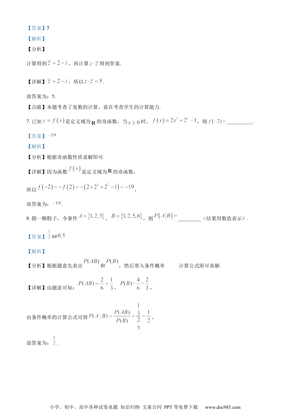 小学、初中、高中各种试卷真题知识归纳文案合同PPT等免费下载www.doc985.com2023届金山区高三二模数学试卷2023.04一、填空题(本大题共有12题,满分54分,第1-6题每题4分,第7-12题每题5分)考生应在答题纸的相应位置直接填写结果.1.已知集合,集合,若,则_________.【答案】【解析】【分析】根据题意得到,代入集合B,结合元素的互异性,即可求解.【详解】由题意,集合,又因为,所以,则,故答案为:.2.若实数满足不等式,则的取值范围是__________.【答案】【解析】【分析】利用一元二次不等式的解法求解即可.【详解】不等式,即,解得,则的取值范围是.故答案为:.3.双曲线的渐近线方程是___________.【答案】【解析】【分析】直接由双曲线的方程求解即可【详解】因为双曲线方程为,小学、初中、高中各种试卷真题知识归纳文案合同PPT等免费下载www.doc985.com所以双曲线的渐近线方程为,即,故答案为:4.已知向量,向量,则与的夹角的大小为__________.【答案】【解析】【分析】利用向量夹角的坐标表示来求解.【详解】因为,,所以,因为,所以.故答案为:.5.在的二项展开式中,项的系数为_________(结果用数值表示).【答案】【解析】【分析】根据二项式展开式的通项即可求解.【详解】由二项式展开式的通项可知,令,可得,所以项的系数为,故答案为:.6.设复数,其中为虚数单位,则_________.小学、初中、高中各种试卷真题知识归纳文案合同PPT等免费下载www.doc985.com【答案】5【解析】【分析】计算得到,再计算得到答案.【详解】,所以.故答案为:5.【点睛】本题考查了复数的计算,意在考查学生的计算能力.7.已知是定义域为的奇函数,当时,,则__________.【答案】【解析】【分析】根据奇函数性质求解即可.【详解】因为函数是定义域为的奇函数,所以,故答案为:.8.掷一颗骰子,令事件,,则_________(结果用数值表示).【答案】##【解析】【分析】根据题意先求出和,然后带入条件概率的计算公式即可求解.【详解】由题意可知:,,由条件概率的计算公式可得,故答案为:.小学、初中、高中各种试卷真题知识归纳文案合同PPT等免费下载www.doc985.com9.已知正实数满足,则的最小值为__________.【答案】【解析】【分析】因为,展开利用基本不等式求解即可.【详解】因为正实数满足,所以,当且仅当即时等号成立,所以的最小值为.故答案为:.10.若函数(常数)在区间没有最值,则的取值范围是__________.【答案】【解析】【分析】根据题意先求出的取值范围,然后根据题意列出不等式,解之即可求解.【详解】因为,,所以,又因为函数(常数)在区间没有最值,所以,解得,所以的取值范围是小学、初中、高中各种试卷真题知识归纳文案合同PPT等免费下载www.doc985.com故答案为:.11.已知函数和的表达式分别为,,若对任意,若存在,使得,则实数的取值范围是__________.【答案】【解析】【分析】将问题转化为,由二次函数性质可求得在上的最大值为,分别在、和的情况下,结合导数讨论的单调性,从而得到,由可构造不等式求得的范围.【详解】对任意,若存在,使得,;当时,,在上单调递增,在上单调递减,;当时,,①当时,,,则在上恒成立,在上单调递增,,,解得:,;②当时,,,令,解得:,小学、初中、高中各种试卷真题知识归纳文案合同PPT等免费下载www.doc985.com(i)当,即时,在上恒成立,在上单调递减,,,解得:,;(ii)当,即时,在上恒成立,在上单调递增,,,解得:(舍);(iii)当,即时,若,则;若,则;在上单调递增,在上单调递减,,,解得:(舍);③当时,,,当时,;当时,;在上单调递减,在上单调递增,,,,当,即时,,小学、初中、高中各种试卷真题知识归纳文案合同PPT等免费下载www.doc985.com,解得:,;当,即时,,,解得:,;综上所述:实数的取值范围为.故答案为:.12.已知、、、都是平面向量,且,若,则的最小值为__________.【答案】##【解析】【分析】根据题意作出图形,利用数形结合即可求解.【详解】如图,设,,,,,则点在以为圆心,以为半径的圆上,点在以为圆心,以为半径的圆上,,所以点在射线上,所以,作点关于...