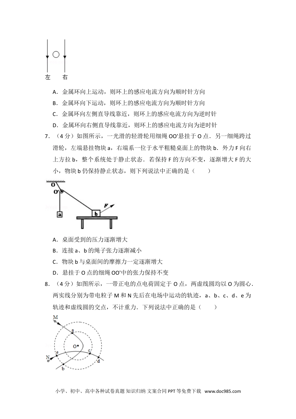 2017年上海市虹口区高考物理一模试卷一、选择题(共10小题,每小题只有一个正确选项.每题4分,共40分.)1.(4分)下列叙述中符合物理学史实的是()A.伽利略发现了单摆的周期公式B.奥斯特发现了电磁感应现象C.库仑通过扭秤实验得出了电荷间相互作用的规律D.牛顿通过斜面理想实验得出了维持运动不需要力的结论2.(4分)如图所示,弹簧振子在M、N之间做简谐运动.以平衡位置O为原点,建立Ox轴.向右为x的轴的正方向.若振子位于N点时开始计时,则其振动图象为()A.B.C.D.3.(4分)如图所示,一偏心轮绕垂直纸面的轴O匀速转动,a和b是轮上质量相等的两个质点,则偏心轮转动过程中a、b两质点()A.角速度大小相同B.线速度大小相同C.向心加速度大小相同D.向心力大小相同4.(4分)中国宋代科学家沈括在《梦溪笔谈》中最早记载了地磁偏角:“以小学、初中、高中各种试卷真题知识归纳文案合同PPT等免费下载www.doc985.com磁石磨针锋,则能指南,然常微偏东,不全南也.”进一步研究表明,地球周围地磁场的磁感线分布示意如图,则下列说法中不正确的是()A.地理南、北极与地磁场的南、北极不重合B.地球内部也存在磁场,地磁南极在地理北极附近C.地球表面任意位置的地磁场方向都与地面平行D.形成地磁场的原因可能是带负电的地球自转引起的5.(4分)三个点电荷附近的电场线分布如图所示,c是电量相等的两个负电荷连线的中点,d点在正电荷的正上方,c、d到正电荷的距离相等,则()A.c点的电场强度为零B.b、d两点的电场强度不同C.a点的电势比b点的电势高D.c点的电势与d点的电势相等6.(4分)如图,一圆形金属环与两固定的平行长直导线在同一竖直平面内,环的圆心与两导线距离相等,环的直径小于两导线间距.两导线中通有大小相等、方向向下的恒定电流.以下说法正确的是()小学、初中、高中各种试卷真题知识归纳文案合同PPT等免费下载www.doc985.comA.金属环向上运动,则环上的感应电流方向为顺时针方向B.金属环向下运动,则环上的感应电流方向为顺时针方向C.金属环向左侧直导线靠近,则环上的感应电流方向为逆时针D.金属环向右侧直导线靠近,则环上的感应电流方向为逆时针7.(4分)如图所示,一光滑的轻滑轮用细绳OO′悬挂于O点.另一细绳跨过滑轮,左端悬挂物块a,右端系一位于水平粗糙桌面上的物块b.外力F向右上方拉b,整个系统处于静止状态.若保持F的方向不变,逐渐增大F的大小,物块b仍保持静止状态,则下列说法中正确的是()A.桌面受到的压力逐渐增大B.连接a、b的绳子张力逐渐减小C.物块b与桌面间的摩擦力一定逐渐增大D.悬挂于O点的细绳OO'中的张力保持不变8.(4分)如图所示,一带正电的点电荷固定于O点,两虚线圆均以O为圆心.两实线分别为带电粒子M和N先后在电场中运动的轨迹,a、b、c、d、e为轨迹和虚线圆的交点,不计重力.下列说法中正确的是()小学、初中、高中各种试卷真题知识归纳文案合同PPT等免费下载www.doc985.comA.M、N均带负电荷B.M在b点的速度小于它在a点的速度C.N在c点的电势能小于它在e点的电势能D.N在从e点运动到d点的过程中电场力先做正功后做负功9.(4分)一质点沿直线运动,其速度﹣位移图象为一条如图所示的直线.下列说法中正确的是()A.加速度增大B.加速度不变C.完成位移st的过程中,平均速度为(v0+vt)D.完成位移st的过程中,平均速度大于(v0+vt)10.(4分)如图所示,电源电动势为E,内阻为r,R1、R2为定值电阻,R2>R1>r,且R1大于滑动变阻器R0的最大阻值.闭合电键S,将滑动变阻器的滑动片P由最上端滑到最下端,若电压表V1、V2、电流表A的读数改变量的大小分别用△U1、△U2、△I表示,则下列说法中正确的是()A.=R2B.<rC.电源的发热功率先减小,再增大小学、初中、高中各种试卷真题知识归纳文案合同PPT等免费下载www.doc985.comD.电源的输出功率先增大,再减小二.填空题(共4小题,每题6分.共24分.)11.(6分)近年,我国的高铁发展非常迅猛.为了保证行车安全,车辆转弯的技术要求是相当高的.如果在转弯处铺成如图所示内、外等高的轨道,则车辆经过弯道时,火车的(选填“外轮”、...