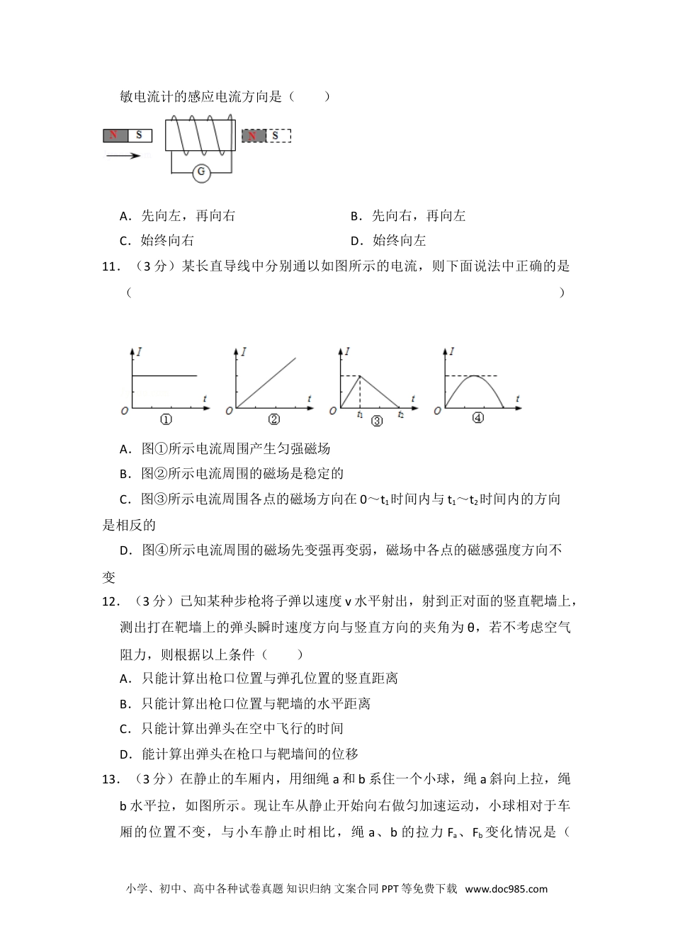 2016年上海市浦东新区高考物理一模试卷一.单项选择题(共16分,每小题2分.每小题只有一个正确选项.)1.(2分)下列物理量中属于矢量的是()A.动能B.电动势C.加速度D.振幅2.(2分)首先发现通电导线周围存在磁场的科学家是()A.奥斯特B.法拉第C.麦克斯韦D.赫兹3.(2分)关于磁感应强度的单位T,下列表达式中不正确的是()A.1T=1C•m2B.1T=1Wb/m2C.1T=1kg/(A•s2)D.1T=1N/(A•m)4.(2分)下列几种运动,运动状态发生变化的是()A.汽车沿着上坡坡道匀速直线前进B.降落伞吊着货物斜向下匀速降落C.船在海面上向东北方向匀速航行D.火车沿水平面内的弯曲轨道匀速前进5.(2分)电动机的自动控制电路如图所示,其中RH为热敏电阻,RL为光敏电阻,当温度升高时,RH的阻值远小于R1;当光照射RL时,其阻值远小于R2,为使电动机在温度升高或受到光照时能自动启动,则在图中虚线框内应接入的元件是()A.非门B.或门C.与门D.与非门6.(2分)关于两等量异种点电荷在其连线中点的电场强度和电势,下列说法中正确的是()A.场强为零,电势不为零B.场强不为零,电势为零C.场强为不零,电势也不为零D.场强为零,电势也为零小学、初中、高中各种试卷真题知识归纳文案合同PPT等免费下载www.doc985.com7.(2分)如图所示,电路中每个电阻的阻值都相同.则通过电流最大的电阻是()A.R1B.R2C.R3和R4D.R58.(2分)如图,一圆盘可绕一通过圆心且垂直于盘面的竖直轴转动,在圆盘上放一块橡皮,橡皮块随圆盘一起转动(俯视为逆时针).某段时间圆盘转速不断增大,但橡皮块仍相对圆盘静止,在这段时间内,关于橡皮块所受合力F的方向的四种表示(俯视图)中,正确的是()A.B.C.D.二.单项选择题(共24分,每小题3分.每小题只有一个正确选项.)9.(3分)如果力F在时间t内使质量为m的物体移动一段距离s,那么()A.力F在时间t内使质量的物体移动距离sB.力F在时间内使质量的物体移动距离sC.力F在时间2t内使质量2m的物体移动距离sD.力在时间t内使质量的物体移动距离s10.(3分)如图所示,一根条形磁铁自左向右穿过一个闭合线圈,则流过灵小学、初中、高中各种试卷真题知识归纳文案合同PPT等免费下载www.doc985.com敏电流计的感应电流方向是()A.先向左,再向右B.先向右,再向左C.始终向右D.始终向左11.(3分)某长直导线中分别通以如图所示的电流,则下面说法中正确的是()A.图①所示电流周围产生匀强磁场B.图②所示电流周围的磁场是稳定的C.图③所示电流周围各点的磁场方向在0~t1时间内与t1~t2时间内的方向是相反的D.图④所示电流周围的磁场先变强再变弱,磁场中各点的磁感强度方向不变12.(3分)已知某种步枪将子弹以速度v水平射出,射到正对面的竖直靶墙上,测出打在靶墙上的弹头瞬时速度方向与竖直方向的夹角为θ,若不考虑空气阻力,则根据以上条件()A.只能计算出枪口位置与弹孔位置的竖直距离B.只能计算出枪口位置与靶墙的水平距离C.只能计算出弹头在空中飞行的时间D.能计算出弹头在枪口与靶墙间的位移13.(3分)在静止的车厢内,用细绳a和b系住一个小球,绳a斜向上拉,绳b水平拉,如图所示。现让车从静止开始向右做匀加速运动,小球相对于车厢的位置不变,与小车静止时相比,绳a、b的拉力Fa、Fb变化情况是(小学、初中、高中各种试卷真题知识归纳文案合同PPT等免费下载www.doc985.com)A.Fa变大,Fb不变B.Fa变大,Fb变小C.Fa不变,Fb变小D.Fa不变,Fb变大14.(3分)带电粒子仅在电场力作用下,从电场中a点以初速度v0进入电场并沿虚线所示的轨迹运动到b点,如图所示,实线是电场线,下列说法正确的是()A.粒子在a点时的加速度比在b点时的加速度小B.从a到b过程中,粒子的电势能不断减小C.无论粒子带何种电,经b点时的速度总比经a点时的速度大D.电场中a点的电势一定比b点的电势高15.(3分)如图所示,直升飞机放下绳索从湖里吊起困在水中的伤员后,在某一高度沿直线飞行;在伤员上升的某段过程中,地面上观察者发现伤员的运动轨迹是一条倾斜向上的直线.空气阻力不计,关于该过程中吊绳对伤员的拉力,下列分析正确的...