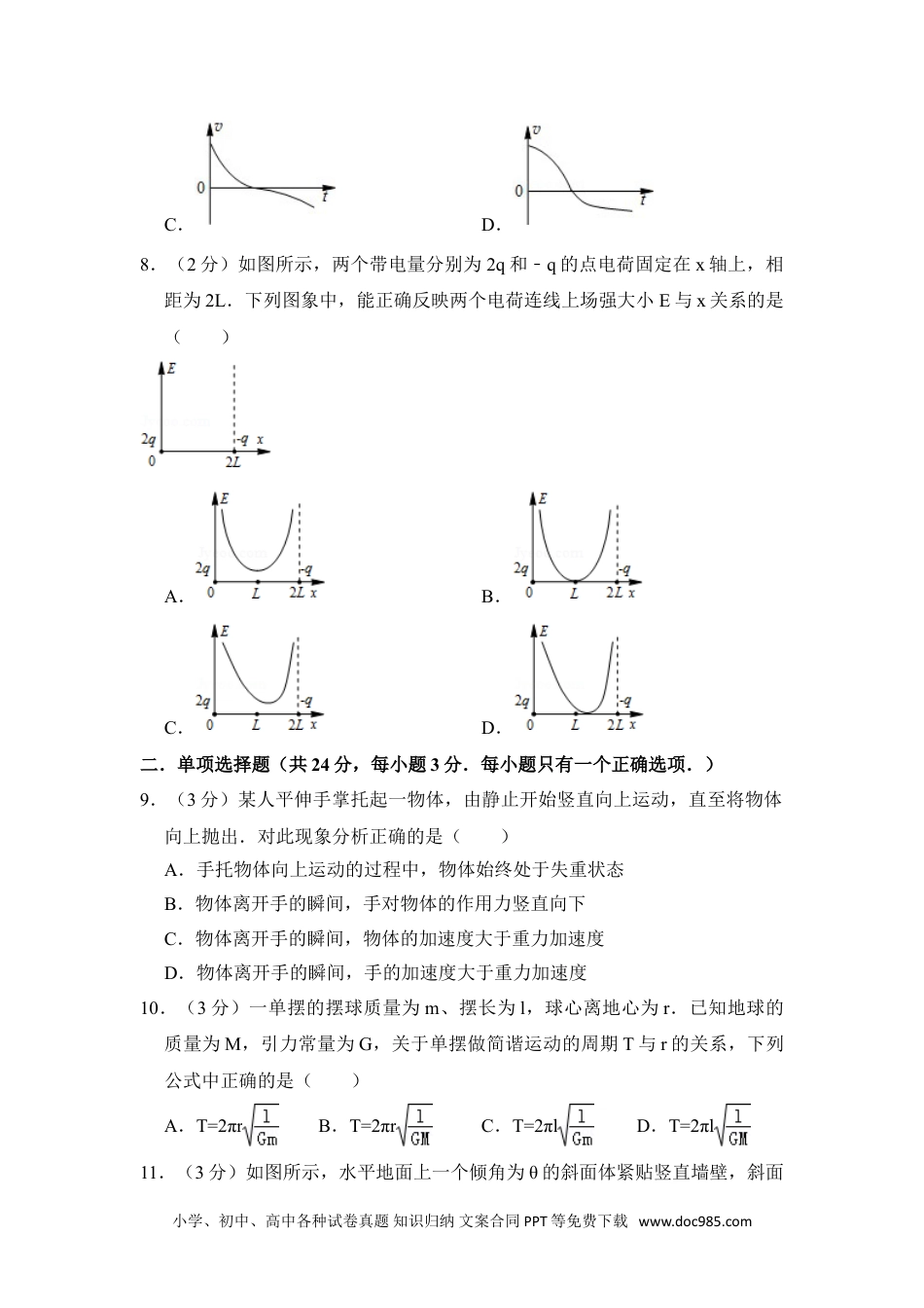 2015年上海市虹口区高考物理一模试卷一.单项选择题(共16分,每小题2分.每小题只有一个正确选项.)1.(2分)关于科学家的贡献,下列描述中正确的是()A.卡文迪什利用扭秤巧妙地测得静电力常量k的数值B.开普勒根据行星运动的规律,提出了万有引力定律C.伽利略通过对斜面实验结论的合理外推,得出了自由落体运动的规律D.法拉第根据小磁针在通电导线周围的偏转,发现了电流的磁效应2.(2分)如图,一定量的理想气体从状态a沿直线变化到状态b,在此过程中,其压强()A.逐渐增大B.逐渐减小C.始终不变D.先增大后减小3.(2分)一质点沿x轴做简谐运动,其振动图象如图所示.在1.5s~2s的时间内,质点的速度v、加速度a的大小的变化情况是()A.v变大,a变大B.v变小,a变小C.v变大,a变小D.v变小,a变大4.(2分)如图所示,水平地面上放着一堆圆木,关于圆木P在支撑点M、N处受力的方向,下列说法中正确的是()A.M处受到地面的弹力竖直向上B.N处受到其它圆木的弹力竖直向上C.M处受到地面的摩擦力沿MN方向小学、初中、高中各种试卷真题知识归纳文案合同PPT等免费下载www.doc985.comD.N处受到其它圆木的摩擦力沿水平方向5.(2分)2011年11月3日,我国发射的“天宫一号”目标飞行器与发射的“神舟八号”飞船成功进行了第一次无人交会对接.假设对接前“天宫一号”和“神舟八号”绕地球做匀速圆周运动的轨道如图所示,虚线A代表“天宫一号”的轨道,虚线B代表“神舟八号”的轨道,下列说法中正确的是()A.“天宫一号”和“神舟八号”的运行速率均大于7.9km/sB.“天宫一号”的运行速率小于“神舟八号”的运行速率C.“天宫一号”的运行周期小于“神舟八号”的运行周期D.“天宫一号”的向心加速度大于“神舟八号”的向心加速度6.(2分)如图所示为用“与”门、蜂鸣器等组件组成的简易控制电路.当蜂鸣器L不鸣叫时,电键S1、S2所处的状态为()A.S1断开,S2闭合B.S1、S2都断开C.S1闭合,S2断开D.S1、S2都闭合7.(2分)以初速度v0竖直向上抛出一小球,小球所受空气阻力与速度的大小成正比.下列图象中,能正确反应小球从抛出到落回原处的速度随时间变化情况的是()A.B.小学、初中、高中各种试卷真题知识归纳文案合同PPT等免费下载www.doc985.comC.D.8.(2分)如图所示,两个带电量分别为2q和﹣q的点电荷固定在x轴上,相距为2L.下列图象中,能正确反映两个电荷连线上场强大小E与x关系的是()A.B.C.D.二.单项选择题(共24分,每小题3分.每小题只有一个正确选项.)9.(3分)某人平伸手掌托起一物体,由静止开始竖直向上运动,直至将物体向上抛出.对此现象分析正确的是()A.手托物体向上运动的过程中,物体始终处于失重状态B.物体离开手的瞬间,手对物体的作用力竖直向下C.物体离开手的瞬间,物体的加速度大于重力加速度D.物体离开手的瞬间,手的加速度大于重力加速度10.(3分)一单摆的摆球质量为m、摆长为l,球心离地心为r.已知地球的质量为M,引力常量为G,关于单摆做简谐运动的周期T与r的关系,下列公式中正确的是()A.T=2πrB.T=2πrC.T=2πlD.T=2πl11.(3分)如图所示,水平地面上一个倾角为θ的斜面体紧贴竖直墙壁,斜面小学、初中、高中各种试卷真题知识归纳文案合同PPT等免费下载www.doc985.com体和墙壁之间再放一个质量为m的铁球,各接触面均光滑.现对铁球施加水平推力F的作用,整个系统始终处于静止状态,下列说法中正确的是()A.斜面体对铁球施加的弹力一定大于mgB.斜面体对铁球施加的弹力可能小于mgC.水平推力逐渐增大时,铁球对斜面体施加的弹力一定增大D.水平推力逐渐增大时,斜面体对墙壁施加的弹力一定增大12.(3分)如图所示,质量为m、长为L的直导线用两根轻质绝缘细线悬挂于O、O′,并处于匀强磁场中.当导线中通以沿x正方向的电流I,且导线保持静止时,细线与竖直方向的夹角为θ.则磁感应强度的方向和大小可能为()A.z正向,tanθB.y正向,C.x正向,tanθD.沿悬线向上,sinθ13.(3分)图示为竖直放置、上细下粗、两端封闭的玻璃细管,水银柱将气体分隔成A、B两部分,初始温度相同。缓缓加热气体...