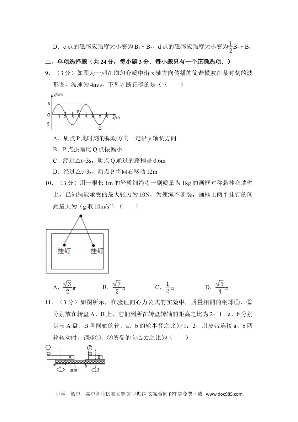 2013年上海市黄浦区高考物理一模试卷一、单项选择题(共16分,每小题2分.每小题只有一个正确选项.)1.(2分)下列选项中属于物理学中的理想化模型的是()A.电场强度B.电阻C.点电荷D.电势2.(2分)下列物理量中均为标量的一组是()A.线速度、重力势能、电压、磁通量B.功、重力势能、电阻、磁通量C.线速度、磁感应强度、电压、电场强度D.功、磁感应强度、电阻、电场强度3.(2分)关于万有引力定律,下列说法正确的是()A.牛顿提出了万有引力定律,并测定了引力常量的数值B.万有引力定律只适用于天体之间C.万有引力的发现,揭示了自然界一种基本相互作用的规律D.地球绕太阳在椭圆轨道上运行,在近日点和远日点受到太阳的万有引力大小是相同的4.(2分)在“用单摆测定重力加速度”的实验中,实验时用拉力传感器测得摆线的拉力大小F随时间t变化的图象如图所示,下列判断中正确的是()A.该单摆的周期为tB.该单摆的周期为2tC.该单摆的周期为3tD.该单摆的周期为4t5.(2分)静止在光滑水平面上的物体,受到一个大小不为零的水平拉力作用,若拉力开始作用瞬间物体的速度大小为v,加速度大小为a,则下列判断中正确的是()A.v≠0,a≠0B.v=0,a≠0C.v≠0,a=0D.v=0,a=06.(2分)如图所示,用两个基本门电路连接成逻辑电路,根据该电路的真值小学、初中、高中各种试卷真题知识归纳文案合同PPT等免费下载www.doc985.com表,下列判断中正确的是()A.虚线框内应是“与门”,真值表内空缺处应填“0”B.虚线框内应是“或门”,真值表内空缺处应填“0”C.虚线框内应是“与门”,真值表内空缺处应填“1”D.虚线框内应是“或门”,真值表内空缺处应填“1”7.(2分)如图所示,长为L的硬杆A一端固定一个质量为m的小球B,另一端固定在水平转轴O上,硬杆绕转轴O在竖直平面内缓慢转动.在硬杆与水平方向的夹角α从90°减小到0°的过程中,下列说法正确的是()A.小球B受到硬杆A的作用力方向始终沿杆B.小球B受到的合力方向始终沿杆C.小球B受到硬杆A的作用力逐渐减小D.小球B受到硬杆A的作用力对小球做负功8.(2分)分别置于a、b两处的长直导线垂直纸面放置,通有大小相等的恒定电流,方向如图所示,a、b、c、d在一条直线上,且ac=cb=bd.已知c点的磁感应强度大小为B1,d点的磁感应强度大小为B2.若将b处导线的电流切断,则()A.c点的磁感应强度大小变为B1,d点的磁感应强度大小变为B1﹣B2B.c点的磁感应强度大小变为B1,d点的磁感应强度大小变为B2﹣B1C.c点的磁感应强度大小变为B1﹣B2,d点的磁感应强度大小变为B1﹣B2小学、初中、高中各种试卷真题知识归纳文案合同PPT等免费下载www.doc985.comD.c点的磁感应强度大小变为B1﹣B2,d点的磁感应强度大小变为B2﹣B1二、单项选择题(共24分,每小题3分.每小题只有一个正确选项.)9.(3分)如图为一列在均匀介质中沿x轴方向传播的简谐横波在某时刻的波形图,波速为4m/s,下列判断正确的是(()A.质点P此时刻的振动方向一定沿y轴负方向B.P点振幅比Q点振幅小C.经过△t=3s,质点Q通过的路程是0.6mD.经过△t=3s,质点P将向右移动12m10.(3分)用一根长1m的轻质细绳将一副质量为1kg的画框对称悬挂在墙壁上,已知绳能承受的最大张力为10N,为使绳不断裂,画框上两个挂钉的间距最大为(g取10m/s2)()A.B.C.D.11.(3分)如图所示,在验证向心力公式的实验中,质量相同的钢球①、②分别放在转盘A、B上,它们到所在转盘转轴的距离之比为2:1.a、b分别是与A盘、B盘同轴的轮.a、b的轮半径之比为1:2,用皮带连接a、b两轮转动时,钢球①、②所受的向心力之比为()小学、初中、高中各种试卷真题知识归纳文案合同PPT等免费下载www.doc985.comA.8:1B.4:1C.2:1D.1:212.(3分)某限流器由超导部件和限流电阻并联组成,如图所示.超导部件有一个超导临界电流Ic,当通过限流器的电流I>Ic时将造成超导体失超,即从超导态(可视为电阻为零)转变为正常态(可视为定值纯电阻),以此便可限制电路系统的故障电流.已知超导部件的正常态电阻为R1=3Ω,超导临界电流Ic=1.2A,限流电阻R2=6Ω,小灯泡L上标有“6V...