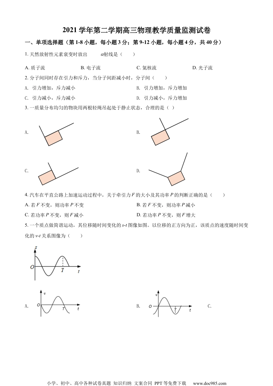 小学、初中、高中各种试卷真题知识归纳文案合同PPT等免费下载www.doc985.com2021学年第二学期高三物理教学质量监测试卷一、单项选择题(第1-8小题,每小题3分;第9-12小题,每小题4分,共40分)1.天然放射性元素衰变时放出的射线是()A.质子流B.电子流C.氦核流D.光子流2.分子间同时存在引力和斥力,当分子间距减小时,分子间()A.引力增加,斥力减小B.引力增加,斥力增加C.引力减小,斥力减小D.引力减小,斥力增加3.一质量分布均匀的物块用两根轻绳吊起处于静止状态,合理的是()A.B.C.D.4.汽车在平直公路上加速运动过程中,关于牵引力F的大小及其功率P的判断正确的是()A.若F不变,则功率P不变B.若F不变,则功率P减小C.若功率P不变,则F减小D.若功率P不变,则F增大5.一个质点做简谐运动,其位移随时间变化的s-t图像如图。以位移的正方向为正,该质点的速度随时间变化的v-t关系图像为()A.B.C.小学、初中、高中各种试卷真题知识归纳文案合同PPT等免费下载www.doc985.comD.6.关于闭合电路,下列说法正确的是()A.电源正负极被短路时,电流很小B.电源正负极被短路时,端电压最大C.外电路断路时,端电压为零D.用电器增加时,路端电压可能减小7.质量为m的物体放在地球表面,已知地球的质量为M、半径为R,万有引力常量为G。则地球表面的重力加速度大小可表示为()A.B.C.D.8.如图所示,S1、S2是两个振幅相等的相干波源,实线和虚线分别表示在某一时刻它们所发出的波的波峰和波谷。在A、B、C、D四点中()A.A点振动减弱B.B点振动加强C.周期后,C点处于平衡位置D.A点始终处于波峰,D点始终处于波谷9.光滑水平面上有一质量为2kg的物体,在五个恒定的水平共点力的作用下处于平衡状态。现同时撤去大小分别为5N和15N的两个力而其余力保持不变,关于此后物体的运动情况的说法正确的是()A.一定做匀变速运动,加速度大小可能是10m/s2B.一定做匀变速直线运动,加速度大小可能是5m/s2C.可能做匀减速直线运动,加速度大小可能是2m/s2D.可能做匀速圆周运动,向心加速度大小可能是8m/s2小学、初中、高中各种试卷真题知识归纳文案合同PPT等免费下载www.doc985.com10.一物体在竖直向上的恒力作用下,由静止开始向上运动,到达某一高度时撤去该力。若不计空气阻力,则在整个上升过程中,物体的机械能E随时间t变化的关系图像是()A.B.C.D.11.如图,一圆形闭合铜环由高处从静止开始下落,穿过一根用细线竖直悬挂的条形磁铁。若线圈下落过程中,铜环的中心轴线与条形磁铁的中轴始终保持重合,则下列说法正确的是()A.从上往下看,圆环中感应电流方向先逆时针后顺时针B.圆环经过磁铁顶端和底端时的速度相等C.圆环经过磁铁中心O处加速度最大D.细线对磁铁的拉力始终大于磁铁的重力12.一带负电的粒子只在电场力作用下沿x轴正向运动,其电势能Ep随位移x变化的关系如图所示,其中0-x2段是对称的曲线,x2-x3段是直线,则()A.粒子在x1处所受电场力最大B.x1-x2段粒子的动能增大小学、初中、高中各种试卷真题知识归纳文案合同PPT等免费下载www.doc985.comC.粒子在0-x1段做匀变速直线运动,x2-x3段做匀速直线运动D.粒子在0、x1、x2、x3处电势φ0、φ1、φ2、φ3的关系为φ3<φ2=φ0<φ1二、填空题(共20分)13.爱因斯坦提出光子说,认为每个光子具有的能量跟它的______成正比,比例常数为普朗克常量h,若用国际单位制基本单位表示,h的单位为______。14.图(甲)为观察光的干涉和衍射现象的实验装置,光电传感器可用来测量光屏上光强的分布。某次实验时用绿色激光照射,得到图(乙)所示的光强分布情况,则缝屏上安装的是______(选填“单缝”或“双缝”)。为增大条纹宽度,可改用______色激光照射。(选填“红”或“紫”)15.内壁光滑、粗细均匀、左端封闭的玻璃管水平放置。横截面积为20cm2的活塞封闭一定质量的气体,气柱长度为20cm,压强与大气压强相同,为1.0×105Pa。缓慢推动活塞,当气柱长度变为5cm时,管内气体的压强为______Pa,此时作用在活塞上的推力大小为______N。16.在如图所示的电路中,电源内阻为r,两个定值电阻的阻值分别为R1、R3。闭合开关S,当变阻器R2的滑动触头P向下滑动时,伏特...