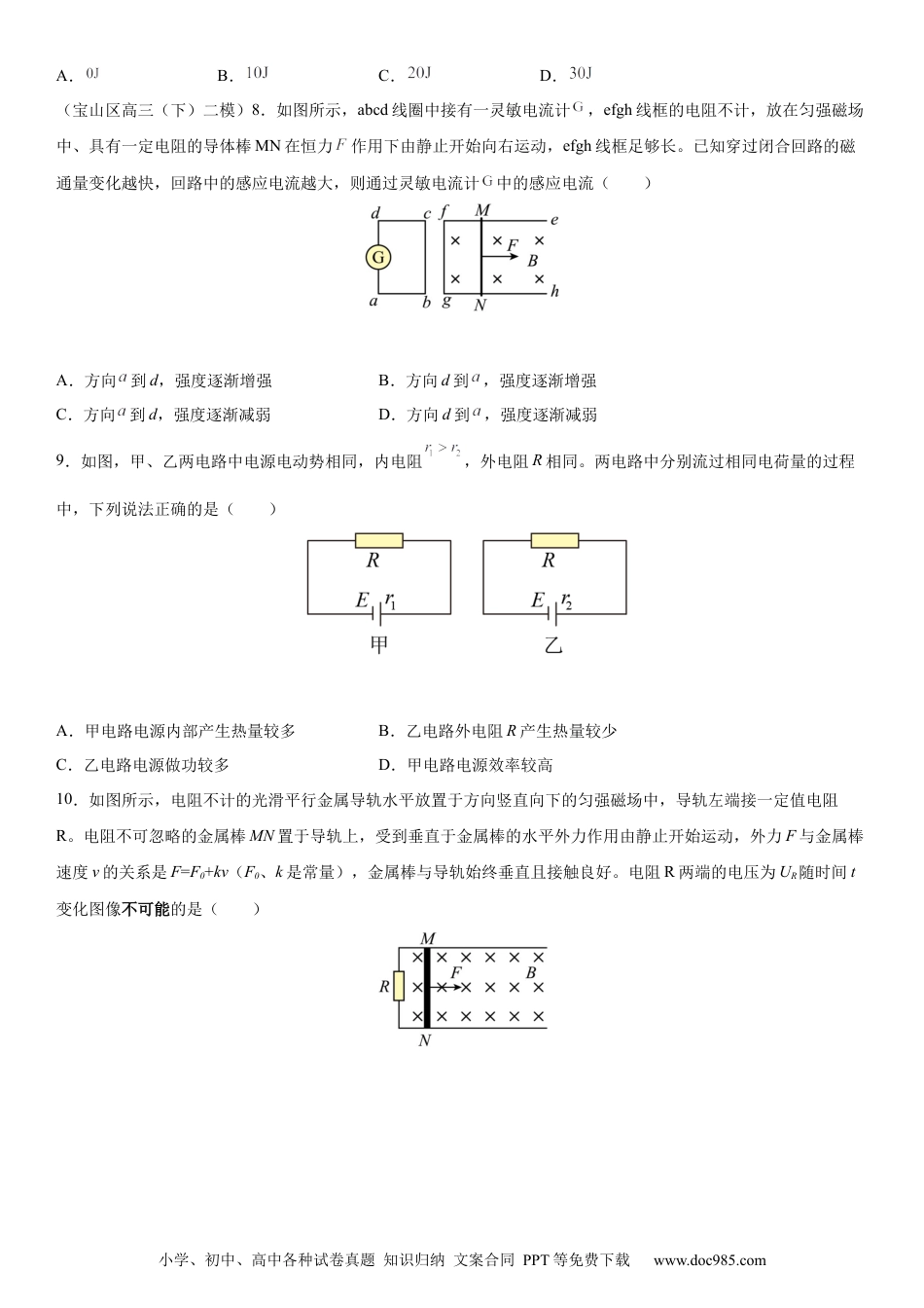 小学、初中、高中各种试卷真题知识归纳文案合同PPT等免费下载www.doc985.com2022届上海(浦东新区、徐汇、杨浦、闵行、长宁、宝山、虹口区)高考二模物理试题分类汇编电磁学(二)一、单选题(闵行区高三(下)等级考试在线模拟练习(二模))1.近年来,机器人逐渐走人我们的生活。如图所示,一款微型机器人的直流电动机的额定电压为U,额定电流为I,线圈电阻为R,将它接在电动势为E,内阻为r的直流电源的两极间,电动机恰好能正常工作,下列说法正确的是()A.电动机消耗的热功率为UIB.电源的输出功率为I2RC.电源的效率为1-D.电动机消耗的总功率为EI(闵行区高三(下)等级考试在线模拟练习(二模))2.通电螺线管外套着a、b两个金属环。两个环的圆心在螺线管的轴线上,如图所示。闭合开关S,在移动滑动变阻器的滑动头P时,下列说法正确的()A.磁通量Φa<ΦbB.a、b两环中感应电流的磁场与螺线管内部磁感应强度方向相同C.当P向右滑动时,b环中的感应电流方向为逆时针方向(从左向右看)D.当P向右滑动时,a、b两环的面积有扩张的趋势(闵行区高三(下)等级考试在线模拟练习(二模))3.如图所示,A、B、C、D、E、F是正六边形的顶点,O为正六边形的中心。两根分别固定在A、D两点且均垂直于正六边形所在平面的长直导线(图中未画出),通有大小相等、方向相反的恒定电流。则与B点磁感应强度相同的点是()小学、初中、高中各种试卷真题知识归纳文案合同PPT等免费下载www.doc985.comA.O点B.C点C.E点D.F点(长宁区高三(下)二模)4.关于闭合电路,下列说法正确的是()A.电源正负极被短路时,电流很小B.电源正负极被短路时,端电压最大C.外电路断路时,端电压为零D.用电器增加时,路端电压可能减小(长宁区高三(下)二模)5.如图,一圆形闭合铜环由高处从静止开始下落,穿过一根用细线竖直悬挂的条形磁铁。若线圈下落过程中,铜环的中心轴线与条形磁铁的中轴始终保持重合,则下列说法正确的是()A.从上往下看,圆环中感应电流方向先逆时针后顺时针B.圆环经过磁铁顶端和底端时的速度相等C.圆环经过磁铁中心O处加速度最大D.细线对磁铁的拉力始终大于磁铁的重力(长宁区高三(下)二模)6.一带负电的粒子只在电场力作用下沿x轴正向运动,其电势能Ep随位移x变化的关系如图所示,其中0-x2段是对称的曲线,x2-x3段是直线,则()A.粒子在x1处所受电场力最大B.x1-x2段粒子的动能增大C.粒子在0-x1段做匀变速直线运动,x2-x3段做匀速直线运动D.粒子在0、x1、x2、x3处电势φ0、φ1、φ2、φ3的关系为φ3<φ2=φ0<φ1(宝山区高三(下)二模)7.如图所示,、、为等势面,两相邻等势面间电势差相同,有一正点电荷在处动能为,运动到处动能为,则该电荷运动到处时的动能为(不计重力和空气阻力)()小学、初中、高中各种试卷真题知识归纳文案合同PPT等免费下载www.doc985.comA.B.C.D.(宝山区高三(下)二模)8.如图所示,abcd线圈中接有一灵敏电流计,efgh线框的电阻不计,放在匀强磁场中、具有一定电阻的导体棒MN在恒力作用下由静止开始向右运动,efgh线框足够长。已知穿过闭合回路的磁通量变化越快,回路中的感应电流越大,则通过灵敏电流计中的感应电流()A.方向到d,强度逐渐增强B.方向d到,强度逐渐增强C.方向到d,强度逐渐减弱D.方向d到,强度逐渐减弱9.如图,甲、乙两电路中电源电动势相同,内电阻,外电阻R相同。两电路中分别流过相同电荷量的过程中,下列说法正确的是()A.甲电路电源内部产生热量较多B.乙电路外电阻R产生热量较少C.乙电路电源做功较多D.甲电路电源效率较高10.如图所示,电阻不计的光滑平行金属导轨水平放置于方向竖直向下的匀强磁场中,导轨左端接一定值电阻R。电阻不可忽略的金属棒MN置于导轨上,受到垂直于金属棒的水平外力作用由静止开始运动,外力F与金属棒速度v的关系是F=F0+kv(F0、k是常量),金属棒与导轨始终垂直且接触良好。电阻R两端的电压为UR随时间t变化图像不可能的是()小学、初中、高中各种试卷真题知识归纳文案合同PPT等免费下载www.doc985.comA.B.C.D.(虹口区高三(下)二模)11.如图所...