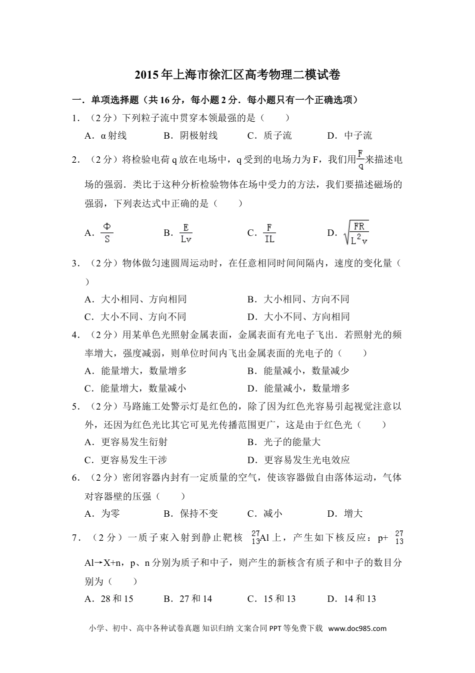 2015年上海市徐汇区高考物理二模试卷一.单项选择题(共16分,每小题2分.每小题只有一个正确选项)1.(2分)下列粒子流中贯穿本领最强的是()A.α射线B.阴极射线C.质子流D.中子流2.(2分)将检验电荷q放在电场中,q受到的电场力为F,我们用来描述电场的强弱.类比于这种分析检验物体在场中受力的方法,我们要描述磁场的强弱,下列表达式中正确的是()A.B.C.D.3.(2分)物体做匀速圆周运动时,在任意相同时间间隔内,速度的变化量()A.大小相同、方向相同B.大小相同、方向不同C.大小不同、方向不同D.大小不同、方向相同4.(2分)用某单色光照射金属表面,金属表面有光电子飞出.若照射光的频率增大,强度减弱,则单位时间内飞出金属表面的光电子的()A.能量增大,数量增多B.能量减小,数量减少C.能量增大,数量减小D.能量减小,数量增多5.(2分)马路施工处警示灯是红色的,除了因为红色光容易引起视觉注意以外,还因为红色光比其它可见光传播范围更广,这是由于红色光()A.更容易发生衍射B.光子的能量大C.更容易发生干涉D.更容易发生光电效应6.(2分)密闭容器内封有一定质量的空气,使该容器做自由落体运动,气体对容器壁的压强()A.为零B.保持不变C.减小D.增大7.(2分)一质子束入射到静止靶核Al上,产生如下核反应:p+Al→X+n,p、n分别为质子和中子,则产生的新核含有质子和中子的数目分别为()A.28和15B.27和14C.15和13D.14和13小学、初中、高中各种试卷真题知识归纳文案合同PPT等免费下载www.doc985.com8.(2分)一列简谐横波沿x轴正向传播,某时刻的波形如图所示.在波继续传播一个波长的时间内,下列图中能正确描述x=2m处的质点受到的回复力与其位移的关系的是()A.B.C.D.二.单项选择题(共24分,每小题3分.每小题只有一个正确选项)9.(3分)如图,一个小球从地面竖直上抛,不计空气阻力,已知小球两次经过一个较低点A的时间间隔为TA,两次经过较高点B的时间间隔为TB,则A、B两点间的距离为()A.B.C.D.10.(3分)一定质量的乙醚液体全部蒸发,变为同温度的乙醚气体,在这一过程中()A.分子引力减小,分子斥力减小小学、初中、高中各种试卷真题知识归纳文案合同PPT等免费下载www.doc985.comB.分子势能减小C.乙醚的内能不变D.分子间作用力增大11.(3分)如图,在固定斜面上的一物块受到外力F的作用,F平行于斜面向上.若要使物块在斜面上保持静止,F的取值应有一定范围,已知其最大值和最小值分别为F1和F2(F2>0).由此可求出()A.物块的质量B.斜面的倾角C.物块与斜面间的动摩擦因数D.物块与斜面间的最大静摩擦力12.(3分)如图,一圆形闭合铜环由高处从静止开始下落,穿过一根质量为m、竖直悬挂的条形磁铁,细绳对磁铁的拉力为F.若线圈下落过程中,铜环的中心轴线与条形磁铁的中轴始终保持重合,则下列图中能正确描述拉力F随时间t变化的图象是()A.B.C.D.小学、初中、高中各种试卷真题知识归纳文案合同PPT等免费下载www.doc985.com13.(3分)如图,一列沿x轴正方向传播的简谐横波,振幅为10cm,在波的传播方向上两质点a、b的平衡位置相距0.7m(小于一个波长).当质点a在波峰位置时,质点b在x轴上方与x轴相距5cm的位置.则该波波长()A.λ=0.8m或λ=5.6mB.0.8m<λ<5.6mC.λ<0.8m或λ>5.6mD.无法确定14.(3分)如图,一两端封闭的玻璃管在竖直平面内倾斜放置,与水平面间的夹角为θ,一段水银柱将管内一定质量气体分割成两部分.在下列各种情况中,能使管中水银柱相对玻璃管向a端移动的情况是()A.降低环境温度B.在竖直平面内以b点为轴逆时针缓慢转动玻璃管C.保持θ角不变,使玻璃管减速上升D.使玻璃管垂直纸面向外做加速运动15.(3分)以不同初速度将两个物体同时竖直向上抛出并开始计时,一个物体所受空气阻力可以忽略,另一个物体所受空气阻力大小与物体速率成正比,下列用虚线和实线描述两物体运动的v﹣t图象可能正确的是()A.B.小学、初中、高中各种试卷真题知识归纳文案合同PPT等免费下载www.doc985.comC.D.16.(3分)如图(a),R为电阻箱,A为理想电流表,...