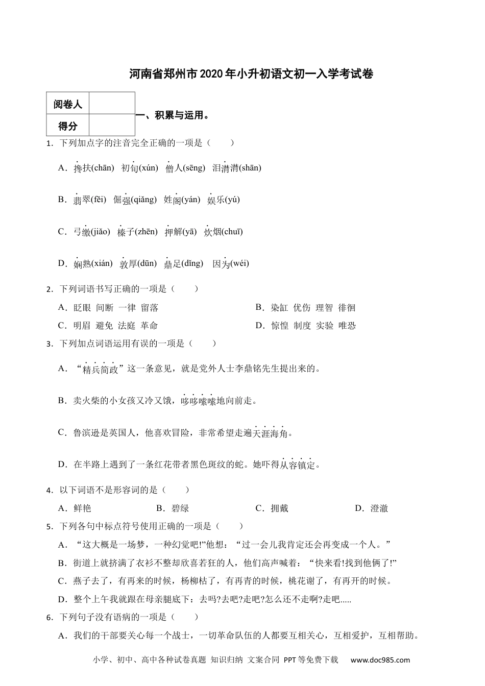 小学、初中、高中各种试卷真题知识归纳文案合同PPT等免费下载www.doc985.com河南省郑州市2020年小升初语文初一入学考试卷阅卷人一、积累与运用。得分1.下列加点字的注音完全正确的一项是()A.搀扶(chān)初旬(xún)僧人(sēng)泪潸潸(shān)B.翡翠(fěi)倔强(qiǎng)姓阁(yán)娱乐(yú)C.弓缴(jiǎo)榛子(zhēn)押解(yā)炊烟(chuī)D.娴熟(xián)敦厚(dūn)鼎足(dǐng)因为(wéi)2.下列词语书写正确的一项是()A.眨眼间断一律留落B.染缸优伤理智徘徊C.明眉避免法庭革命D.惊惶制度实验唯恐3.下列加点词语运用有误的一项是()A.“精兵简政”这一条意见,就是党外人士李鼎铭先生提出来的。B.卖火柴的小女孩又冷又饿,哆哆嗦嗦地向前走。C.鲁滨逊是英国人,他喜欢冒险,非常希望走遍天涯海角。D.在半路上遇到了一条红花带者黑色斑纹的蛇。她吓得从容镇定。4.以下词语不是形容词的是()A.鲜艳B.碧绿C.拥戴D.澄澈5.下列各句中标点符号使用正确的一项是()A.“这大概是一场梦,一种幻觉吧!”他想:“过一会儿我肯定还会再变成一个人。”B.街道上就挤满了衣衫不整却欣喜若狂的人,他们高声喊着:“快来看!找到他俩了!”C.燕子去了,有再来的时候,杨柳枯了,有再青的时候,桃花谢了,有再开的时候。D.整个上午我就跟在母亲腿底下:去吗?去吧?走吧?怎么还不走啊?走吧.....6.下列句子没有语病的一项是()A.我们的干部要关心每一个战士,一切革命队伍的人都要互相关心,互相爱护,互相帮助。小学、初中、高中各种试卷真题知识归纳文案合同PPT等免费下载www.doc985.comB.爷爷经常回忆过去的有趣的往事。C.寒假快结束了,我基本上把老师布置的作业全部完成了。D.读了《鲁滨逊漂流记》,你对荒岛上的经历一定很感兴趣。7.下面文学常识正确的一项是()A.《北京的春节》作者是老舍,原名舒庆春,北京人,满族。著作有话剧《龙须沟》《骆驼祥子》,小说《四世同堂》《茶馆》等。B.《穷人》作者是列夫•托尔斯泰,他是乌克兰人,“穷人”指生活贫困受苦的人。课文赞扬了主人公桑娜虽穷,但有一颗善良、淳朴的美好心灵。C.“迢迢牵牛星,皎皎河汉女。”一诗选自《古诗十九首》,在这里作者引用了牛郎、织女的传说。D.《学弈》是孟子的作品,孟子名轲,字子舆,战国时期邹国人。是我国儒家学派的代表人物,被人尊称为“亚圣",后世将他与孔融合称“孔孟”。8.默写。(1),轻烟散入五侯家。(2)卷地风来忽吹散,。(3)辛弃疾的《西江月•夜行黄沙道中》中描写了明月升起惊吓了喜鹃,蝉还在清风中歌唱的诗句是,。(4)《浪淘沙》中,诗人运用浪漫的想象结合优美的传说,表示要乘风破浪,直到牵牛织女家的句子是:,。(5)《江上渔者》描绘了在风波浪涛之中,渔民驾驶小船辛辛苦苦捕获肥美的鲈鱼的诗句是:,。(6)“乡思”是古代文人墨客写诗作赋的一个重要主题,在许多诗词中都流露出作者的离愁别绪。王安石在《泊船瓜洲》中用“,"两句表达了对家乡的思念;清朝诗人纳兰性德也在《长相思》中用“,“两句委婉地表达了这种情感。9.名著阅读。(1)《三国演义》这本书的作者是(2)《三国演义》中刘关张三顾茅庐请的是(填人名);在赤壁大战中被烧得大败而逃的是(填人名)。10.综合性学习。(1)仿写句子,在下面两句的横线上补写相应的内容。例:假如给我三天光明,我将好好欣赏黎明时飘着的红紫红紫的朝霞。假如,。小学、初中、高中各种试卷真题知识归纳文案合同PPT等免费下载www.doc985.com假如,。(2)将下面诗歌补充完整,最恰当的一项是()大漠沙如雪,___________。何当金络脑,快走踏清秋。A.长河泛孤舟B.燕山月似钩C.明月照西楼D.长城月如钩(3)古代诗歌中,有许多与传统节日有关的名篇佳作,它构成了民族文化的重要组成部分,请你写出与下列古代诗歌名句相对应的传统节日。清明时节雨纷纷,路上行人欲断魂。海上生明月,天涯共此时。阅卷人二、阅读理解。得分11.阅读下面的古诗,完成习题。出塞[唐]王昌龄秦时明月汉时关,万里②长征人未还。但使②龙城③飞将在,不教胡马度阴山。[注释]①万里:形容路途遥远,是虚数。②但使:只要。...