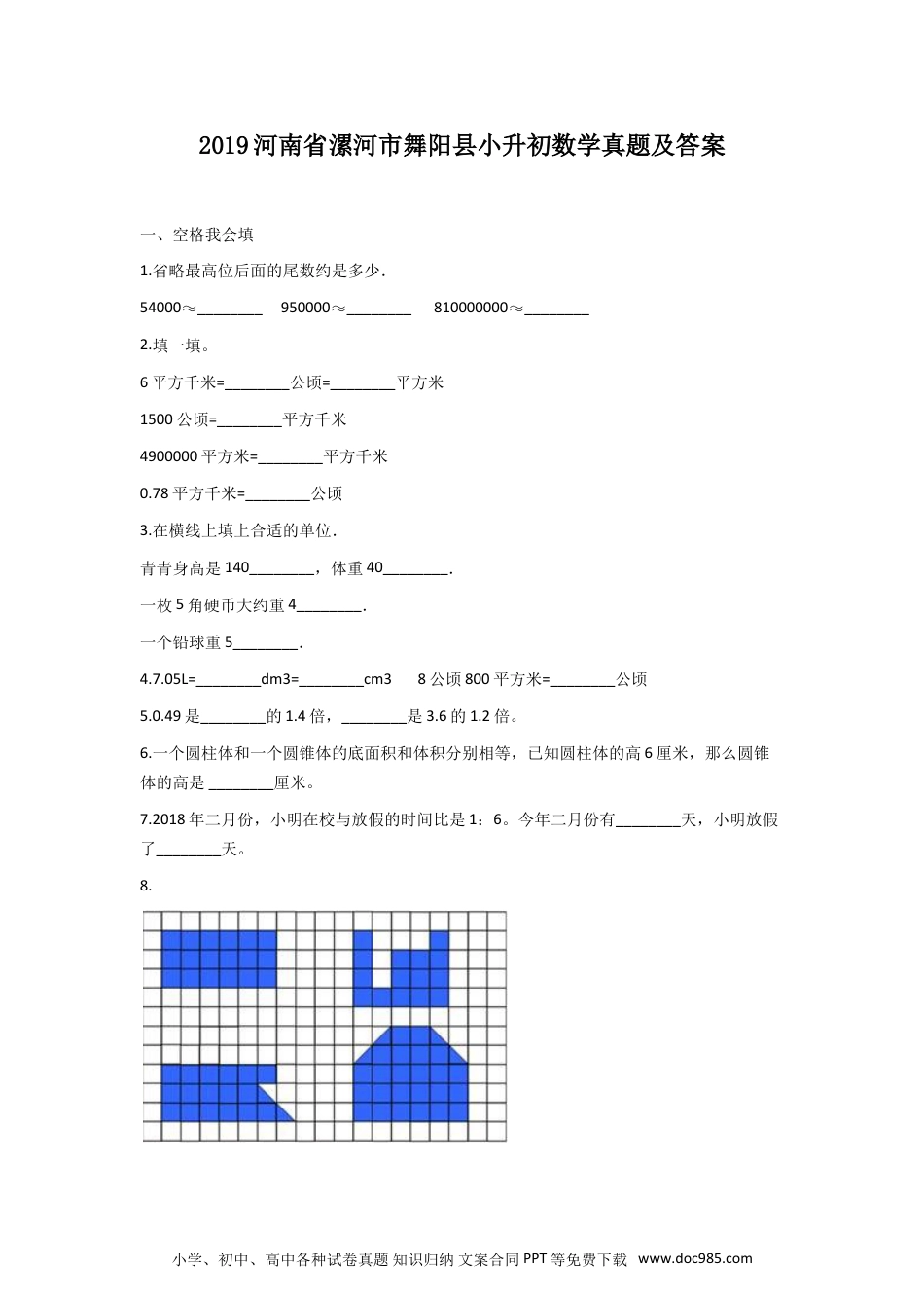 2019河南省漯河市舞阳县小升初数学真题及答案一、空格我会填1.省略最高位后面的尾数约是多少.54000≈________950000≈________810000000≈________2.填一填。6平方千米=________公顷=________平方米1500公顷=________平方千米4900000平方米=________平方千米0.78平方千米=________公顷3.在横线上填上合适的单位.青青身高是140________,体重40________.一枚5角硬币大约重4________.一个铅球重5________.4.7.05L=________dm3=________cm38公顷800平方米=________公顷5.0.49是________的1.4倍,________是3.6的1.2倍。6.一个圆柱体和一个圆锥体的底面积和体积分别相等,已知圆柱体的高6厘米,那么圆锥体的高是________厘米。7.2018年二月份,小明在校与放假的时间比是1:6。今年二月份有________天,小明放假了________天。8.小学、初中、高中各种试卷真题知识归纳文案合同PPT等免费下载www.doc985.com以上四个图形,面积最大的是________,面积最小的是________,________和________的面积相等。9.地铁施工队要搅拌40吨的混凝土,水泥、沙子和石子的比是2∶3∶5.需要水泥________吨,沙子________吨,石子________吨.10.小军将800元压岁钱存入银行,整存争取3年,年利率为2.25%,到期时小金可以从银行多取回________元。11.六年级进行计算比赛,共20题,规定算对一题得5分,错一题扣2分。晓华得了79分,他做对________题.二、对错我会判12.在一个比例里,两个内项的积与两个外项的积相等。()13.半径为2米的圆柱体,它的底面周长和底面积相等。()14.比例尺一定,图上距离和实际距离成反比例.()15.地球上的纬线是横着的,经线是竖着的,也可以用数对确定下来。()16.货车走过留下的两条车印是互相平行的。()17.一个盒子里有同样大小的黄球和黑球各4个,只要摸出3个球,就可以保证一定有2个同色的球。()三、答案我会选18.袋中装有2个红球,3个蓝球,4个黄球,任意摸出1个球,摸出()球的可能性最小。A.红B.蓝C.黄19.平行四边形相邻两边的长是6厘米和4厘米,其中一条底边上的高是5厘米,这个平行四边形的面积是()平方厘米。A.20B.24C.30D.20或3020.下面能与2:7组成比例的比是()A.0.6:2.1小学、初中、高中各种试卷真题知识归纳文案合同PPT等免费下载www.doc985.comB.14:4C.1.5:1321.把一块三角形的地画在比例尺是1:500的图纸上,量得图上三角形的底是12厘米,高8厘米,这块地实际面积是()A.480平方米B.240平方米C.1200平方米22.不同的6本书分给甲、乙、丙3个人,每人分2本,有多少种不同的分法()A.90种B.60种C.30种D.10种23.一个圆锥形沙堆,底面积是50.24m2,高是1.5m。用这堆沙在10m宽的公路上铺2cm厚的路面,能铺()m。A.1.256B.125.6C.376.8四、计算我拿手24.计算(1)(6.8-6.8×0.55)÷8.5(2)(3.2×1.5+2.5)÷1.6(3)14.55÷(0.72+4.76×3)(4)10.48+22.56÷4.7×5.425.求x的值①x﹣X=②x:20=0.5:7.小学、初中、高中各种试卷真题知识归纳文案合同PPT等免费下载www.doc985.com26.涂色部分的面积是多少?27.游乐园里新增了一批垃圾箱,形状如图。它是由两个正方体组成的,其中小正方体的棱长是2dm,大正方体的棱长是5dm。小正方体无盖,便于人们扔垃圾。制作这样一个垃圾箱,至少需要多少平方分米的铁皮?五、按要求做题我能行28.找一找,画一画。小学、初中、高中各种试卷真题知识归纳文案合同PPT等免费下载www.doc985.com六、问题我会解29.列方程解答。一块三角形麦地,底是30米,高是27米,如果每平方米收小麦0,7千克,这块麦地可收小麦多少千克?30.一个修路队,原计划每天修400米,15天可以修完.结果12天就完成任务,实际每天修多少米?(用比例解)小学、初中、高中各种试卷真题知识归纳文案合同PPT等免费下载www.doc985.com31.某学校有学生1240人,女生人数的与男生人数的同样多,那么男女生各有多少人?32.下面是李老师今年8月份收入和支出的记录。8月10日领取工资2400元8月13日交电话费88元8月15日交水电费120元8月24日买服装花320元8月26日收到稿费450元8月30日得加班费100元8月份伙食费合计800元(1)请你用正数和负数记录在下表中...