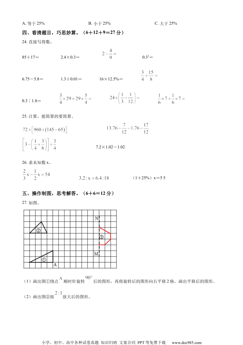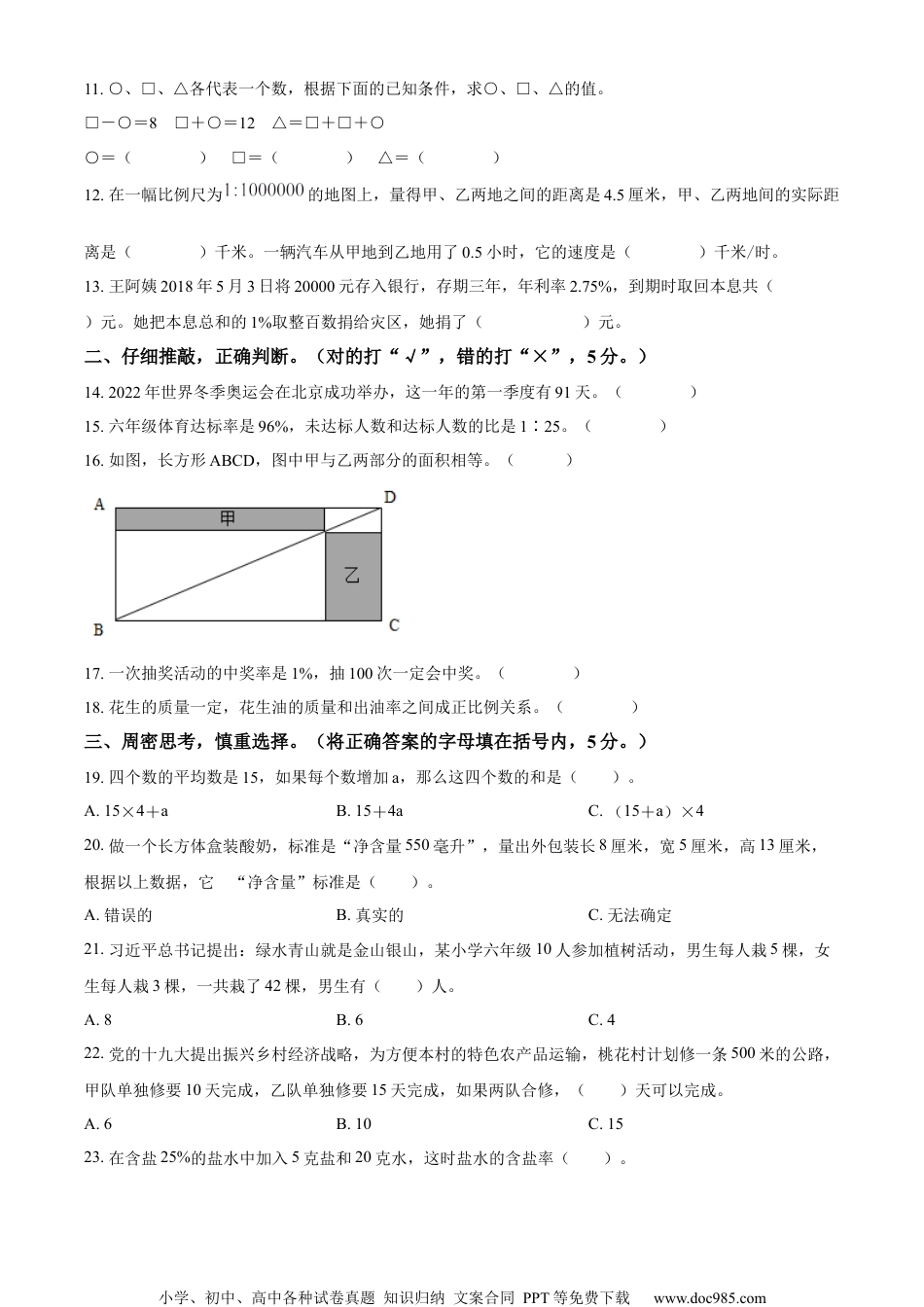 小学、初中、高中各种试卷真题知识归纳文案合同PPT等免费下载www.doc985.com2022年河南省漯河市郾城区人教版小升初考试数学试卷一、细心考虑,认真填空。(每空1分,第4题2分,共26分。)1.2022年5月11日,漯河市主城区共完成1200840人核酸采样检测,检测结果均为阴性。这个数读作()人,四舍五入到万位取近似数(省略万位后面尾数)是()万人。2.截止2022年3月24日,我国新冠疫苗全程接种率达到88.01%,这个百分数指()占()的88.01%。3.在现有的记录中,1922年9月13日利比亚的埃尔阿奇亚地区当地气温高达零上57.8℃,记作()℃;1967年,挪威在北极点附近的气温低至零下94.5℃,记作()℃。4.哥德巴赫猜想被誉为“数学皇冠上的明珠”,内容是“任何大于2的偶数都可以表示成两个质数之和”。比如12=()+()。5.一个三角形三个内角的度数比是1∶1∶4,这个三角形既是()三角形,又是()三角形。6.一个半圆的半径是2cm,它的周长是()cm,面积是()。7.观察数轴(如图所示):如果点D表示的数是,则点C所表示的数是(),点A所表示的数是()。8.如图,长方形ABCD中,AB长6.28cm,BC长12.56cm,它是一个圆柱的侧面展开图,这个圆柱底面半径最大会是()cm,这时高是()cm。9.一个圆柱的体积是,底面直径是4dm,它的高是()dm,和它等底等高的圆锥体的体积大约是()(此空保留一位小数)。10.一本书,如果每天看15页,24天可以看完,现在要提前4天看完,每天要看()页。小学、初中、高中各种试卷真题知识归纳文案合同PPT等免费下载www.doc985.com11.○、□、△各代表一个数,根据下面的已知条件,求○、□、△的值。□-○=8□+○=12△=□+□+○○=()□=()△=()12.在一幅比例尺为的地图上,量得甲、乙两地之间的距离是4.5厘米,甲、乙两地间的实际距离是()千米。一辆汽车从甲地到乙地用了0.5小时,它的速度是()千米/时。13.王阿姨2018年5月3日将20000元存入银行,存期三年,年利率2.75%,到期时取回本息共()元。她把本息总和的1%取整百数捐给灾区,她捐了()元。二、仔细推敲,正确判断。(对的打“√”,错的打“×”,5分。)14.2022年世界冬季奥运会在北京成功举办,这一年的第一季度有91天。()15.六年级体育达标率是96%,未达标人数和达标人数的比是1∶25。()16.如图,长方形ABCD,图中甲与乙两部分的面积相等。()17.一次抽奖活动的中奖率是1%,抽100次一定会中奖。()18.花生的质量一定,花生油的质量和出油率之间成正比例关系。()三、周密思考,慎重选择。(将正确答案的字母填在括号内,5分。)19.四个数的平均数是15,如果每个数增加a,那么这四个数的和是()。A.15×4+aB.15+4aC.(15+a)×420.做一个长方体盒装酸奶,标准是“净含量550毫升”,量出外包装长8厘米,宽5厘米,高13厘米,根据以上数据,它的“净含量”标准是()。A.错误的B.真实的C.无法确定21.习近平总书记提出:绿水青山就是金山银山,某小学六年级10人参加植树活动,男生每人栽5棵,女生每人栽3棵,一共栽了42棵,男生有()人。A.8B.6C.422.党的十九大提出振兴乡村经济战略,为方便本村的特色农产品运输,桃花村计划修一条500米的公路,甲队单独修要10天完成,乙队单独修要15天完成,如果两队合修,()天可以完成。A.6B.10C.1523.在含盐25%的盐水中加入5克盐和20克水,这时盐水的含盐率()。小学、初中、高中各种试卷真题知识归纳文案合同PPT等免费下载www.doc985.comA.等于25%B.小于25%C.大于25%四、看清题目,巧思妙算。(6+12+9=27分)24.直接写得数。85÷17=2.4×0.3=0.33=6.75-5.8=1.3÷0.01=16×12.5%=0.3∶1.8=25.计算,能简算的要简算。7.2×1.02-1.0226.求未知数x。(1+25%)x=5.5五、操作制图,思考解答。(6+6=12分)27.如图。(1)画出图①绕点顺时针旋转后的图形,再将旋转后的图形向右平移2格,画出平移后的图形。(2)画出图②按放大后的图形。小学、初中、高中各种试卷真题知识归纳文案合同PPT等免费下载www.doc985.com(3)以为对称轴,画出图③的另一半,使它成为轴对称图形。28.某学校对本校学生进行了视力...