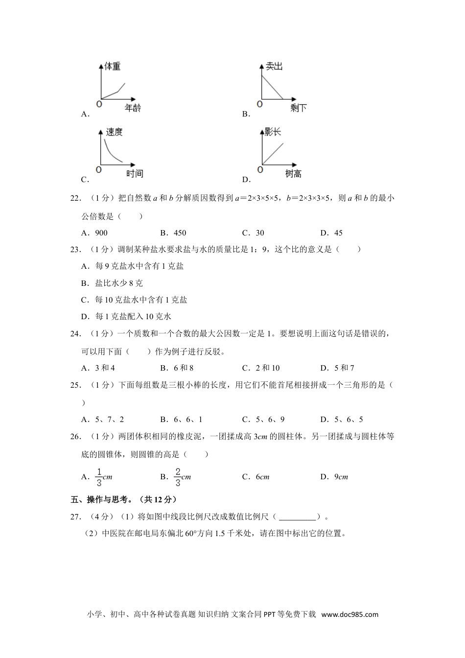 2023年河南省三门峡市灵宝市小升初数学试卷一、填空。(每空1分,共20分)1.(2分)某微博阅读量达到六千五百三十七万零八百次,这个数写作,省略“万”后面的尾数约是万。2.(3分)A点表示的数是;B点表示的数是;数轴上有一个D点与C点对称,对称轴正好经过“1”,D点表示的数是。3.(2分)小明买了一部八折出售的玩具车,花了96元。这部车的原价是元,小明少花了元。4.(2分)王涛爸爸经营了一家“开心农场”,今年“五一”小长假共收入8万元,按照规定需要缴纳5%的营业税,王涛爸爸共需缴纳营业税万元。交完税后,爸爸寄了2万元给老家的奶奶,奶奶把这笔钱全部存入银行,定期3年,年利率是2.75%,到期后奶奶可以取出本金和利息共万元。5.(5分)分=秒40000m2=公顷0.05t=kg1.25时=时分6.(2分)等底等高的圆锥与圆柱的体积之比是();一个三角形与一个平行四边形底相等,面积也相等,那么它们高的比是。7.(2分)为深入推进师生阅读,营造书香校园氛围,胜利小学开展“恰逢春光好读书”主题系列活动。王老师买了9本科技书和12本故事书,买两种书所花钱数相等。科技书与故事书的单价之比是。故事书的单价是24元,科技书的单价是元。8.(1分)工地运来水泥a车,每车14t,可供施工队使用一周,14a÷7表示。9.(1分)上海的“滴水湖”是中国第二大人工湖,湖面呈圆形,直径约是2.5km。“滴水湖”的周长大约是km。小学、初中、高中各种试卷真题知识归纳文案合同PPT等免费下载www.doc985.com二、判断。(对的画√,错的画×。共7分)10.(1分)任意两个奇数的和,一定是偶数..(判断对错)11.(1分)一款扫地机器人很受人们喜爱,先涨价10%销售,还是很畅销,再涨价10%,两次涨价的钱数相等。(判断对错)12.(1分)一根绳子长米,也可以写成97%米..(判断对错)13.(1分)任意翻动2022年的台历,翻到星期日的可能性比翻到31号的可能性大。(判断对错)14.(1分)一个圆柱和一个圆锥的体积和底面积分别相等,圆锥的高是18cm,那么圆柱的高是9cm。(判断对错)15.(1分)要了解各种支出占总支出的百分比情况,可选择折线统计图。(判断对错)16.(1分)如果把比例写成分数的形式,等号两端的分子和分母分别交叉相乘,它们的积相等。(判断对错)三、计算。(共21分)17.(12分)脱式计算,能简算的要简算。[4﹣(﹣)]×6.49×52+35.1×5.29.6﹣11÷7+×418.(9分)求未知数x。3x﹣0.5x=15x:0.8=12%:=四、选择。(把正确答案的序号填在括号里,共8分)19.(1分)一种花的保存温度是(18±2)℃,则这种花适宜保存的温度范围是()A.16℃~18℃B.16℃~20℃C.16℃~22℃20.(1分)快餐厅办理100元储值卡可以返10元现金,相当于打()折。A.一B.十C.九21.(1分)图中,()表示的两个量成正比例关系。小学、初中、高中各种试卷真题知识归纳文案合同PPT等免费下载www.doc985.comA.B.C.D.22.(1分)把自然数a和b分解质因数得到a=2×3×5×5,b=2×3×3×5,则a和b的最小公倍数是()A.900B.450C.30D.4523.(1分)调制某种盐水要求盐与水的质量比是1:9,这个比的意义是()A.每9克盐水中含有1克盐B.盐比水少8克C.每10克盐水中含有1克盐D.每1克盐配入10克水24.(1分)一个质数和一个合数的最大公因数一定是1。要想说明上面这句话是错误的,可以用下面()作为例子进行反驳。A.3和4B.6和8C.2和10D.5和725.(1分)下面每组数是三根小棒的长度,用它们不能首尾相接拼成一个三角形的是()A.5、7、2B.6、6、1C.5、6、9D.5、6、526.(1分)两团体积相同的橡皮泥,一团揉成高3cm的圆柱体。另一团揉成与圆柱体等底的圆锥体,则圆锥的高是()A.cmB.cmC.6cmD.9cm五、操作与思考。(共12分)27.(4分)(1)将如图中线段比例尺改成数值比例尺()。(2)中医院在邮电局东偏北60°方向1.5千米处,请在图中标出它的位置。小学、初中、高中各种试卷真题知识归纳文案合同PPT等免费下载www.doc985.com28.(8分)按要求画一画,填一填。(1)将三角形①向平移格,A点与B点重合,再绕B点时针旋转度,可得到三角形②。(2)画出图...