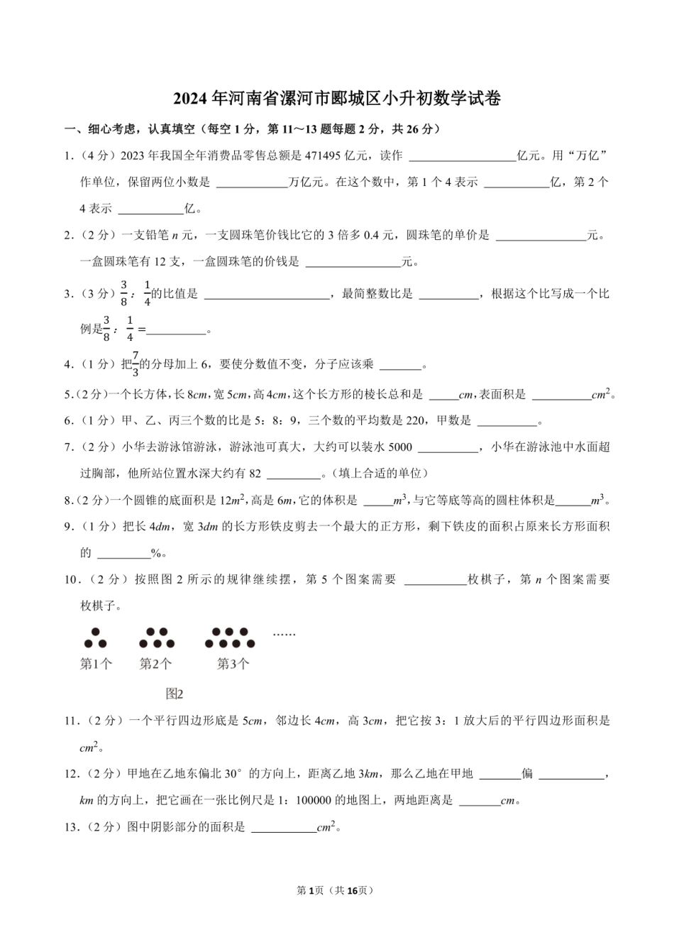 2024年河南省漯河市郾城区小升初数学试卷附答案解析.pdf本文件免费下载 【共16页】