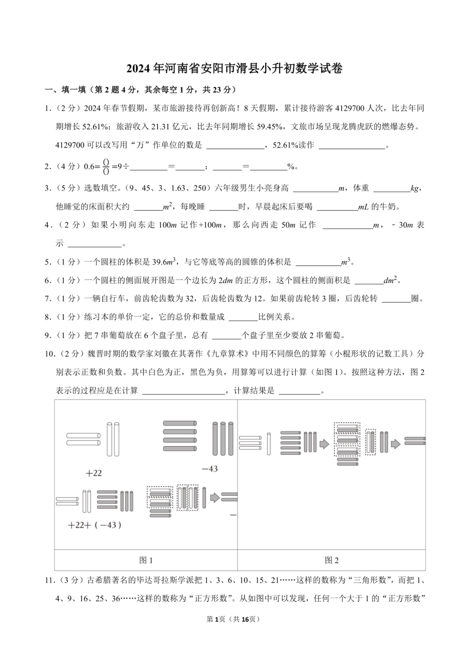 2024年河南省安阳市滑县小升初数学试卷附答案解析.pdf本文件免费下载 【共16页】