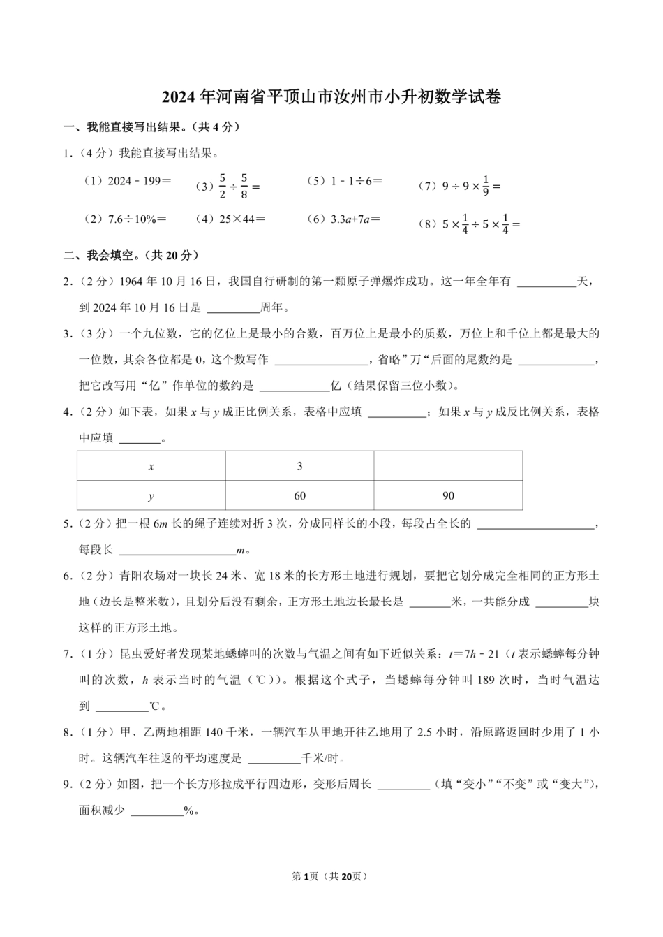 2024年河南省平顶山市汝州市小升初数学试卷附答案解析.pdf本文件免费下载 【共20页】