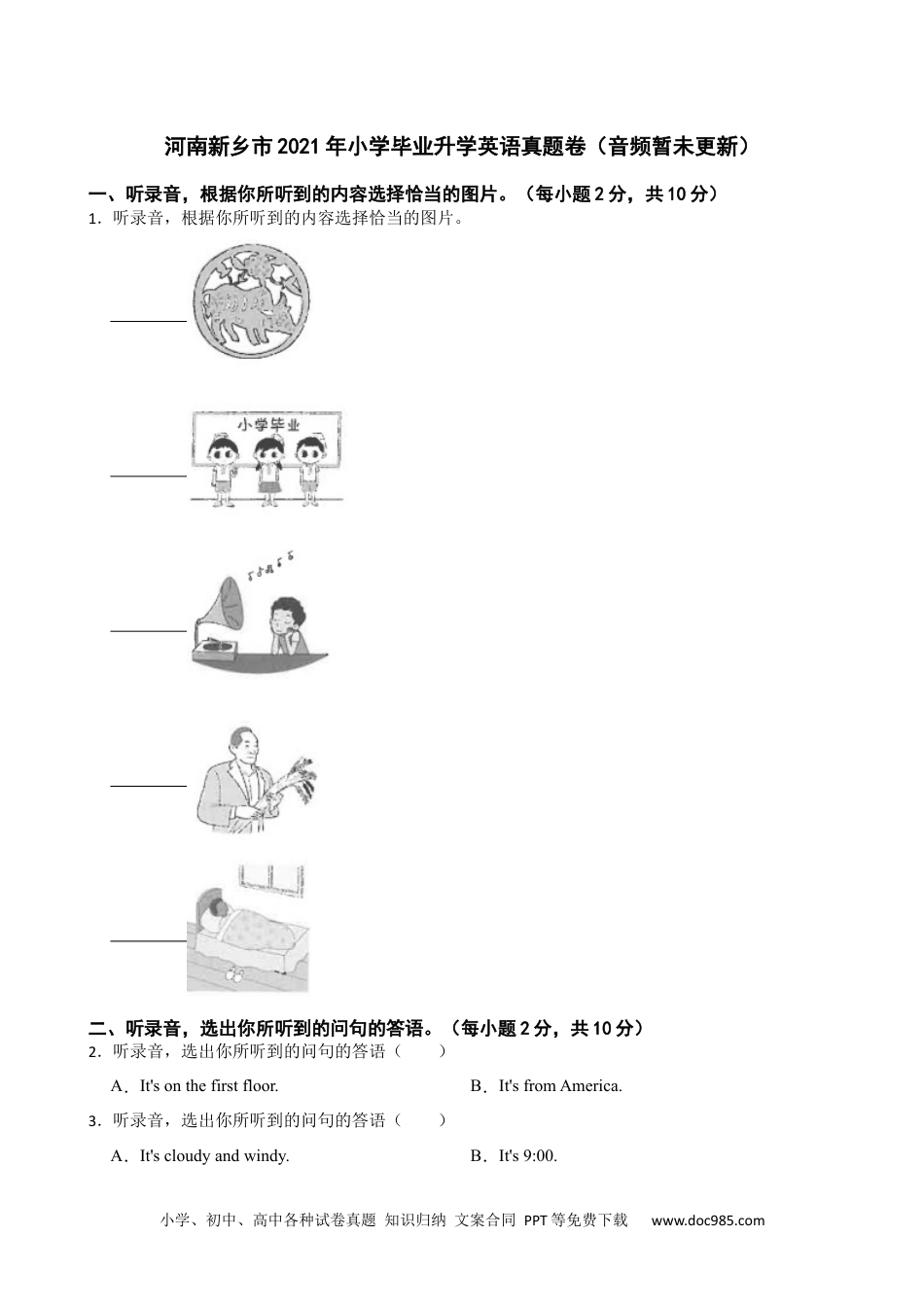 小学、初中、高中各种试卷真题知识归纳文案合同PPT等免费下载www.doc985.com河南新乡市2021年小学毕业升学英语真题卷(音频暂未更新)一、听录音,根据你所听到的内容选择恰当的图片。(每小题2分,共10分)1.听录音,根据你所听到的内容选择恰当的图片。二、听录音,选出你所听到的问句的答语。(每小题2分,共10分)2.听录音,选出你所听到的问句的答语()A.It'sonthefirstfloor.B.It'sfromAmerica.3.听录音,选出你所听到的问句的答语()A.It'scloudyandwindy.B.It's9:00.小学、初中、高中各种试卷真题知识归纳文案合同PPT等免费下载www.doc985.com4.听录音,选出你所听到的问句的答语()A.I'mgoingshoppingwithmymother.B.I'mdoingexercise.5.听录音,选出你所听到的问句的答语()A.Tomorrowmorning.B.Yesterdayafternoon.6.听录音,选出你所听到的问句的答语()A.Thankyou.B.Bybike.三、听录音,选答案。听下面三段对话或独白。每段对话或独白后有1至2个小题。从题中所给的A、B两个选项中选出最佳答案。(每小题2分,共10分)7.What'sMike'suncle'sjob?A.Heisaworker.B.Heisateacher.听录音,回答问题。8.WhatdoesHuBinlike?A.Usingcomputers.B.Sports.9.Whereishegoingtowork?A.Inanofice.B.Inagym.听录音,回答问题。10.HowdidRosegotoBeijing?A.Byplane.B.Bytrain.11.WhatdidAmydolastsummerholiday?A.Shestayedathomeanddidhomework.B.ShewenttoBeijing.四、选择每组单词中画线部分读音与所给单词画线部分读音相同的选项。(每小题2分,共10分)12.选择每组单词中画线部分读音与所给单词画线部分读音相同的选项(1)dreamA.easyB.headC.breakfast(2)goodA.footB.foodC.cool(3)horseA.workB.wordC.morning(4)slowA.cowB.snowC.flower小学、初中、高中各种试卷真题知识归纳文案合同PPT等免费下载www.doc985.com(5)thirdA.thatB.thinC.those五、情景交际。(每小题2分,共20分)13.从方框中选出下列问句的答语。⑴Whathappened?⑵Areyouallright?⑶What'syourhobby?⑷Whatsizeareyourshoes?⑸WhatwillyoudoforyourfatheronFather'sDay?A.Size35.B.Yes,I'mOKnow.C.Ilikegoinghiking.D.IwillsingEnglishsongsforhim.E.Ifelloffmybikeyesterdayandhurtmyfoot.14.从方框中选出相应的句子补全对话,将句子序号填在题目中相应的横线上。A.Idon'tknow.B.Youarewelcome.C.First,gostraight.D.Thepostofficeisnexttothecinema.E.Canyoutellmethewaytothepostoffice?Amy:Excuseme.Whereisthepostoffice?Mike:I'msorry.Youcanaskthepolicemanoverthere.Amy:Thankyouallthesame.Amy:Excuseme.Policeman:Ofcourse.Andyou'llseeacinema.Amy:Andthen?Policeman:Amy:Oh,Isee.Thankyou.Policeman:六、用方框中单词的适当形式填空。(每小题2分,共20分)15.用方框中单词的适当形式填空。likesendchildplayonSarahheavyusebetalk(1)IhaveChinese,English,mathandmusicTuesday.小学、初中、高中各种试卷真题知识归纳文案合同PPT等免费下载www.doc985.com(2)Therenocomputersinmyoldschool20yearsago.(3)Damingwantstobeascientistlikegrandfather.(4)Johnisaboutasportsmeetingnow.(5)SomeinJiangxi,China,gotoschoolbyferryeveryday.(6)Ididn'twinterbefore.ButnowIlovetoice-skate,soIlikewinter.(7)LittleRed-Capisgoingtoapieceofsweetcaketohergrandmothertomorrow.(8)InthePEclass,Mikesometimesbasketballinthegym.(9)Lookatthetwoboys.Thisoneisthanthatone.(10)Atthattime,peoplecouldn'ttheIntenet.七、阅读理解。(每小题2分,共10分)根据短文内容,判断句子正误。Onceuponatime,therewasaboy.Helookedafterhissheeponthehill.Theboywasbored(无聊的).Herantothevillage.Heshouted,"Help!Help!Thewolf(狼)iscoming!”Everyonerantothefieldtohelphim.Buttherewasnowolf.Theboylaughed.“Haha…Thereisnowolf.Youarefooled!"Thevillagerswereangry.Thenextday,theboyrantothevillageag...