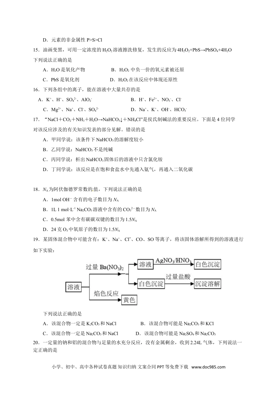 青浦区2017~2018学年第一学期教学质量检测高三化学试卷2017.12考生注意:1.本试卷满分100分,考试时间60分钟。2.本考试设试卷和答题纸两部分,试卷包括试题与答题要求;所有答题必须涂(选择题)或写(非选择题)在答题纸上;做在试卷上一律不得分。3.答题前,考生务必在答题纸上用钢笔或圆珠笔清楚填写学校、班级、姓名、准考证号。4.答题纸与试卷在试题编号上是一一对应的,答题时应特别注意,不能错位。相对原子质量:H-1C-12O-16S—32Fe—56一、选择题(本题共40分,每小题2分,每题只有一个正确选项)。1.下列物质不属于合金的是A.铝B.青铜C.不锈钢D.生铁2.既含离子键又含共价键的物质是A.H2B.MgC12C.H2OD.KOH3.下列表示方法错误的是A.CO2的电子式B.Cl2的结构式:Cl-ClC.CH4的球棍模型D.Clˉ离子的结构示意图4.关于氯化铵的说法错误的是A.氯化铵溶于水放热B.氯化铵受热易分解C.氯化铵固体是离子晶体D.氯化铵是强电解质5.下列过程属于物理变化的是A.煤的干馏B.石油的分馏C.石油裂化D.石油裂解6.能通过化学反应使溴水褪色的是A.苯B.乙烷C.乙烯D.乙酸7.潮湿的氯气、新制的氯水及漂粉精的水溶液均能使有色布条褪色,因为它们都含有A.C12B.HC1OC.C1O‾D.HC1小学、初中、高中各种试卷真题知识归纳文案合同PPT等免费下载www.doc985.com8.的名称是A.1-甲基-4-乙基戊烷B.2-乙基戊烷C.1,4二甲基己烷D.3-甲基庚烷9.属于人工固氮的是A.工业合成氨B.闪电时,氮气转化为NOC.用NH3和CO2合成尿素D.用硫酸吸收氨气得到硫酸铵10.工业生产水煤气的反应为:C(s)+H2O(g)→CO(g)+H2(g)-131.4kJ,下列表述正确的是A.反应物能量总和大于生成物能量总和B.CO(g)+H2(g)→C(s)+H2O(l)+131.4kJC.水煤气反应中每生成1LCO气体吸收131.4kJ热量D.水煤气反应中每生成1molH2(g)吸收131.4kJ热量11.将锌片和铜片插入同浓度的稀硫酸中,甲中将锌片和铜片用导线连接,一段时间后,下列叙述正确的是A.两烧杯中的铜片都是正极B.甲中铜被氧化,乙中锌被氧化C.产生气泡的速率甲比乙快D.两烧杯中铜片表面均无气泡产生12.下列反应的离子方程式书写正确的是A.Na2CO3溶液中滴入少量盐酸:CO32-+2H+→CO2↑+H2OB.铁粉与稀H2SO4反应:2Fe+6H+→2Fe3++3H2↑C.Cu(OH)2与稀H2SO4反应:OH-+H+→H2OD.氯气与氢氧化钠溶液反应Cl2+2OH‾→ClO‾+Cl‾+H2O13.已知:CH3Cl为CH4的一氯代物,CHCHCH3CH3CH3CH3的一氯代物有A.1种B.2种C.3种D.4种14.关于P、S、Cl三种元素的说法错误的是A.原子半径P>S>ClB.最高价氧化物对应水化物的酸性H3PO4<H2SO4<HClO4C.氢化物的稳定性PH3<H2S<HCl[来源:Zxxk.Com]小学、初中、高中各种试卷真题知识归纳文案合同PPT等免费下载www.doc985.comD.元素的非金属性P>S>Cl15.油画变黑,可用一定浓度的H2O2溶液擦洗修复,发生的反应为4H2O2+PbS→PbSO4+4H2O下列说法正确的是A.H2O是氧化产物B.H2O2中负一价的氧元素被还原C.PbS是氧化剂D.H2O2在该反应中体现还原性16.下列各组中的离子,能在溶液中大量共存的是A.K+、H+、SO42-、AlO2-B.H+、Fe2+、NO3-、Cl-C.Mg2+、Na+、Cl-、SO42-D.Na+、K+、OH-、HCO3-17.“NaCl+CO2+NH3+H2O→NaHCO3↓+NH4Cl”是侯氏制碱法的重要反应。下面是4位同学对该反应涉及的有关知识发表的部分见解。错误的是A.甲同学说:该条件下NaHCO3的溶解度较小B.乙同学说:NaHCO3不是纯碱C.丙同学说:析出NaHCO3固体后的溶液中只含氯化铵D.丁同学说:该反应是在饱和食盐水中先通入氨气,再通入二氧化碳18.NA为阿伏伽德罗常数的值,下列说法正确的是A.1molOH-含有的电子数目为NAB.1L1mol·L-1Na2CO3溶液中含有的CO32-数目为NAC.0.5mol苯中含有碳碳双键的数目为1.5NAD.24克O3中氧原子的数目为1.5NA19.某固体混合物中可能含有:K+、Na+、Clˉ、CO、SO等离子,将该固体溶解所得到的溶液进行如下实验:下列说法正确的是A.该混合物一定是K2CO3和NaClB.该混合物可能是Na2CO3和KClC.该混合物一定是Na2CO3和NaClD.该混合物可能是Na2SO4和Na2CO3[来源:学*科*网Z*X*X*K]20.一定量的钠和铝的混合物与足量的水充分反应,没有...