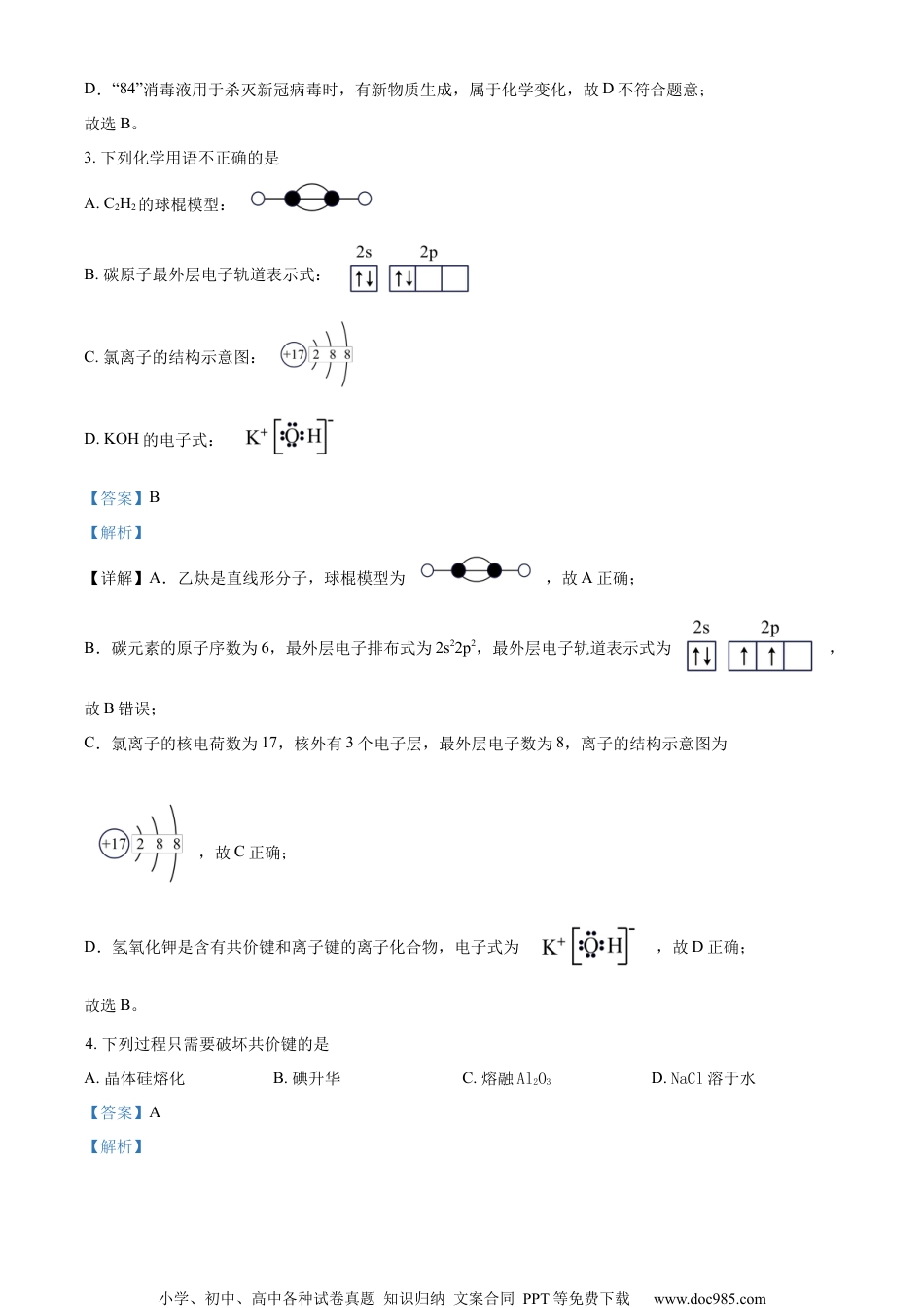 小学、初中、高中各种试卷真题知识归纳文案合同PPT等免费下载www.doc985.com上海市崇明区2022-2023学年高三下学第二次模拟考试化学试题(满分100分,时间60分钟)注意:1.所有答案必须涂或写在答题纸上;做在本卷上一律不得分。2.答题纸与本卷在试题编号上是一一对应的,答题时应特别注意,不能错位。可能用到的相对原子质量:O-16N-14S-32Ba-137Cu-64一、选择题(每小题2分,共40分,每小题只有一个正确选项)1.科学家通过测定地球岩石和球粒陨石中比例差异,为月球起源“大撞击”假说提供了重要证据。25Mg与24Mg的说法正确的是A.互为同素异形体B.具有相同质量数C.具有相似的化学性质D.具有相同的中子数【答案】C【解析】【详解】A.25Mg与24Mg是质子数相同,中子数不同,两者互为同位素,故A错误;B.25Mg与24Mg两者的质量数分别为25、24,故B错误;C.金属性的化学性质主要取决于最外层电子数,两者最外层电子数相同,因此25Mg与24Mg两者具有相似的化学性质,故C正确;D.25Mg与24Mg两者的中子数分别为13、12,故D错误。综上所述,答案为C。2.下列过程中没有发生化学变化的是A.二氧化硫作纸浆的漂白剂B.用苯提取溴水中的溴C.明矾作净水剂D.“84”消毒液用于杀灭新冠病毒【答案】B【解析】【详解】A.二氧化硫作纸浆的漂白剂时,有新物质生成,属于化学变化,故A不符合题意;B.用苯提取溴水中的溴时,利用的是溴易溶于苯的特点,没有新物质生成,属于物理变化,故B符合题意;C.明矾作净水剂时,有新物质生成,属于化学变化,故C不符合题意;小学、初中、高中各种试卷真题知识归纳文案合同PPT等免费下载www.doc985.comD.“84”消毒液用于杀灭新冠病毒时,有新物质生成,属于化学变化,故D不符合题意;故选B。3.下列化学用语不正确的是A.C2H2的球棍模型:B.碳原子最外层电子轨道表示式:C.氯离子的结构示意图:D.KOH的电子式:【答案】B【解析】【详解】A.乙炔是直线形分子,球棍模型为,故A正确;B.碳元素的原子序数为6,最外层电子排布式为2s22p2,最外层电子轨道表示式为,故B错误;C.氯离子的核电荷数为17,核外有3个电子层,最外层电子数为8,离子的结构示意图为,故C正确;D.氢氧化钾是含有共价键和离子键的离子化合物,电子式为,故D正确;故选B。4.下列过程只需要破坏共价键的是A.晶体硅熔化B.碘升华C.熔融Al2O3D.NaCl溶于水【答案】A【解析】小学、初中、高中各种试卷真题知识归纳文案合同PPT等免费下载www.doc985.com【详解】A.晶体硅是原子晶体,熔化时破坏的是共价键,故A正确;B.碘是分子晶体,升华时克服分子间作用力,故B错误;C.氧化铝是离子化合物,熔融时破坏的是离子键,故C错误;D.氯化钠是离子化合物,溶于水时破坏的是离子键,故D错误;答案选A。5.下列属于弱电解质的是A.CaCO3B.SO2C.NH3·H2OD.Ba(OH)2【答案】C【解析】【详解】A.CaCO3属于盐,属于强电解质,故A不符合题意;B.SO2是非金属性氧化物,属于非电解质,故B不符合题意;C.NH3·H2O属于弱碱,属于弱电解质,故C符合题意;D.Ba(OH)2属于强碱,属于强电解质,故D不符合题意。综上所述,答案为C。6.下列水溶液因水解而呈碱性的是A.Na2CO3B.BaCl2C.(NH4)2SO4D.Ca(OH)2【答案】A【解析】【详解】A.碳酸钠是强碱弱酸盐,碳酸根离子在溶液中水解使溶液呈碱性,故A符合题意;B.氯化钡是强酸强碱盐,在溶液中不水解,溶液呈中性,故B不符合题意;C.硫酸铵是强酸弱碱盐,铵根离子在溶液中水解使溶液呈酸性,故C不符合题意;D.氢氧化钙是强碱,溶于水的氢氧化钙在溶液中完全电离出的氢氧根离子使溶液呈碱性,故D不符合题意;故选A。7.下列事实不能用键能的大小来解释的是A.N2的化学性质稳定B.H2O比H2S沸点高C.HF、HCl、HBr的稳定性逐渐减弱D.金刚石比晶体硅的熔点高【答案】B【解析】【详解】A.氮气分子中含有氮氮三键,氮氮三键的键能大,化学性质稳定,则氮气的化学性质稳定能用键能的大小来解释,故A不符合题意;小学、初中、高中各种试卷真题知识归纳文案合同PPT等免费下载www.doc985.comB.水分子能形成分子间氢键,硫化氢不能形成分子间氢键,所以水分子间的作用力大于硫化氢,沸点高...