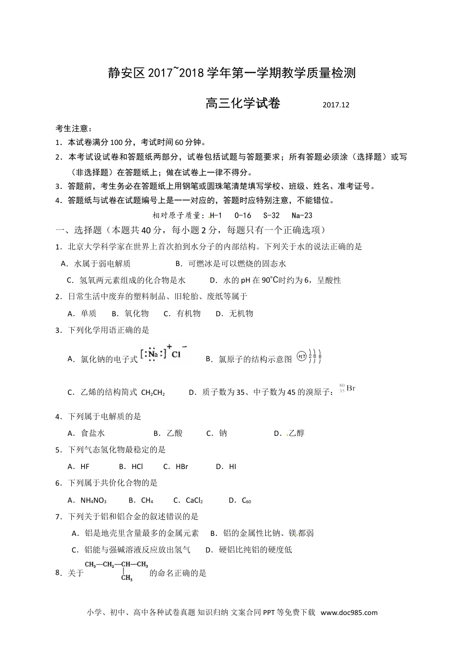 静安区2017~2018学年第一学期教学质量检测高三化学试卷2017.12考生注意:1.本试卷满分100分,考试时间60分钟。2.本考试设试卷和答题纸两部分,试卷包括试题与答题要求;所有答题必须涂(选择题)或写(非选择题)在答题纸上;做在试卷上一律不得分。3.答题前,考生务必在答题纸上用钢笔或圆珠笔清楚填写学校、班级、姓名、准考证号。4.答题纸与试卷在试题编号上是一一对应的,答题时应特别注意,不能错位。相对原子质量:H-1O-16S-32Na-23一、选择题(本题共40分,每小题2分,每题只有一个正确选项)1.北京大学科学家在世界上首次拍到水分子的内部结构。下列关于水的说法正确的是A.水属于弱电解质B.可燃冰是可以燃烧的固态水C.氢氧两元素组成的化合物是水D.水的pH在90℃时约为6,呈酸性2.日常生活中废弃的塑料制品、旧轮胎、废纸等属于A.单质B.氧化物C.有机物D.无机物3.下列化学用语正确的是A.氯化钠的电子式B.氯原子的结构示意图C.乙烯的结构简式CH2CH2D.质子数为35、中子数为45的溴原子:4.下列属于电解质的是A.食盐水B.乙酸C.钠D.乙醇5.下列气态氢化物最稳定的是A.HFB.HClC.HBrD.HI6.下列属于共价化合物的是A.NH4NO3B.CH4C.CaCl2D.C607.下列关于铝和铝合金的叙述错误的是A.铝是地壳里含量最多的金属元素B.铝的金属性比钠、镁都弱C.铝能与强碱溶液反应放出氢气D.硬铝比纯铝的硬度低8.关于的命名正确的是小学、初中、高中各种试卷真题知识归纳文案合同PPT等免费下载www.doc985.comA.2-乙基丙烷B.3-甲基丁烷C.2-甲基戊烷D.2-甲基丁烷9.下列有关实验的判断正确的是A.向某溶液中滴加氯水,再滴加KSCN溶液,溶液变为红色,该溶液一定含有Fe2+B.CO2中含少量SO2,可将该混合气体通入足量饱和Na2CO3溶液中除去SO2C.向品红溶液中通入气体X,品红溶液褪色,则气体X可能是Cl2D.将某气体通入Ba(NO3)2溶液中生成白色沉淀,此沉淀是BaSO310.配制一定物质的量浓度的NaOH溶液,下列操作正确的是A.称量时,应将NaOH固体放在称量纸上称量B.将称量的NaOH固体置于小烧杯中溶解,待溶液冷却至室温再转移C.定容时若加水超过了刻度线,可用胶头滴管直接将多余溶液吸出D.为减小误差,容量瓶必须干燥才可使用11.波义耳在《怀疑的化学家》一书中说:“在火的单独作用下,玻璃容器中的水银会丧失其原有的银色,变成一种红色物质;而无须使用任何附加试剂,用这种红色物质也可以得到汞”。该过程可表示为:下列说法错误的是A.波义耳所描述的变化属于氧化还原反应B.此反应可粗略测定空气中氧气的含量C.波义耳所描述的变化是一个可逆的化学反应D.用热分解法可由氧化汞制得单质汞12.实验室欲用氯气制单质碘,下列装置不能达到实验目的的是A.用装置甲制取少量氯气B.用装置乙氧化溶液中的碘离子C.用装置丙提取置换出来的碘D.用装置丁过滤得纯净的碘单质13.有关短周期元素原子的说法正确的是A.当原子形成简单离子后,其最外层上的电子数可超过8个B.原子最外层上的电子数少于4个时,电子数越多,还原性越强小学、初中、高中各种试卷真题知识归纳文案合同PPT等免费下载www.doc985.comC.原子核外电子中,最外层上的电子能量最高D.当最外层上的电子数变为4个时即达稳定结构14.盐酸和碳酸氢钙溶液反应的离子方程式正确的是A.H++HCO3-→CO2↑+H2OB.2H++CO32-→CO2↑+H2OC.H++Ca(HCO3)2→Ca2++2CO2↑+H2OD.2H++Ca(HCO3)2→Ca2++2CO2↑+2H2O15.化学中存在许多“守恒或相等”。下列说法错误的是A.用水稀释浓溶液时,稀释前溶质质量与稀释后溶质质量相等B.化学反应中,反应物的物质的量之和与生成物的物质的量之和相等C.氧化还原反应中,氧化剂得电子总数与还原剂失电子总数相等D.化学反应中,消耗的反应物总质量与所生成产物的总质量相等16.对于反应中的能量变化,表述正确的是A.加热才能发生的反应肯定属于吸热反应B.化学变化时形成化学键的过程需吸收能量C.放热反应中,反应物的总能量大于生成物的总能量D.电解是化学能转变为电能的过程17.X、Y、Z、W为短周期元素,其原子半径、化合价等信息见下表。有关这四种元素的说法一定正确的...