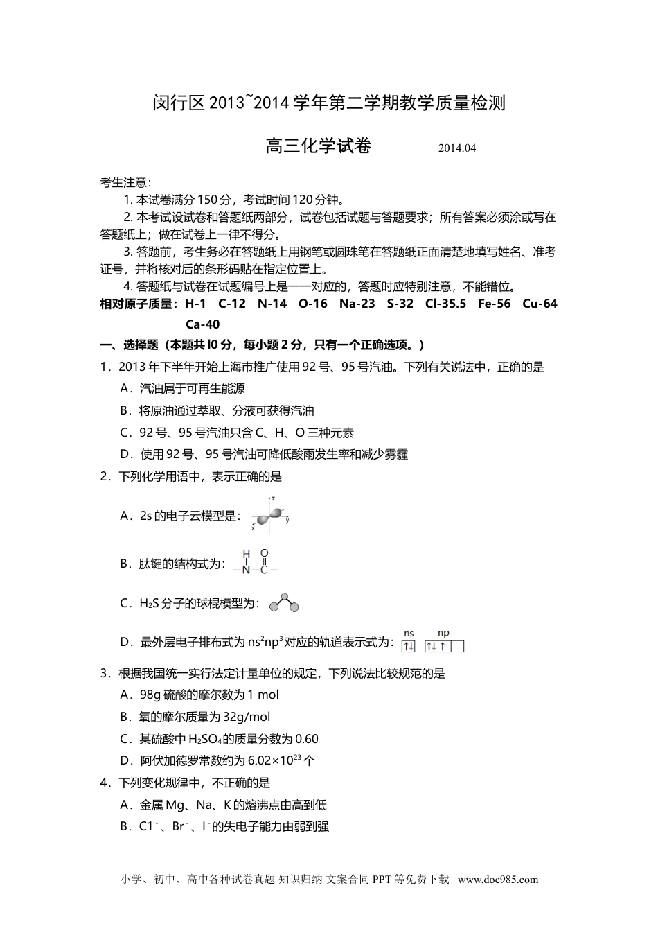 闵行区2013~2014学年第二学期教学质量检测高三化学试卷2014.04考生注意:1.本试卷满分150分,考试时间120分钟。2.本考试设试卷和答题纸两部分,试卷包括试题与答题要求;所有答案必须涂或写在答题纸上;做在试卷上一律不得分。3.答题前,考生务必在答题纸上用钢笔或圆珠笔在答题纸正面清楚地填写姓名、准考证号,并将核对后的条形码贴在指定位置上。4.答题纸与试卷在试题编号上是一一对应的,答题时应特别注意,不能错位。相对原子质量:H-1C-12N-14O-16Na-23S-32Cl-35.5Fe-56Cu-64Ca-40一、选择题(本题共l0分,每小题2分,只有一个正确选项。)1.2013年下半年开始上海市推广使用92号、95号汽油。下列有关说法中,正确的是A.汽油属于可再生能源B.将原油通过萃取、分液可获得汽油C.92号、95号汽油只含C、H、O三种元素D.使用92号、95号汽油可降低酸雨发生率和减少雾霾2.下列化学用语中,表示正确的是A.2s的电子云模型是:B.肽键的结构式为:C.H2S分子的球棍模型为:D.最外层电子排布式为ns2np3对应的轨道表示式为:3.根据我国统一实行法定计量单位的规定,下列说法比较规范的是A.98g硫酸的摩尔数为1molB.氧的摩尔质量为32g/molC.某硫酸中H2SO4的质量分数为0.60D.阿伏加德罗常数约为6.02×1023个4.下列变化规律中,不正确的是A.金属Mg、Na、K的熔沸点由高到低B.C1-、Br-、I-的失电子能力由弱到强小学、初中、高中各种试卷真题知识归纳文案合同PPT等免费下载www.doc985.comC.H+、Li+、H-的半径由小到大D.物质SiO2、SiC、Si中共价键由弱到强5.有关物质结构的叙述中,正确的是A.只含有共价键的物质不一定是共价化合物B.由电子定向移动而导电的物质一定是金属晶体C.有键能很大的共价键存在的物质熔沸点一定很高D.原子晶体中只存在非极性共价键二、选择题(本题共36分,每小题3分,只有一个正确选项。)6.下列反应所得溶液中,一定只含一种溶质的是A.向铁粉中加入稀硝酸B.向烧碱溶液中通入CO2气体C.向稀盐酸中滴入少量的NaAlO2溶液D.向MgSO4、H2SO4的混合溶液中加入过量的Ba(OH)2溶液7.针对右图装置的说法中,正确是A.溶液中pH值明显下降B.铁片为正极,镀锌铁片为负极C.阴极的电极反应式:Fe-2e→Fe2+D.电子由锌经溶液流向铁8.下列说法中,正确的是A.35Cl、37Cl为互为同位素,有不同的化学性质B.氯气和二氧化硫使品红褪色的原理相同C.浓硝酸和浓硫酸在空气中放置一段时间后浓度都会降低D.卤化氢在空气中都能形成白雾,它们都是强电解质9.设NA为阿伏加德罗常数的值。下列叙述中,正确的是A.12.0gNaHSO4晶体中阳离子和阴离子的总数为0.3NAB.14g分子式CnH2n的链烃中含有的碳碳双键的数目一定为NA/nC.标准状况下,1L液态水中含有的H+数目为10-7NAD.足量Zn与一定量的浓硫酸反应,产生22.4L气体时,转移的电子数为2NA10.已知热化学方程式N2(g)+3H2(g)2NH3(g)+QkJ(Q>0),下列说法中,正确的是A.1molN2(g)和3molH2(g)具有的能量之和低于2molNH3(g)具有的能量B.将1molN2(g)和3molH2(g)置于一密闭容器中充分反应后放出QkJ的热量C.升高温度,平衡向逆反应方向移动,上述热化学方程式中的Q值减小D.将一定量N2(g)和H2(g)置于某密闭容器中充分反应后放热QkJ,则此过程中有3molH2被氧化小学、初中、高中各种试卷真题知识归纳文案合同PPT等免费下载www.doc985.com11.下列说法中,正确的是A.在纸上层析操作时,要让试样点刚好接触展开剂,否则不能很好地分离。B.实验室制备硝基苯时,先将浓硫酸滴入浓硝酸后,冷却,再边振荡边滴加苯。C.从海带中提取碘的方法是:取样→灼烧→溶解→过滤→萃取。D.向盛有少量Na2O2的试管中加入少量水,并立即滴入2滴酚酞,振荡,溶液呈红色。12.下表为各物质中所含少量杂质以及除去这些杂质所选用的试剂或操作方法,正确的是序号物质杂质除杂质应选用的试剂或操作方法①KNO3溶液KOH加入FeCl3溶液,并过滤②Al2(SO4)3溶液MgSO4加入过量烧碱后过滤,再用硫酸酸化滤液③CH4C2H4通过盛有酸性高锰酸钾溶液的洗气瓶,再通过盛有浓硫酸的洗气瓶④NaNO3CaCO3溶解、过滤、蒸发结晶A.④B.③④C.①④D.②③13.下列变...