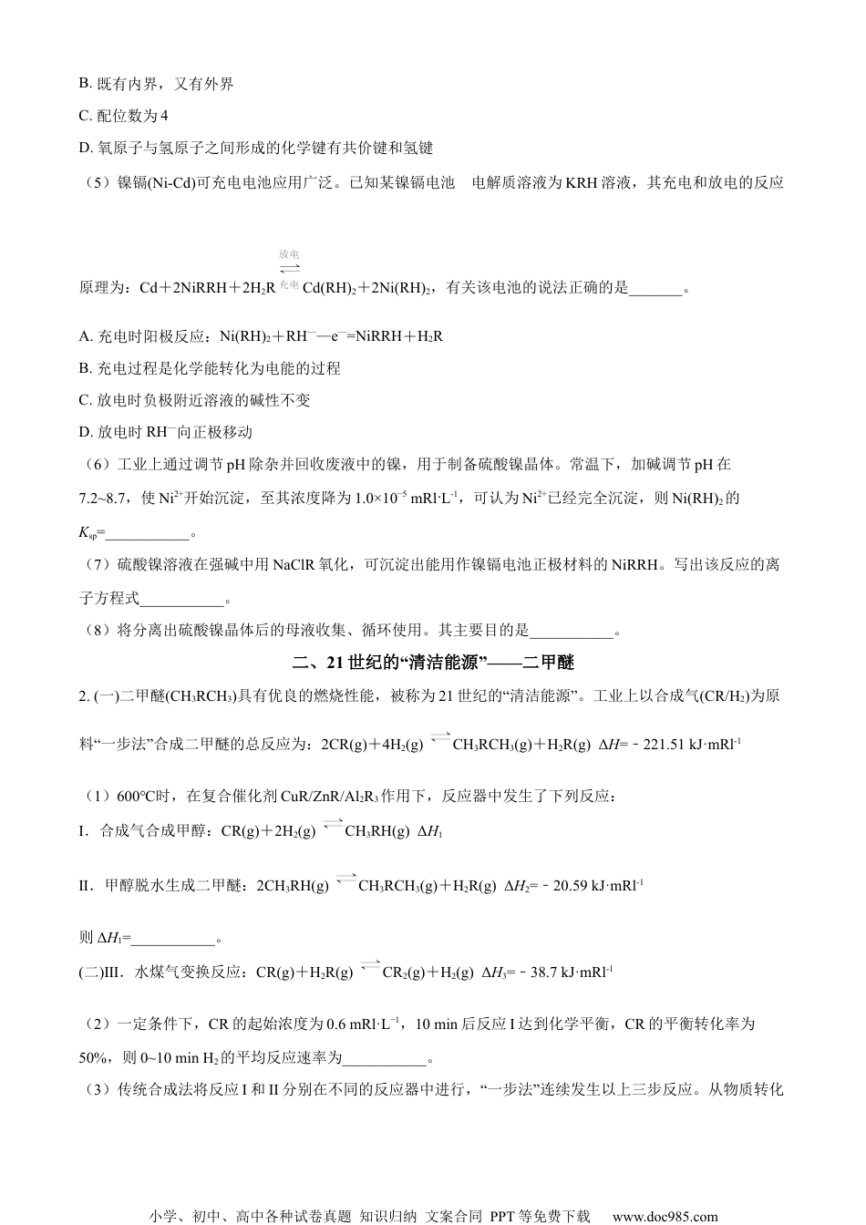 小学、初中、高中各种试卷真题知识归纳文案合同PPT等免费下载www.doc985.com上海市奉贤区2065-2024学年高三下学期二模练习卷化学试题考生注意:1.试卷满分100分,考试时间60分钟。2.本考试分设试卷和答题纸。答题前,务必在答题纸上填写学校、姓名、考号,将条形码贴在指定位置。答题时,必须将答案涂或写在答题纸上,在试卷上答题一律不得分。3.选择类试题中,标注“不定项”的试题,每小题有1~2个正确选项,未特别标注的试题,每小题只有1个正确选项。相对原子质量:R−16Na−65Cl−35.5一、镍—古老而又年轻的金属1.镍颜色近似银白色,我国古时使用“白铜”(一种镍铜合金)制造兵器。现代工业镍及其化合物主要用于生产不锈钢、电池以及催化剂领域。(1)基态镍原子的价电子排布式为___________,镍元素在周期表中的位置为___________。(2)金属镍与镧(La)形成的合金是一种良好的储氢材料,其晶胞结构示意图如下图所示,该合金的化学式为___________。A.LaNi5B.LaNi6C.LaNi8D.LaNi9(3)已知NiR、FeR的晶体结构类型均与氯化钠相同,Ni2+和Fe2+的半径分别为69pm和78pm,则熔点NiR___________FeR(选填“<””或“>”),理由是___________。(4)丁二酮肟常用于检验Ni2+:在稀氨水介质中,丁二酮肟与Ni2+反应生成鲜红色沉淀,其结构如图所示,下列关于该配合物结构分析正确的是__________。A.配体的分子式为C8H14N4R4小学、初中、高中各种试卷真题知识归纳文案合同PPT等免费下载www.doc985.comB.既有内界,又有外界C.配位数为4D.氧原子与氢原子之间形成的化学键有共价键和氢键(5)镍镉(Ni-Cd)可充电电池应用广泛。已知某镍镉电池的电解质溶液为KRH溶液,其充电和放电的反应原理为:Cd+2NiRRH+2H2RCd(RH)2+2Ni(RH)2,有关该电池的说法正确的是_______。A.充电时阳极反应:Ni(RH)2+RH——e—=NiRRH+H2RB.充电过程是化学能转化为电能的过程C.放电时负极附近溶液的碱性不变D.放电时RH—向正极移动(6)工业上通过调节pH除杂并回收废液中的镍,用于制备硫酸镍晶体。常温下,加碱调节pH在7.2~8.7,使Ni2+开始沉淀,至其浓度降为1.0×10−5mRl·L-1,可认为Ni2+已经完全沉淀,则Ni(RH)2的Ksp=___________。(7)硫酸镍溶液在强碱中用NaClR氧化,可沉淀出能用作镍镉电池正极材料的NiRRH。写出该反应的离子方程式___________。(8)将分离出硫酸镍晶体后的母液收集、循环使用。其主要目的是___________。二、21世纪的“清洁能源”——二甲醚2.(一)二甲醚(CH3RCH3)具有优良的燃烧性能,被称为21世纪的“清洁能源”。工业上以合成气(CR/H2)为原料“一步法”合成二甲醚的总反应为:2CR(g)+4H2(g)CH3RCH3(g)+H2R(g)ΔH=﹣221.51kJ·mRl-1(1)600℃时,在复合催化剂CuR/ZnR/Al2R3作用下,反应器中发生了下列反应:Ⅰ.合成气合成甲醇:CR(g)+2H2(g)CH3RH(g)ΔH1Ⅱ.甲醇脱水生成二甲醚:2CH3RH(g)CH3RCH3(g)+H2R(g)ΔH2=﹣20.59kJ·mRl-1则ΔH1=___________。(二)Ⅲ.水煤气变换反应:CR(g)+H2R(g)CR2(g)+H2(g)ΔH3=﹣38.7kJ·mRl-1(2)一定条件下,CR的起始浓度为0.6mRl·L−1,10min后反应I达到化学平衡,CR的平衡转化率为50%,则0~10minH2的平均反应速率为___________。(3)传统合成法将反应I和II分别在不同的反应器中进行,“一步法”连续发生以上三步反应。从物质转化小学、初中、高中各种试卷真题知识归纳文案合同PPT等免费下载www.doc985.com和化学平衡的角度,分析“一步法”的优点是___________。(4)反应Ⅲ,水煤气变换部分基元反应如下:基元反应活化能Ea(eV)反应热ΔH(eV)①CR+H2R+2*=CR*+H2R*0-1.73②H2R*+*=H*+RH*0.81-0.41第②步基元反应逆反应的活化能为___________eV。(三)目前又有一种新合成二甲醚的方法是以CR2和H2为原料直接反应,其反应原理为:2CR2(g)+6H2(g)CH3RCH3(g)+3H2R(g)ΔH=﹣144.1kJ·mRl-1(5)在___________下该反应能自发进行。A.低温B.高温C.任何温度(6)在恒容绝热密闭容器中,下列能判断该反应达到化学平衡状态的是___________。A.v正(CR2)=3v逆(H2)B.容器内CH3RCH3体积分数不变C.容器内温度保持不变D.单位时间内断裂6mRlH—H键...