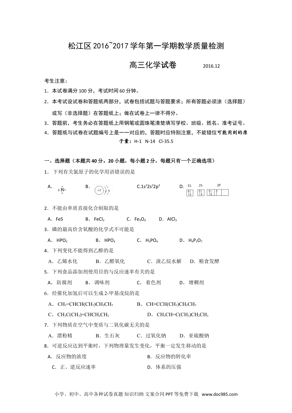 松江区2016~2017学年第一学期教学质量检测高三化学试卷2016.12考生注意:1.本试卷满分100分,考试时间60分钟。2.本考试设试卷和答题纸两部分,试卷包括试题与答题要求;所有答题必须涂(选择题)或写(非选择题)在答题纸上;做在试卷上一律不得分。3.答题前,考生务必在答题纸上用钢笔或圆珠笔清楚填写学校、班级、姓名、准考证号。4.答题纸与试卷在试题编号上是一一对应的,答题时应特别注意,不能错位可能用到的原子量:H-1N-14Cl-35.5一、选择题(本题共40分。20小题,每小题2分,每题只有一个正确选项)1.下列有关氮原子的化学用语错误的是A.B.C.1s22s22p3D.2.不能由单质直接化合制取的是A.FeSB.FeCl2C.Fe3O4D.AlCl33.磷的最高价含氧酸的化学式不可能是A.HPO2B.HPO3C.H3PO4D.H4P2O74.下列变化不能得到乙醇的是A.乙烯水化B.乙醛氧化C.溴乙烷水解D.粮食发酵5.下列食品添加剂使用目的与反应速率有关的是A.防腐剂B.调味剂C.着色剂D.增稠剂6.经催化加氢后可以生成2-甲基戊烷的是A.CH2=CHCH(CH3)CH2CH3B.CH≡CCH(CH3)CH2CH3C.CH3C(CH3)=CHCH2CH3D.CH3CH=C(CH3)CH2CH37.下列物质在空气中变质与二氧化碳无关的是A.漂粉精B.生石灰C.过氧化钠D.亚硫酸钠8.可逆反应达到平衡时,下列物理量发生变化,平衡一定发生移动的是A.反应物的浓度B.反应物的转化率C.正、逆反应速率D.体系的压强小学、初中、高中各种试卷真题知识归纳文案合同PPT等免费下载www.doc985.com9.下列有关物质性质的比较,正确的是A.熔点:Br2>I2B.水中溶解性:C2H5Br>C2H5OHC.密度:氨水>水D.碳碳键键长:苯>乙炔10.异丙苯的结构如图(),下列说法错误的是A.分子式为C9H12B.是苯的同系物C.不能使酸性高锰酸钾溶液褪色D.一氯代物有5种11.下列有关电化学分析正确的是实验分析ACuZn﹣原电池Cu为正极,发生还原反应B电解CuCl2溶液阳极析出铜C钢铁腐蚀主要是析氢腐蚀D将钢闸门与外加电源负极相连牺牲阳极阴极保护法12.反应2H2O2(l)2H2O(l)+O2(g)能量变化如图所示,下列说法错误的是A.该反应放热B.途径Ⅱ加入了催化剂C.1molH2O2(l)的能量高于1molH2O(l)的能量D.途径Ⅰ放出的热量多13.部分短周期元素原子最外层电子数与原子序数的关系如图。以下说法正确的是A.元素非金属性:R>WB.最高价氧化物对应水化物的酸性:Y>XC.与Z形成化合物的种类:X>YD.简单离子半径:W>R14.某无色溶液中可能含有I-、NH、Cu2+、SO32-,向该溶液中加入适量溴水,溶液呈无色,下列关于溶液组成的判断错误的是A.肯定不含I-B.肯定不含Cu2+C.肯定含有SO32-D.肯定含有NH15.用如下装置检验乙醇和浓硫酸反应生成的气体中含有乙烯,X、Y、Z分别是小学、初中、高中各种试卷真题知识归纳文案合同PPT等免费下载www.doc985.comA.品红、氢氧化钠、溴水B.溴水、氢氧化钠、品红C.氢氧化钠、品红、酸性高锰酸钾D.氢氧化钠、酸性高锰酸钾、溴水16.气体X和气体Y通入溶液Z的洗气瓶中(如图),一定没有沉淀生成的是XYZANO2SO2BaCl2BNH3O2Al2(SO4)3CNH3CO2NaClDCO2SO2CaCl217.向等物质的量浓度的NaOH和Na2CO3的混合溶液中加入稀硫酸,下列离子方程式与事实不相符的是A.OH-+CO32-+2H+→HCO3-+H2OB.2OH-+CO32-+4H+→CO2↑+3H2OC.2OH-+CO32-+3H+→HCO3-+2H2OD.OH-+CO32-+3H+→CO2↑+2H2O18.甲与乙在溶液中的转化关系如下图所示(反应条件省略),甲不可能是A.NH3B.AlO2-C.CO32-D.CH3COO-19.已知:Cl2+2NaOH→NaCl+NaClO+H2O,3Cl2+6NaOH→5NaCl+NaClO3+3H2O。一定量氯气与氢氧化钠恰好完全反应生成的NaClO与NaClO3的物质的量之比为4:1,则溶液中NaCl与NaClO3的物质的量浓度之比为A.11:2B.9:1C.9:4D.5:120.常温下amol·L-1稀氨水和bmol·L-1稀盐酸等体积混合,下列判断一定正确的是A.若a=b,则c(NH4+)=c(Cl-)B.若a>b,则c(NH4+)>c(Cl-)C.若a>b,则c(OH-)>c(H+)D.若a<b,则c(OH-)<c(H+)二、(本题共13分)可用以下方法处理尾气中的SO2。方法一:活性炭还原法:2C(s)+2SO2(g)S2(g)+2CO2(g)一定条件下,各物质浓度与时间的关系如图:21.第一次达到平衡...