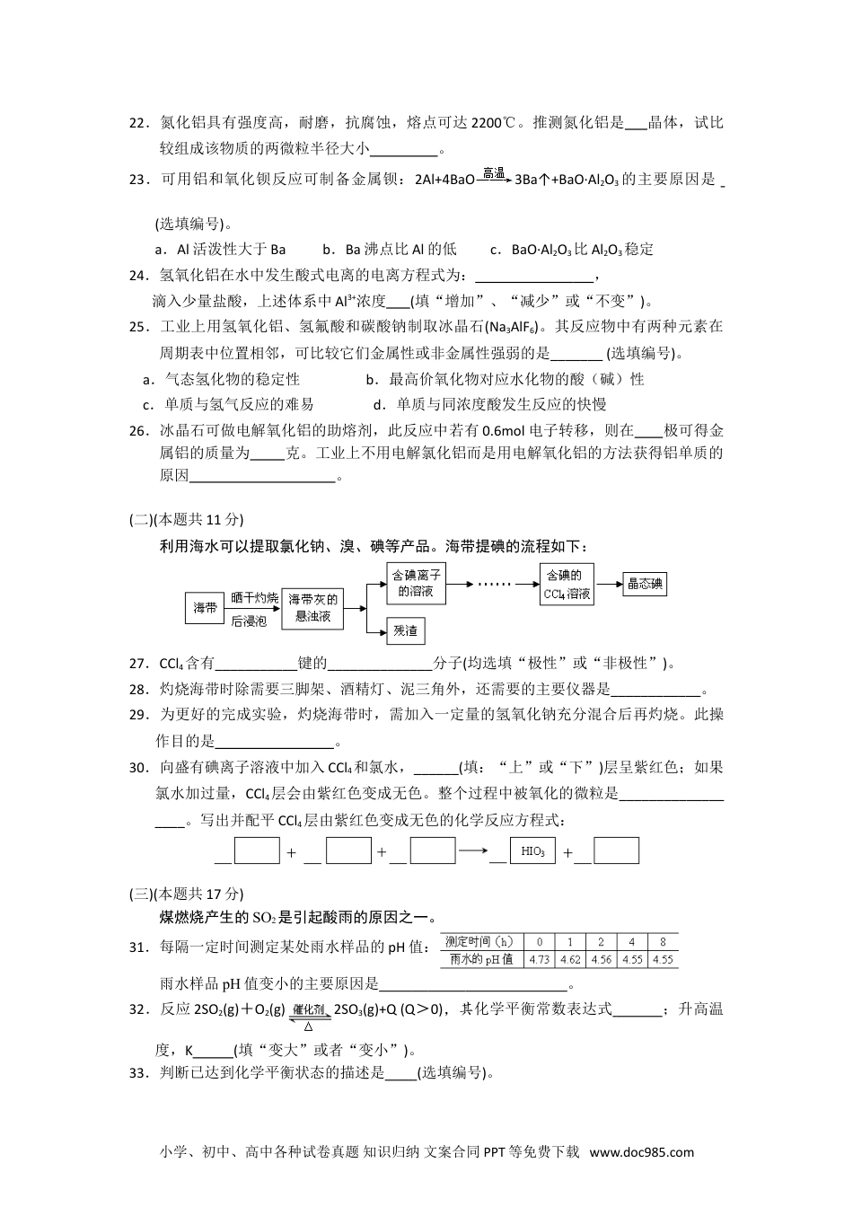 闵行区2016~2017学年第一学期教学质量检测高三化学试卷2016.12考生注意:1.本试卷满分100分,考试时间60分钟。2.本考试设试卷和答题纸两部分,试卷包括试题与答题要求;所有答题必须涂(选择题)或写(非选择题)在答题纸上;做在试卷上一律不得分。3.答题前,考生务必在答题纸上用钢笔或圆珠笔清楚填写学校、班级、姓名、准考证号。4.答题纸与试卷在试题编号上是一一对应的,答题时应特别注意,不能错位。可能用到的相对原子质量:H-1O-16Al-27Fe-56一、选择题(本题共40分,每小题2分,每题只有一个正确选项)1.工业上生产乙烯、丙烯的主要方法是A.裂化B.干馏C.分馏D.裂解2.熔点最高的晶体是A.干冰B.食盐C.碳化硅D.金刚石3.原子的种类取决于A.质子数B.质量数C.质子数和中子数D.原子序数4.化学式能表示物质分子组成的是A.C6H6B.SiO2C.NaOHD.NH4Cl5.用浓盐酸配制l∶l(体积比)的稀盐酸(约6mol/L)100mL,应选用的定量仪器A.量筒B.滴定管C.50mL容量瓶D.100mL容量瓶6.将Na、Na2O、NaHSO4、干冰、Si分别加热熔化,需要克服的作用力有A.2种B.3种C.4种D.5种7.下列溶液中通入SO2一定不会产生沉淀的是A.Ba(OH)2B.Na2SC.Ba(NO3)2D.BaCl28.分离混合液①乙酸乙酯和乙酸钠溶液②乙醇和丁醇的方法依次是A.分液、蒸馏B.萃取、蒸馏C.分液、萃取D.蒸馏、萃取9.常温下,由水电离的c(H+)=1×10-13mol/L的溶液中一定不可能大量存在的离子是A.NH4+B.HSO3-C.AlO2-D.Fe3+10.16O中的“16”表示的含义是氧元素的A.相对原子质量B.近似相对原子质量C.某种同位素质量数D.某种同位素质子数11.不能说明醋酸是弱电解质的是A.醋酸溶液导电性差B.醋酸溶液中存在醋酸分子C.醋酸钠溶液呈碱性D.0.1mol/L醋酸溶液的pH=2.912.有关实验叙述不正确的是A.滴定管、容量瓶和分液漏斗使用前都要检漏、干燥小学、初中、高中各种试卷真题知识归纳文案合同PPT等免费下载www.doc985.comB.滴定管没有用标准液润洗,会导致测定结果偏高C.滴定管中加标准液后,要调节液面位置在零刻度或以下D.胆矾结晶水含量测定时,需用小火缓慢加热,防止晶体飞溅13.反应A2(g)+B2(g)→2AB(g)的能量变化如图所示,叙述正确的是A.该反应是放热反应B.加入催化剂,(b-a)的差值减小C.每生成2molAB分子吸收bkJ热量D.若反应生成AB为液态,吸收的热量小于(a-b)kJ14.室温下,pH=4的盐酸和pH=10的氨水等体积混合后,所得溶液的pH值A.一定大于7B.一定等于7C.一定小于7D.可能大于715.实现Al3++3A1O2-+6H2O→Al(OH)3↓,正确的做法是A.向铝盐溶液中不断加入小苏打B.向偏铝酸钠溶液中不断滴加盐酸C.向烧碱溶液中不断滴入铝盐溶液D.向铝盐溶液中不断滴入烧碱溶液16.右图是模拟铁的电化学防护装置,不正确的叙述是A.此装置属于原电池B.此装置中电子从铁经导线流向锌C.此装置中的铁极上发生还原反应D.该电化学防护法称为“牺牲阳极阴极保护法”17.反应2A(g)2B(g)E(g)Q(Q>0),达到平衡时,要使正反应速率降低,A的浓度增大,应采取的措施是A.缩小体积加压B.扩大体积减压C.增加E的浓度D.降温18.120mL含有0.20mol碳酸钠的溶液和200mL1.5mol/L盐酸,①将前者滴加入后者,②将后者滴加入前者。不合理的描述是A.都有气体产生B.最终产生的气体体积相同C.①中一开始就产生气体D.②中一开始不产生气体19.某铁的氧化物,用2.0mol/L的盐酸100mL恰好能完全溶解,所得溶液再通入0.28L标准状况下的氯气时,刚好使溶液中Fe2+完全转化为Fe3+。则该氧化物的化学式为A.FeOB.Fe2O3C.Fe3O4D.Fe5O720.右图烧瓶内充满氯气,底部有层细沙(不参与反应),b处塞有小块钠。从a口用细铁丝把钠送下去,再从a口滴下一滴水,恰好滴在钠块上,立即剧烈反应,烧瓶内产生大量白色烟雾。不正确的说法是A.水可能参与二个氧化还原反应B.Cl2可能参与四个氧化还原反应C.氧元素参与的反应一定是氧化还原反应D.氢元素参与的反应包含被氧化与被还原过程二、综合分析题(共60分)(一)(本题共17分)铝及其化合物在日常生活、工业上有广泛的应用。21.铝原子核外有种不同运动状态的电子,有_____种...