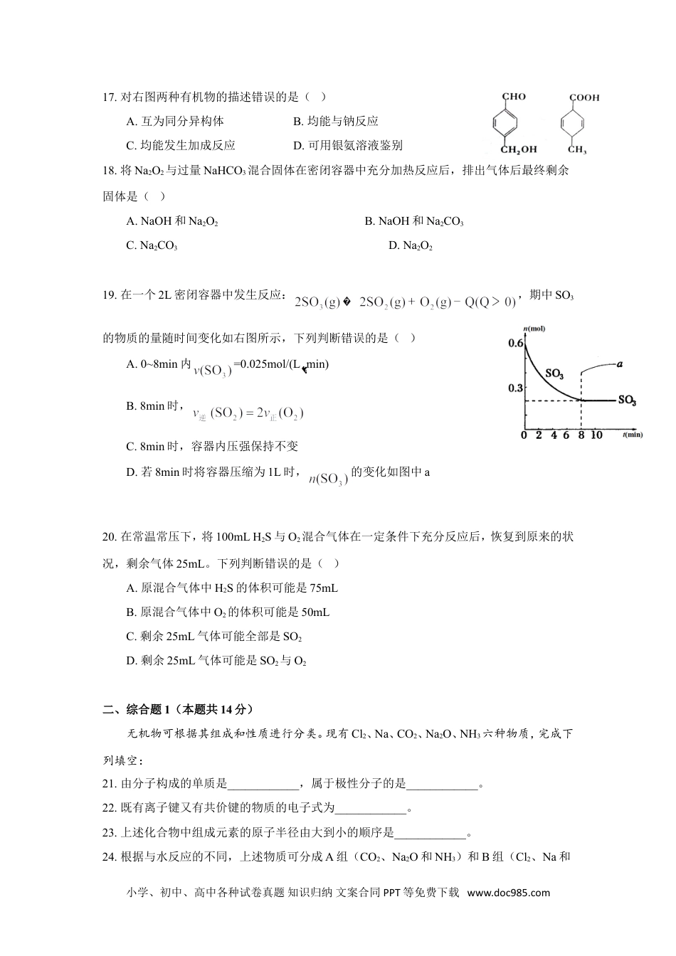 静安区2016~2017学年第二学期教学质量检测高三化学试卷2017.04考生注意:1.本试卷满分100分,考试时间60分钟。2.本考试设试卷和答题纸两部分,试卷包括试题与答题要求;所有答题必须涂(选择题)或写(非选择题)在答题纸上;做在试卷上一律不得分。3.答题前,考生务必在答题纸上用钢笔或圆珠笔清楚填写学校、班级、姓名、准考证号。4.答题纸与试卷在试题编号上是一一对应的,答题时应特别注意,不能错位。相对原子质量:H-1O-16一、选择题(本题共40分,每小题2分,每题只有一个正确选项)1.大规模开发利用铁、铜、铝,由早到晚的时间顺序是()A.铜、铁、铝B.铁、铝、铜C.铝、铜、铁D.铁、铜、铝2.下列物质中,常用于治疗胃酸过多的是()A.碳酸钠B.氢氧化铝C.氧化钙D.硫酸镁3.YBa2Cu3Ox(Y为元素钇)是一种重要超导材料,下列关于的说法错误的是()A.质量数是89B.质子数与中子数之差为50C.核外电子数是39D.与互为同位素4.下列属于原子晶体的化合物是()A.干冰B.晶体硅C.金刚石D.碳化硅5.可用碱石灰干燥的气体是()A.H2SB.Cl2C.NH3D.SO26.常温下0.1mol/LNH4Cl溶液的pH最接近于()A.1B.5C.7D.137.下列过程不涉及氧化还原反应的是()A.大气固氮B.工业制漂粉精C.用SO2漂白纸浆D.天空一号中用Na2O2供氧8.互为同系物的物质不具有()A.相同的相对分子质量B.相同的通式小学、初中、高中各种试卷真题知识归纳文案合同PPT等免费下载www.doc985.comC.相似的化学性质D.相似的结构9.下列物质中导电能力最差的是()A.熔融态KHSO4B.铜片C.0.1mol/LH2SO4D.固态KCl10.下列转化过程不可能通过一步反应实现的是()A.B.C.D.11.下列仪器洗涤时选用试剂错误的是()A.木炭还原氧化铜的硬质玻璃管(盐酸)B.碘升华实验的试管(酒精)C.长期存放氯化铁溶液的试剂瓶(稀硫酸)D.沾有油污的烧杯(纯碱溶液)12.除去FeCl2溶液中的FeCl3所需试剂是()A.Cl2B.CuC.FeD.NaOH13.氢硫酸中加入或通入少量下列物质,溶液酸性增强的是()A.O2B.Cl2C.SO2D.NaOH14.已知+571.6kJ。下列说法错误的是()A.2mol液态水完全分解成氢气与氧气,需吸收571.6kJ热量B.2mol氢气与1mol氧气的总能量大于2mol液态水的总能量C.2g氢气与16g氧气完全反应生成18g液态水放出285.8kJ热量D.2mol氢气与1mol氧气完全反应生成水蒸气放出的热量大于571.6kJ15.不能用元素周期律解释的是()A.氯与钠形成离子键,氯与硅形成共价键B.向淀粉KI溶液中滴加溴水,溶液变蓝C.向Na2SO3溶液中滴加盐酸,有气泡生成D.F2在暗处遇H2即爆炸,I2在暗处遇H2几乎不反应16.用滴有酚酞和氯化钠溶液湿润的滤纸分别做甲、乙两个实验,下列判断错误的是()A.b极附近有气泡冒出B.d极附近出现红色C.a、c极上都发生氧化反应D.甲中铁棒比乙中铁棒更易腐蚀小学、初中、高中各种试卷真题知识归纳文案合同PPT等免费下载www.doc985.com17.对右图两种有机物的描述错误的是()A.互为同分异构体B.均能与钠反应C.均能发生加成反应D.可用银氨溶液鉴别18.将Na2O2与过量NaHCO3混合固体在密闭容器中充分加热反应后,排出气体后最终剩余固体是()A.NaOH和Na2O2B.NaOH和Na2CO3C.Na2CO3D.Na2O219.在一个2L密闭容器中发生反应:,期中SO3的物质的量随时间变化如右图所示,下列判断错误的是()A.0~8min内=0.025mol/(Lmin)B.8min时,C.8min时,容器内压强保持不变D.若8min时将容器压缩为1L时,的变化如图中a20.在常温常压下,将100mLH2S与O2混合气体在一定条件下充分反应后,恢复到原来的状况,剩余气体25mL。下列判断错误的是()A.原混合气体中H2S的体积可能是75mLB.原混合气体中O2的体积可能是50mLC.剩余25mL气体可能全部是SO2D.剩余25mL气体可能是SO2与O2二、综合题1(本题共14分)无机物可根据其组成和性质进行分类。现有Cl2、Na、CO2、Na2O、NH3六种物质,完成下列填空:21.由分子构成的单质是____________,属于极性分子的是____________。22.既有离子键又有共价键的物质的电子式为____________。23.上述化合物中组成元素的原子半径由大到小的顺序是____________。24.根据与水反应的不同,上述物质可分成A组(CO2、Na2O和NH3)和B组(Cl2、Na和小学、初中、高中各种...