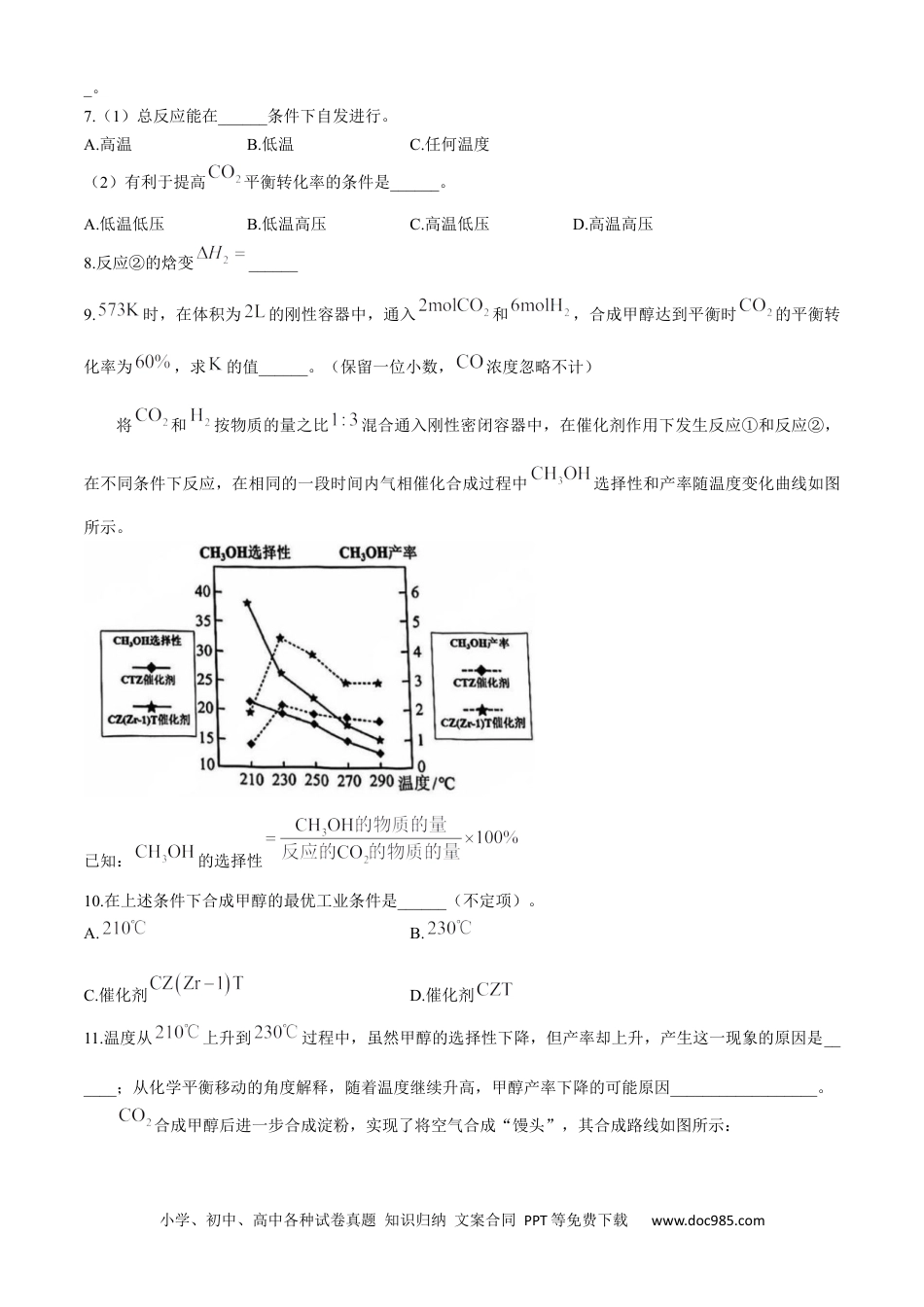 小学、初中、高中各种试卷真题知识归纳文案合同PPT等免费下载www.doc985.com2024学年第一学期奉贤区高三化学练习卷考生注意:1.试卷满分100分,考试时间60分钟。2.本考试分设试卷和答题纸。答题前,务必在答题纸上填写学校、姓名、考号,将条形码贴在指定位置。答题时,必须将答案涂或写在答题纸上,在试卷上答题一律不得分。3.选择类试题中,标注“不定项”的试题,每小题有1~2个正确选项,未特别标注的试题,每小题只有1个正确选项。相对原子质量:C-12N-14K-39Fe-56Cu-64一、多姿多彩的过渡金属过渡金属因具有良好理化特性,在国防、军事、科技、工农业生产等众多领域都有很重要的用途。回答下列问题:1.过渡金属处于元素周期表的______区。金属铜在周期表中的位置是______,基态铜原子的价电子所占轨道数为____________。2.古埃及人很早就开始利用含钴矿石制作颜料。是一种黄色颜料,中心离子是______,其配位数是______,其配体的模型为______。利用丁二酮肟与镍离子形成有色络合物(丁二酮肟镍,结构如图所示),可在实验室中检验。3.该化合物中第二周期非金属元素按第一电离能由小到大的顺序为______。4.下列有关说法正确的是()(不定项)A.该物质的分子内存在共价键、配位键、氢键等化学键B.该物质是一种配合物,其中离子为中心离子C.该物质的分子中、、原子均存在孤电子对D.该物质的分子中原子的杂化类型有、2种小学、初中、高中各种试卷真题知识归纳文案合同PPT等免费下载www.doc985.com5.某含的晶体晶胞结构如图所示。该晶胞中负离子为(部分示例位置已用箭头标出),连接着每一对相邻的与。已知该晶胞棱长为,为阿伏加德罗常数的值。(1)该晶胞中距最近且等距的有______个。(2)该晶体的化学式为______,晶体密度为______(列出代数式)。二、从“液体阳光”工程到空气合成“馒头”“液体阳光”工程是指通过太阳能、风能产生的电力电解水制得绿氢,再将绿氢与转化为等液体燃料的过程,可推动碳中和。反应可以通过以下步骤实现,反应能量变化如图所示。反应①:反应②:已知总反应:请回答:6.在相同条件下,反应①与反应②相比是______(填“快”“慢”)反应,简述理由:_________________小学、初中、高中各种试卷真题知识归纳文案合同PPT等免费下载www.doc985.com_。7.(1)总反应能在______条件下自发进行。A.高温B.低温C.任何温度(2)有利于提高平衡转化率的条件是______。A.低温低压B.低温高压C.高温低压D.高温高压8.反应②的焓变______9.时,在体积为的刚性容器中,通入和,合成甲醇达到平衡时的平衡转化率为,求的值______。(保留一位小数,浓度忽略不计)将和按物质的量之比混合通入刚性密闭容器中,在催化剂作用下发生反应①和反应②,在不同条件下反应,在相同的一段时间内气相催化合成过程中选择性和产率随温度变化曲线如图所示。已知:的选择性10.在上述条件下合成甲醇的最优工业条件是______(不定项)。A.B.C.催化剂D.催化剂11.温度从上升到过程中,虽然甲醇的选择性下降,但产率却上升,产生这一现象的原因是______;从化学平衡移动的角度解释,随着温度继续升高,甲醇产率下降的可能原因__________________。合成甲醇后进一步合成淀粉,实现了将空气合成“馒头”,其合成路线如图所示:小学、初中、高中各种试卷真题知识归纳文案合同PPT等免费下载www.doc985.com12.某化学兴趣小组将合成后的淀粉进行水解实验,同时检验水解是否完全和水解产物,除加入淀粉和水之外,还需加入的试剂及加入顺序最好是()A.碘水溶液→新制B.溶液溶液→碘水→新制C.溶液→碘水溶液→新制D.溶液→碘水→新制13.自然界中玉米合成淀粉的效率为。以为原料人工合成淀粉,为1个周期,每克催化剂能生产淀粉。该方法生产淀粉的效率是玉米的______倍(保留1位小数)。三、紫外光响应聚合物的制备邻硝基苯甲酯是一种在紫外光照射下,自发发生断裂的有机结构,其作为一种光响应官能团在功能聚合物的研究中具有广泛使用,其断裂反应可表示为:现根据需求,设计一种可用于具有反应活性的紫外光响应功能高分子,其合成路线如下:小学、初中、高中各种试卷真题知识归纳文案合同PP...