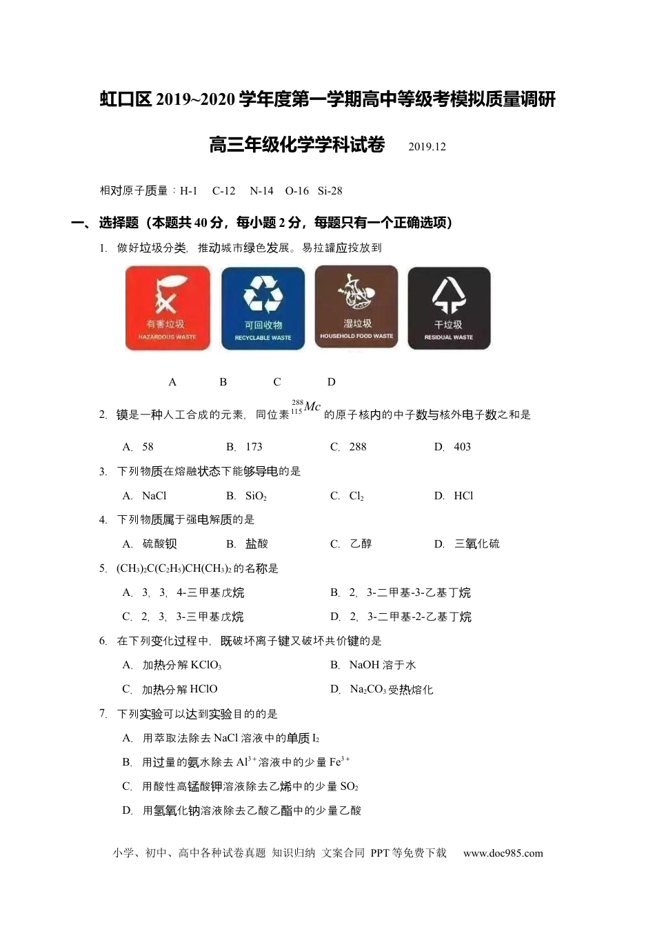 小学、初中、高中各种试卷真题知识归纳文案合同PPT等免费下载www.doc985.com虹口区2019~2020学年度第一学期高中等级考模拟质量调研高三年级化学学科试卷2019.12相原子量:对质H-1C-12N-14O-16Si-28一、选择题(本题共40分,每小题2分,每题只有一个正确选项)1.做好圾分,推城市色展。易拉罐垃类动绿发应投放到ABCD2.是一人工合成的元素,同位素镆种Mc288115的原子核的中子核外子之和是内数与电数A.58B.173C.288D.4033.下列物在熔融下能的是质状态够导电A.NaClB.SiO2C.Cl2D.HCl4.下列物于强解的是质属电质A.硫酸钡B.酸盐C.乙醇D.三化硫氧5.(CH3)2C(C2H5)CH(CH3)2的名是称A.3,3,4-三甲基戊烷B.2,3-二甲基-3-乙基丁烷C.2,3,3-三甲基戊烷D.2,3-二甲基-2-乙基丁烷6.在下列化程中,破坏离子又破坏共价的是变过既键键A.加分解热KClO3B.NaOH溶于水C.加分解热HClOD.Na2CO3受熔化热7.下列可以到目的的是实验达实验A.用萃取法除去NaCl溶液中的单质I2B.用量的水除去过氨Al3+溶液中的少量Fe3+C.用酸性高酸溶液除去乙中的少量锰钾烯SO2D.用化溶液除去乙酸乙中的少量乙酸氢氧钠酯小学、初中、高中各种试卷真题知识归纳文案合同PPT等免费下载www.doc985.com8.反应8NH3+3Cl2→N2+6NH4Cl的相描述中正确的是关A.N2的子式是电B.反物和生成物的化型相同应学键类C.每生成11.2LN2,移子转电数为3NAD.原原物的物的量之比是还剂与还产质1∶39.于化合物木糖醇(关),下列法正确的是说A.不能生化反发氧应B.所有原子在同一平面上碳C.丙三醇互同系物与为D.木糖醇分子式为C5H12O510.常下温0.1mol/L的下列物的水溶液,加到质热80℃,溶液的pH几乎不的是变A.硫酸B.化氢氧钾C.化氯钠D.硫酸铵11.将SO2体通入气KIO3淀粉溶液,溶液先后褪色。此程中变蓝过SO2表出现A.漂白性B.化性和漂白性氧C.原性还D.原性和漂白性还12.短周期元素W、X、Y、Z在元素周期表中的位置如下所示,元素图Y位于金元素属与非金元素交界,下列法的是属处说错误A.Y的原子半一定最大径B.X的化物最定气态氢稳C.Y的化物熔点一定高于氧Z的化物氧D.Z的最高价化物水化物酸性一定最强氧对应13.合成反程中的能量化如右所示,下列法正确的是氨应过变图说A.NH3的能量低,比较N2、H2更定稳B.2NH3(g)→2N(g)+6H(g)-2346kJC.N2(g)+3H2(g)2NH3(g)-92kJD.加入催化,可以小反的效剂减应热应14.设NA阿伏加德常的。下列法正确的是为罗数值说A.78g含有苯C=C的目双键数为3NAB.1L1mol/L的NaClO溶液中含有ClO-的目数为NAC.准下,标状况6.72L水充分反移的子目氯气与应转电数为0.3NAWXYZ小学、初中、高中各种试卷真题知识归纳文案合同PPT等免费下载www.doc985.comD.常常下,温压14g由N2与CO成的混合体含有的原子目组气数为NA15.在具支管中加入试粉和活性炭的混合物,铁然后注入少量稀酸,立即塞上橡塞盐胶组成如所示装置。下列有法图关说错误的是A.一定生析腐铁发氢蚀B.可能生吸腐铁会发氧蚀C.若改用NaOH溶液,腐不再生蚀发D.若改用食水,一段后管液面高于管外盐时间导气内导16.在M、N中加入,用示装置制取、收集少量体,其中最合理的是试剂并图气ABCDM酸浓盐水浓氨稀酸盐硫酸浓N硫酸浓石灰碱酸碳钙片铜17.往NH4Al(SO4)2溶液中逐滴加入Ba(OH)2溶液,当SO42-恰好完全沉淀,溶液中其时它微粒存在的形式是A.NH4+、AlO2-B.NH3·H2O、Al(OH)3C.NH4+、Al(OH)3D.NH3·H2O、AlO2-18.已知原性还I—>Fe2+>Br—,在只含有I—、Fe2+、Br—溶液中通入一定量的,于氯气关所得溶液离子成分分析正确的是(不考虑Br2、I2和水的反)应A.I-、Fe3+、Cl-B.Fe2+、Cl-、Br-C.Fe2+、Fe3+、Cl-D.Fe2+、I-、Cl-19.已知常下温CH3COONa溶液与CH3COONH4溶液中c(CH3COO-)相等,下列述正则叙确的是A.c(Na+)=c(NH4+)B.溶液中水的离程度相等两种电C.溶液的两种pH相等D.c(CH3COONa)<c(CH3COONH4)20.某度下,在密容器中生可逆反的平衡常温闭发应数K=)()()(32BcAcCc。反到平衡当应达,时n(A)∶n(B)∶n(C)=2∶2∶1。若保持度不,以温变2∶2∶1的物的量之比再充质入A、B、C,则A.K...