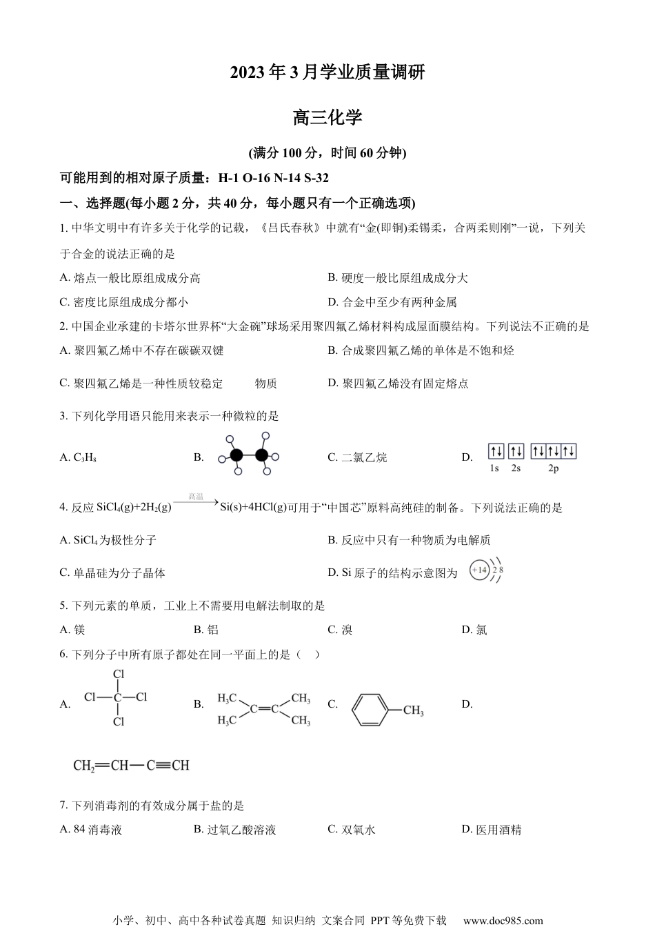 小学、初中、高中各种试卷真题知识归纳文案合同PPT等免费下载www.doc985.com2023年3月学业质量调研高三化学(满分100分,时间60分钟)可能用到的相对原子质量:H-1O-16N-14S-32一、选择题(每小题2分,共40分,每小题只有一个正确选项)1.中华文明中有许多关于化学的记载,《吕氏春秋》中就有“金(即铜)柔锡柔,合两柔则刚”一说,下列关于合金的说法正确的是A.熔点一般比原组成成分高B.硬度一般比原组成成分大C.密度比原组成成分都小D.合金中至少有两种金属2.中国企业承建的卡塔尔世界杯“大金碗”球场采用聚四氟乙烯材料构成屋面膜结构。下列说法不正确的是A.聚四氟乙烯中不存在碳碳双键B.合成聚四氟乙烯的单体是不饱和烃C.聚四氟乙烯是一种性质较稳定的物质D.聚四氟乙烯没有固定熔点3.下列化学用语只能用来表示一种微粒的是A.C3H8B.C.二氯乙烷D.4.反应SiCl4(g)+2H2(g)Si(s)+4HCl(g)可用于“中国芯”原料高纯硅的制备。下列说法正确的是A.SiCl4为极性分子B.反应中只有一种物质为电解质C.单晶硅为分子晶体D.Si原子的结构示意图为5.下列元素的单质,工业上不需要用电解法制取的是A.镁B.铝C.溴D.氯6.下列分子中所有原子都处在同一平面上的是()A.B.C.D.7.下列消毒剂的有效成分属于盐的是A.84消毒液B.过氧乙酸溶液C.双氧水D.医用酒精小学、初中、高中各种试卷真题知识归纳文案合同PPT等免费下载www.doc985.com8.下列变化需克服共价键的是A.金刚石熔化B.汞变成汞蒸气C.碘升华D.食盐溶于水9.下列判断正确的是A.稳定性:H2S>H2OB.熔点:Na>MgC.碱性:NaOH>Mg(OH)2D.酸性:HF>HCl10.下列试剂不能用来鉴别SO2和H2S的是A.新制氯水B.品红溶液C.氢氧化钠溶液D.硫酸铜溶液11.下列物质分离(括号内为杂质)的方法错误的是A.溴苯(溴):KI溶液,分液B.乙烯(二氧化硫):氢氧化钠溶液,洗气C.硝基苯(苯):蒸馏D.乙酸乙酯(乙醇):饱和碳酸钠溶液,分液12.工业上可用铝热反应冶炼锰、钒等金属,其原因与下列无关的是A.铝还原性较强B.铝能形成多种合金C.锰、钒熔点高D.反应放出大量热13.在的含有、、三种阳离子的溶液中,可能存在的阴离子是()①②③④A.①②B.②③C.③④D.①③14.反应A(g)+B(g)→C(g)-Q1(Q1>0)分两步进行:①A(g)+B(g)→X(g)+Q2(Q2>0);②X(g)→C(g)-Q3(Q3>0)。下列图中,能正确表示总反应过程中能量变化的是A.B.C.D.小学、初中、高中各种试卷真题知识归纳文案合同PPT等免费下载www.doc985.com15.2022年7月,我国首款治疗新冠肺炎的口服药阿兹夫定片获准上市,其有效成分结构如图,下列说法不正确的是A.羟基的电子式为B.非金属性C.该有机物可以发生氧化反应D.1摩尔该物质与足量的钠反应可产生2摩尔氢气16.用如图示的方法可以保护钢质闸门。下列说法正确的是A.当a、b间用导线连接时,X可以是锌棒,X上发生氧化反应B.当a、b间用导线连接时,X可以是锌棒,电子经导线流入XC.当a、b与外接电源相连时,a应连接电源的正极D.当a、b与外接电源相连时,阴极的电极反应式:2Cl--2e-=Cl2↑17.如图是实验室模拟硫酸工业中合成的反应装置,以下说法中错误的是A.装置甲的作用是混合气体、干燥等B.乙处导出的气体主要含有、、C.反应生成的不宜直接通入水中吸收D.工业中用高压提高的产率18.关于下列工业生产,说法不正确的是A.氯碱工业:阳极产生Cl2,NaOH在阴极附近产生小学、初中、高中各种试卷真题知识归纳文案合同PPT等免费下载www.doc985.comB.硫酸工业:在吸收塔中安装热交换器,实现能量的充分利用C.合成氨工业:利用氢气和氮气的循环来提高原料气的转化率D.纯碱工业:侯氏制碱法在分离出NaHCO3后的母液中加入食盐,促进NH4Cl结晶19.密闭真空容器中放入BaO2固体,发生反应2BaO2(s)2BaO(s)+O2(g)△H<0,并达到平衡状态Ⅰ;保持温度不变,缩小容器体积,达到平衡状态Ⅱ;平衡状态Ⅰ与Ⅱ不同的是A.平衡常数B.反应速率C.氧气浓度D.BaO的量20.室温下,在10mL浓度均为0.1mol/L的醋酸和盐酸混合液中,滴加0.1mol/L的NaOH溶液VmL,则下列关系正确的是A.V=0时:B.V=10mL时:C.V=20mL时:D.加入NaOH溶液至pH=7时,mL二、综合题(共60分)21.I.硫元素是动植物生长不可缺少的元素,广泛存在于自然界中。(1)从...