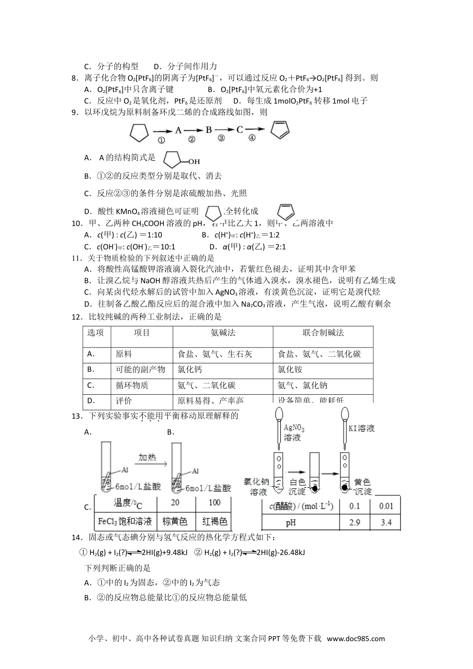 普陀区2015~2016学年第二学期教学质量检测高三化学试卷2016.04考生注意:1.本试卷满分100分,考试时间60分钟。2.本考试设试卷和答题纸两部分,试卷包括试题与答题要求;所有答题必须涂(选择题)或写(非选择题)在答题纸上;做在试卷上一律不得分。3.答题前,考生务必在答题纸上用钢笔或圆珠笔清楚填写学校、班级、姓名、准考证号。4.答题纸与试卷在试题编号上是一一对应的,答题时应特别注意,不能错位。相对原子质量:H-1C-12O-16Na-23Al-27S-32Cl-35.5Fe-56Cu-64一、选择题(本题共10分,每小题2分,每题只有一个正确选项)1.人类已经成功合成了117号元素Uus,关于的叙述正确的是A.原子内电子数多于中子数B.与电子式相同C.元素的近似相对原子质量是294D.处于不完全周期内2.正确使用化学用语是学好化学的基础,下列化学用语正确的是A.的名称:1,4-二甲苯B.丙烷的分子式:CH3CH2CH3C.聚丙烯的链节:—CH2-CH2-CH2—D.H2S的电子式:3.化学在科学、技术、社会、环境中应用广泛,其中原理错误的是A.利用乙二醇的物理性质作内燃机抗冻剂B.煤经过气化和液化两个物理变化,可变为清洁能源C.采用光触媒技术可将汽车尾气中的NO和CO转化为无毒气体D.苦卤经过浓缩、氧化、鼓入热空气或水蒸气,可获得溴4.根据元素在周期表中的位置可以预测A.分解温度:CH4>H2SB.氧化性:NaClO>Na2SO3C.同浓度溶液pH:Na2SiO3>Na2CO3D.金属性:Ca>Na5.分类是重要的科学研究方法,下列物质分类正确的是A.酸性氧化物:SO2、SiO2、NO2B.弱电解质:CH3COOH、BaCO3、Fe(OH)3C.纯净物:铝热剂、漂粉精、聚乙烯D.无机物:CaC2、石墨烯、HCN二、选择题(本题共36分,每小题3分,每题只有一个正确选项)6.能够产生如右图实验现象的液体是A.CS2B.CCl4C.H2OD.7.当冰醋酸固体变成液体或气体时,一定发生变化的是A.分子内化学键B.共价键键能小学、初中、高中各种试卷真题知识归纳文案合同PPT等免费下载www.doc985.com玻璃棒靠近液流带电实验C.分子的构型D.分子间作用力8.离子化合物O2[PtF6]的阴离子为[PtF6]-,可以通过反应O2+PtF6→O2[PtF6]得到。则A.O2[PtF6]中只含离子键B.O2[PtF6]中氧元素化合价为+1C.反应中O2是氧化剂,PtF6是还原剂D.每生成1molO2PtF6转移1mol电子9.以环戊烷为原料制备环戊二烯的合成路线如图,则A.A的结构简式是B.①②的反应类型分别是取代、消去C.反应②③的条件分别是浓硫酸加热、光照D.酸性KMnO4溶液褪色可证明已完全转化成10.甲、乙两种CH3COOH溶液的pH,若甲比乙大1,则甲、乙两溶液中A.c(甲):c(乙)=1:10B.c(H+)甲:c(H+)乙=1:2C.c(OH-)甲:c(OH-)乙=10:1D.α(甲):α(乙)=2:111.关于物质检验的下列叙述中正确的是A.将酸性高锰酸钾溶液滴入裂化汽油中,若紫红色褪去,证明其中含甲苯B.让溴乙烷与NaOH醇溶液共热后产生的气体通入溴水,溴水褪色,说明有乙烯生成C.向某卤代烃水解后的试管中加入AgNO3溶液,有淡黄色沉淀,证明它是溴代烃D.往制备乙酸乙酯反应后的混合液中加入Na2CO3溶液,产生气泡,说明乙酸有剩余12.比较纯碱的两种工业制法,正确的是选项项目氨碱法联合制碱法A.原料食盐、氨气、生石灰食盐、氨气、二氧化碳B.可能的副产物氯化钙氯化铵C.循环物质氨气、二氧化碳氨气、氯化钠D.评价原料易得、产率高设备简单、能耗低13.下列实验事实不能用平衡移动原理解释的是A.B.C.D.14.固态或气态碘分别与氢气反应的热化学方程式如下:①H2(g)+I2(?)2HI(g)+9.48kJ②H2(g)+I2(?)2HI(g)-26.48kJ下列判断正确的是A.①中的I2为固态,②中的I2为气态B.②的反应物总能量比①的反应物总能量低小学、初中、高中各种试卷真题知识归纳文案合同PPT等免费下载www.doc985.comC.反应①的产物比反应②的产物热稳定性更好D.1mol固态碘升华时将吸热17kJ15.某溶液中有S2-、SO32-、Br-、I-四种阴离子各0.1mol。现通入Cl2,则通入Cl2的体积(标准状况)和溶液中相关离子的物质的量的关系图正确的是A.B.C.D.16.无法实现的反应是A.酸和酸反应生成酸B.只有氧化剂的氧化还原反应C.盐和盐反应生成碱D.一种碱通过化合反应...